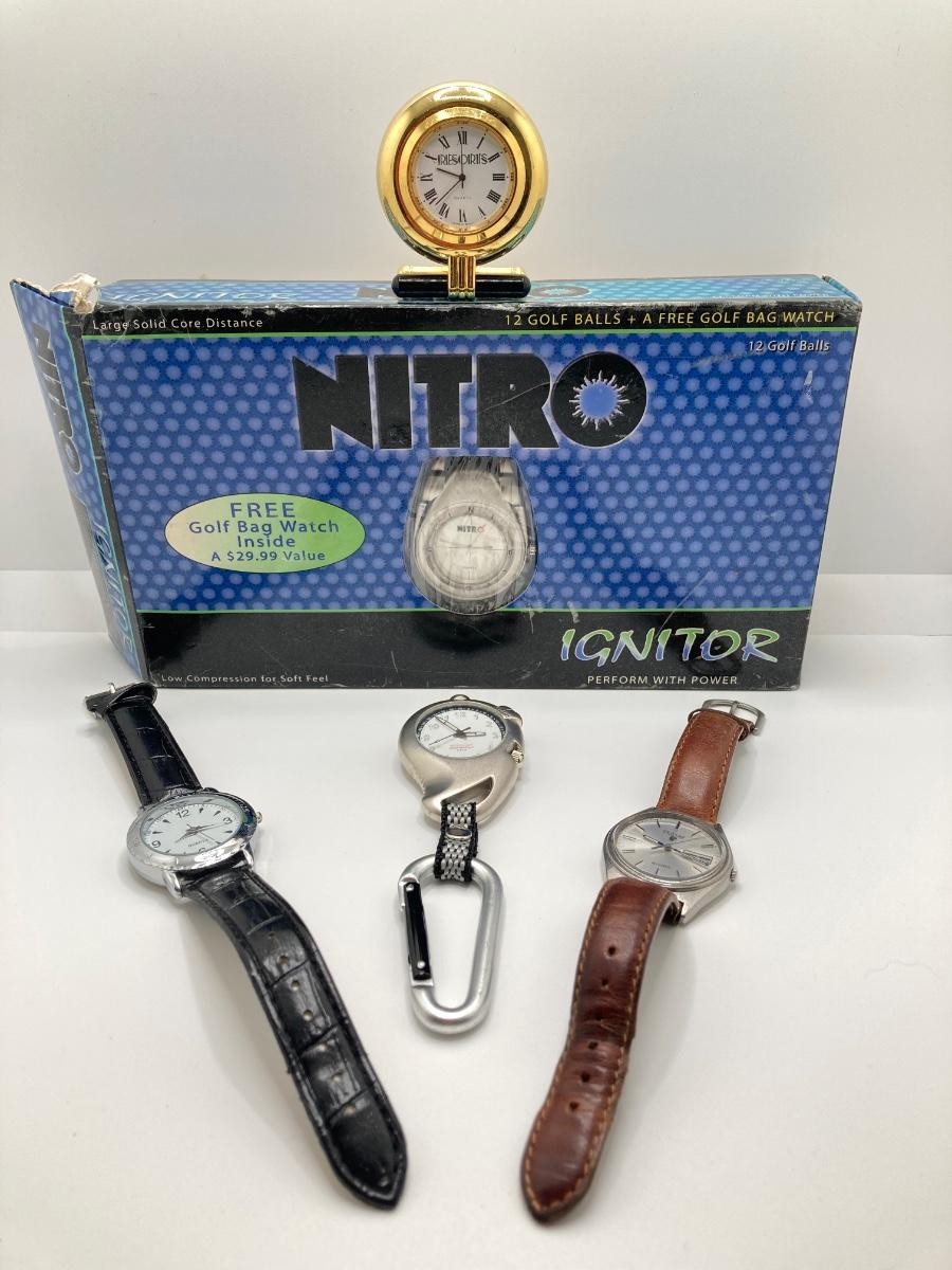 LOT 214: Nitro Ignitor Golf Ball / Watch Set, Pulsar and Quartz Watches, Resorts Desk Clock and More