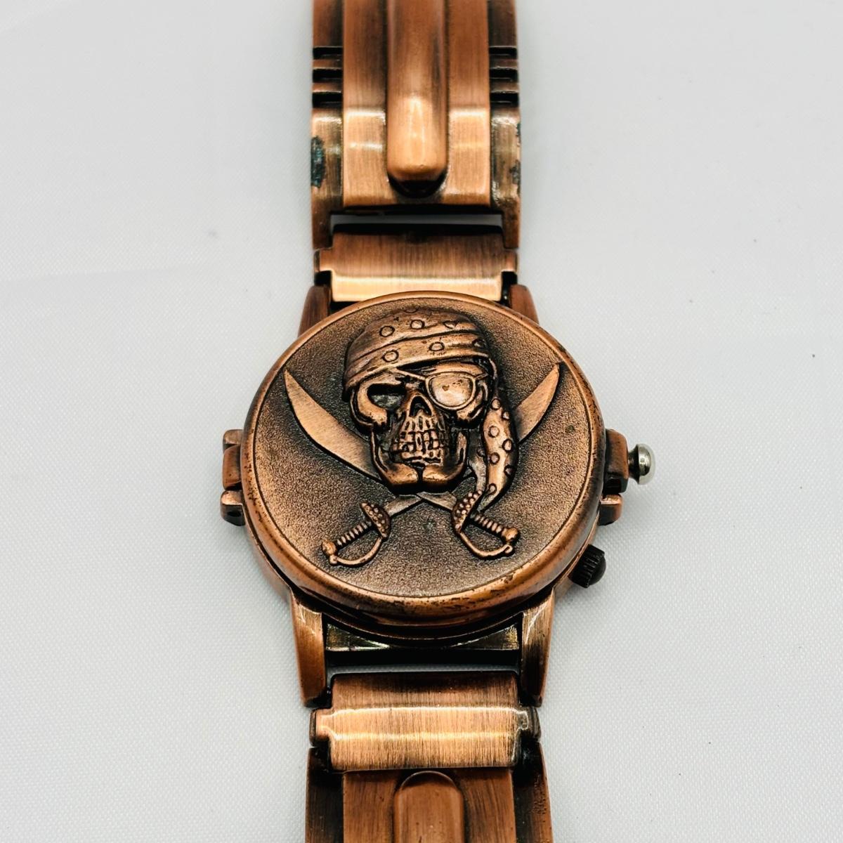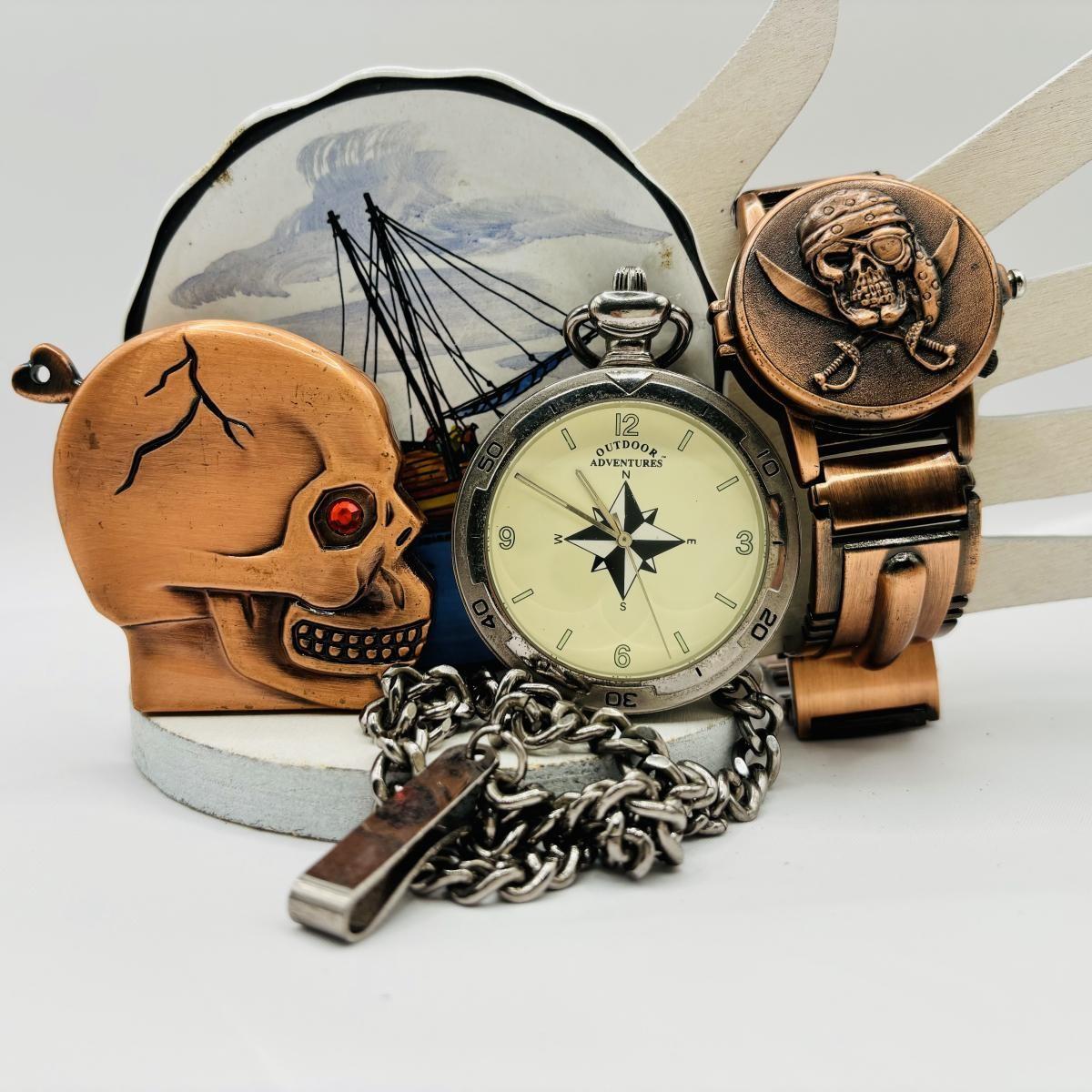 LOT 244: Field & Stream Pocketwatch & Aveiro Portugal Porcelain Plate w/ Pirate Watch and Skull Themed Lighter