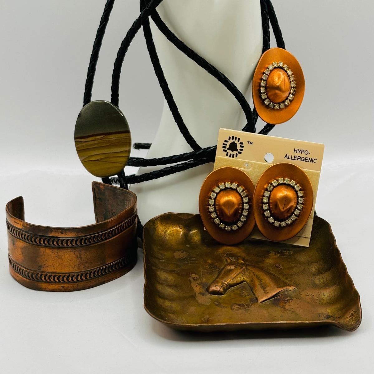 LOT 249: Copper Collection- Trinket Tray, Earrings, Bolo & More