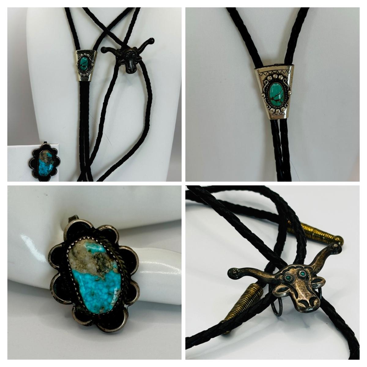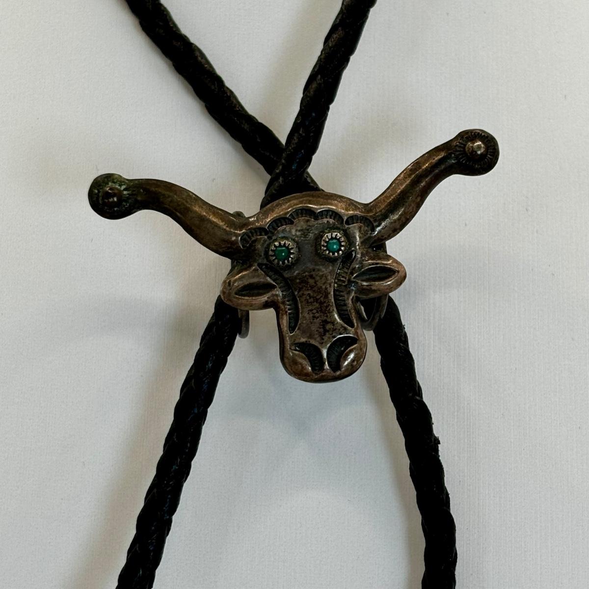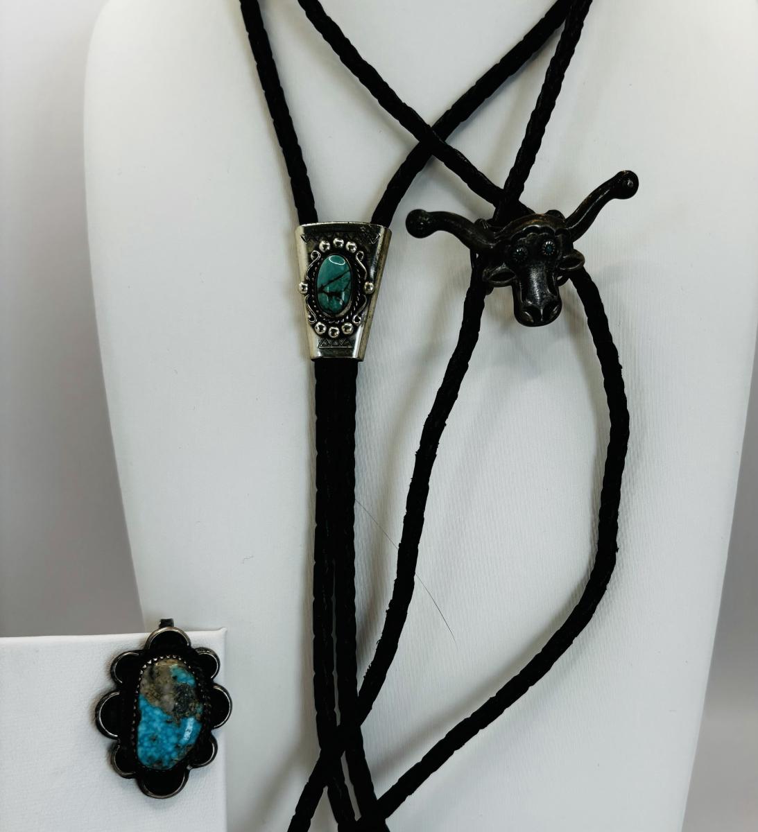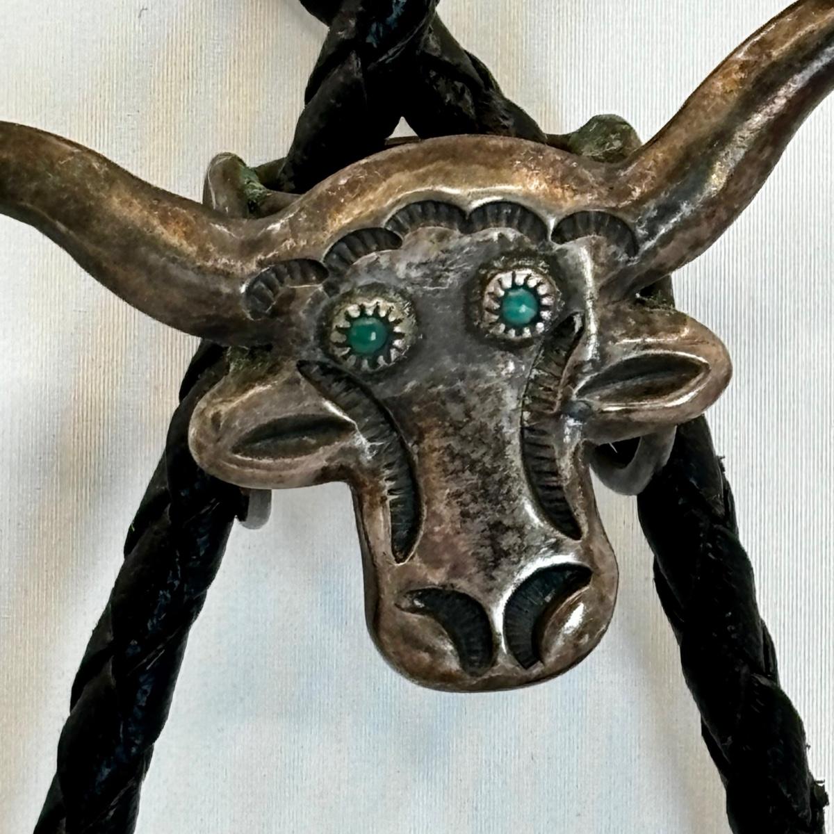 LOT 253: Sterling Silver & Turquoise Stone Bolo Tie w/ Turquoise Stone Pendant & Steer-Themed Bolo