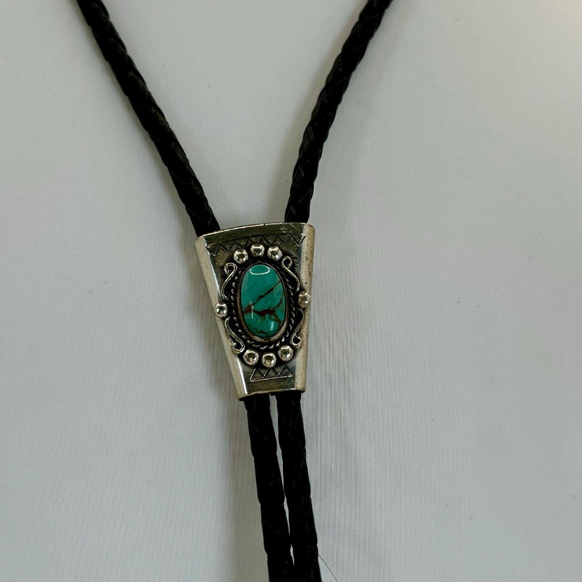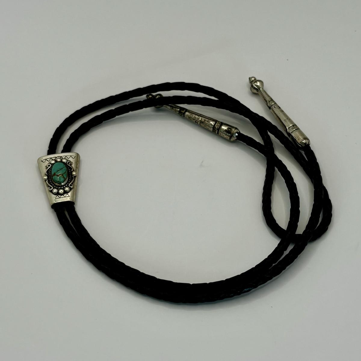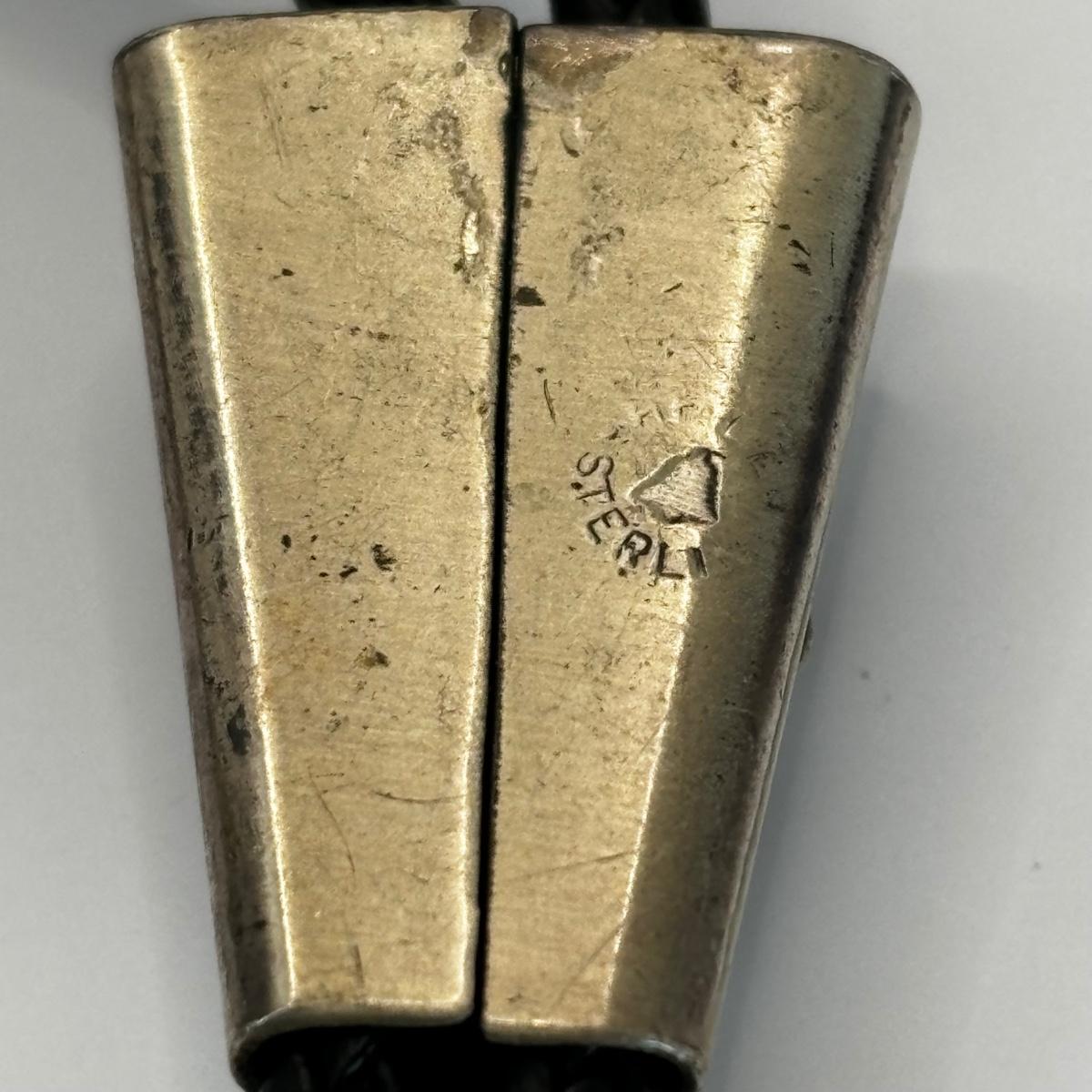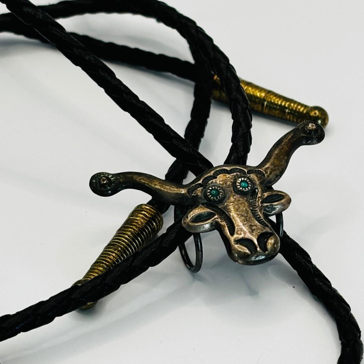 LOT 253: Sterling Silver & Turquoise Stone Bolo Tie w/ Turquoise Stone Pendant & Steer-Themed Bolo