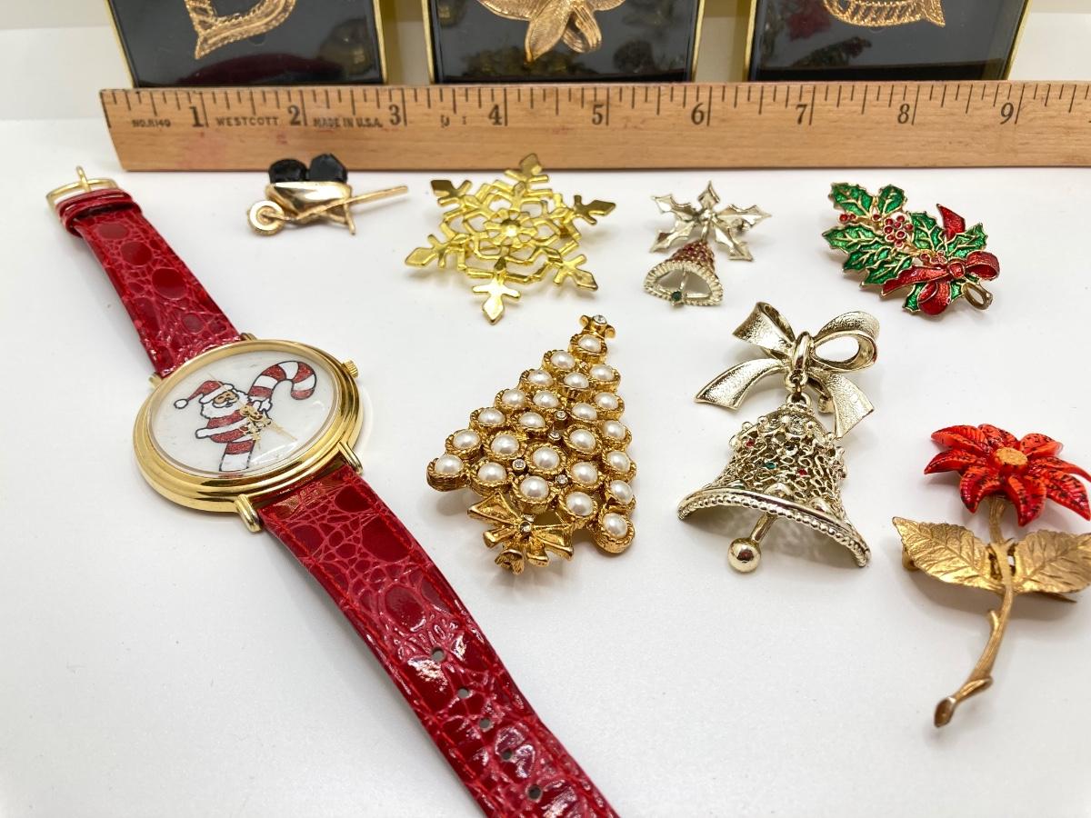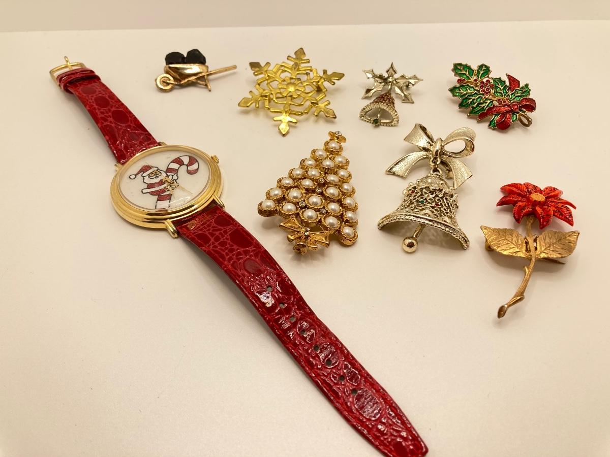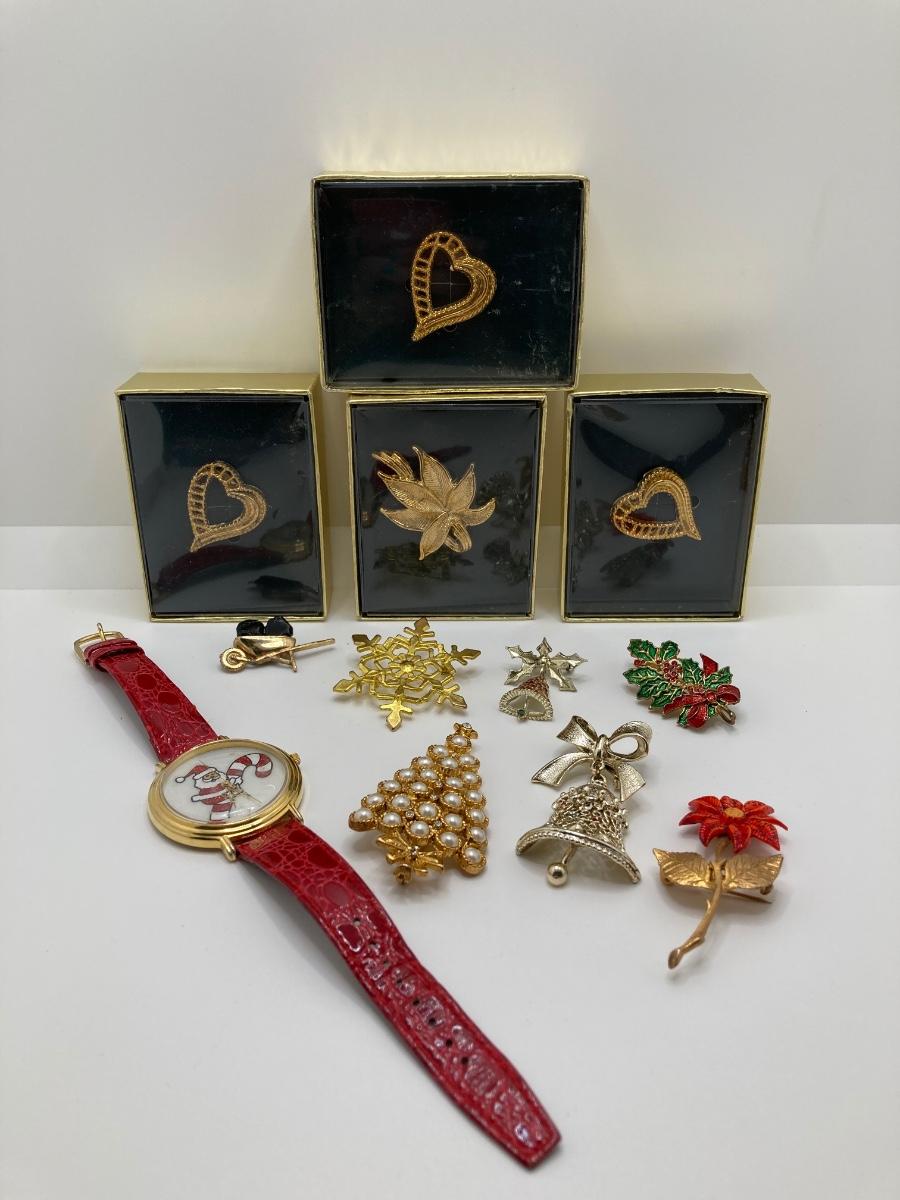 LOT 276: Santa Watch w/ Collection of Gold-Tone Brooches & More
