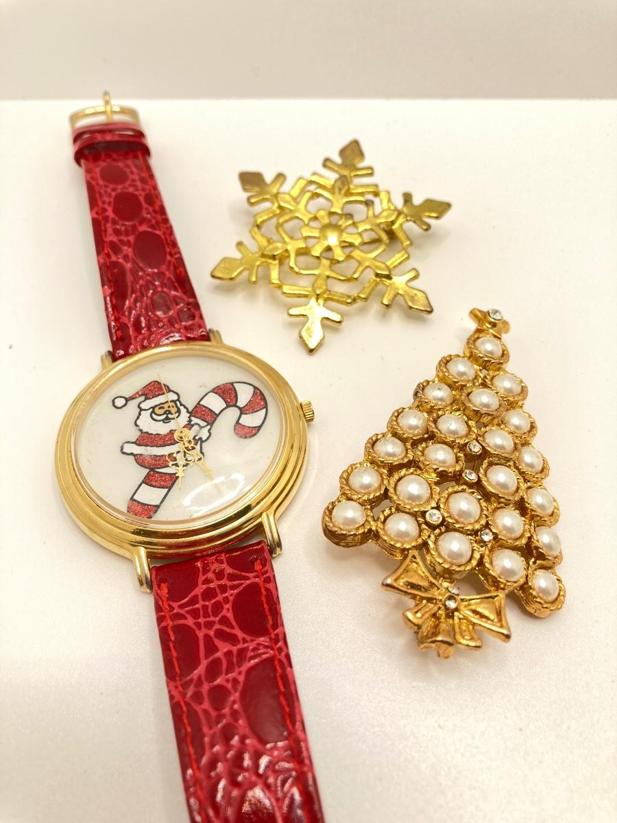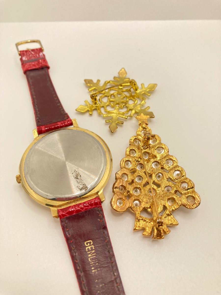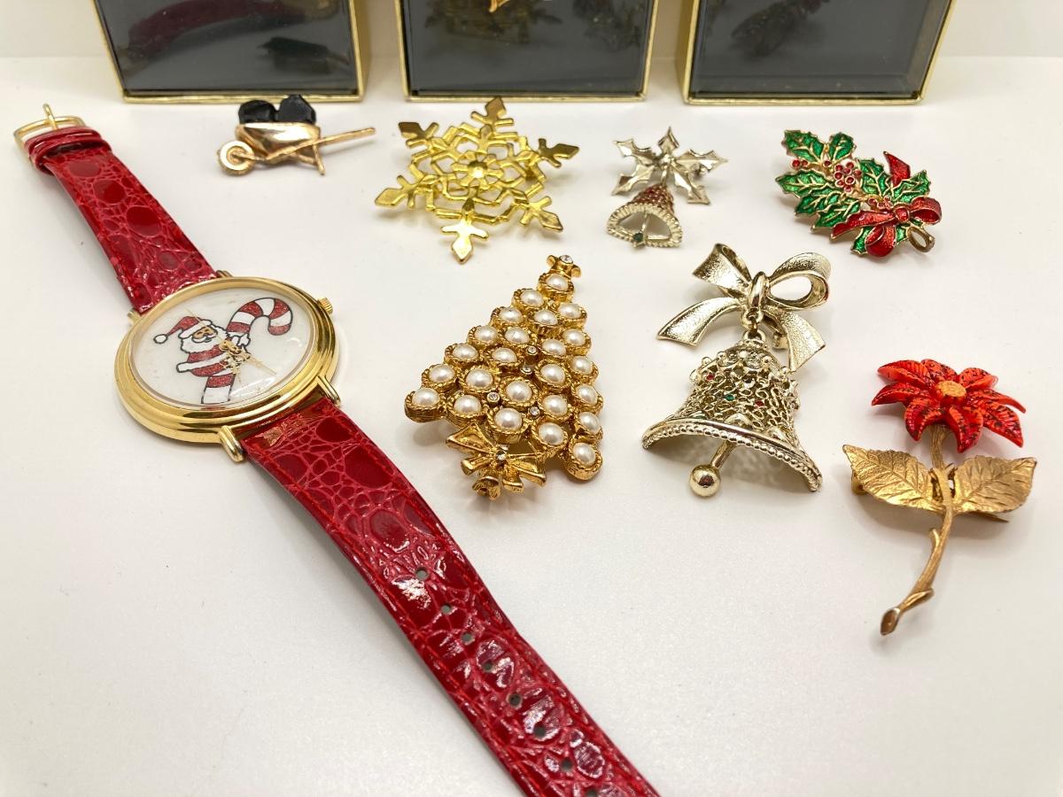 LOT 276: Santa Watch w/ Collection of Gold-Tone Brooches & More