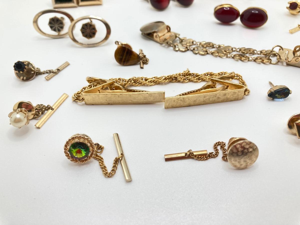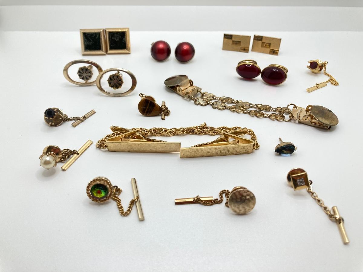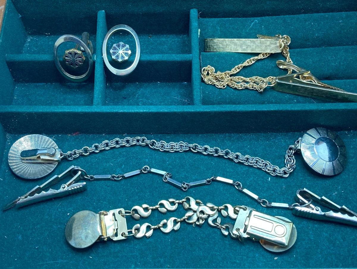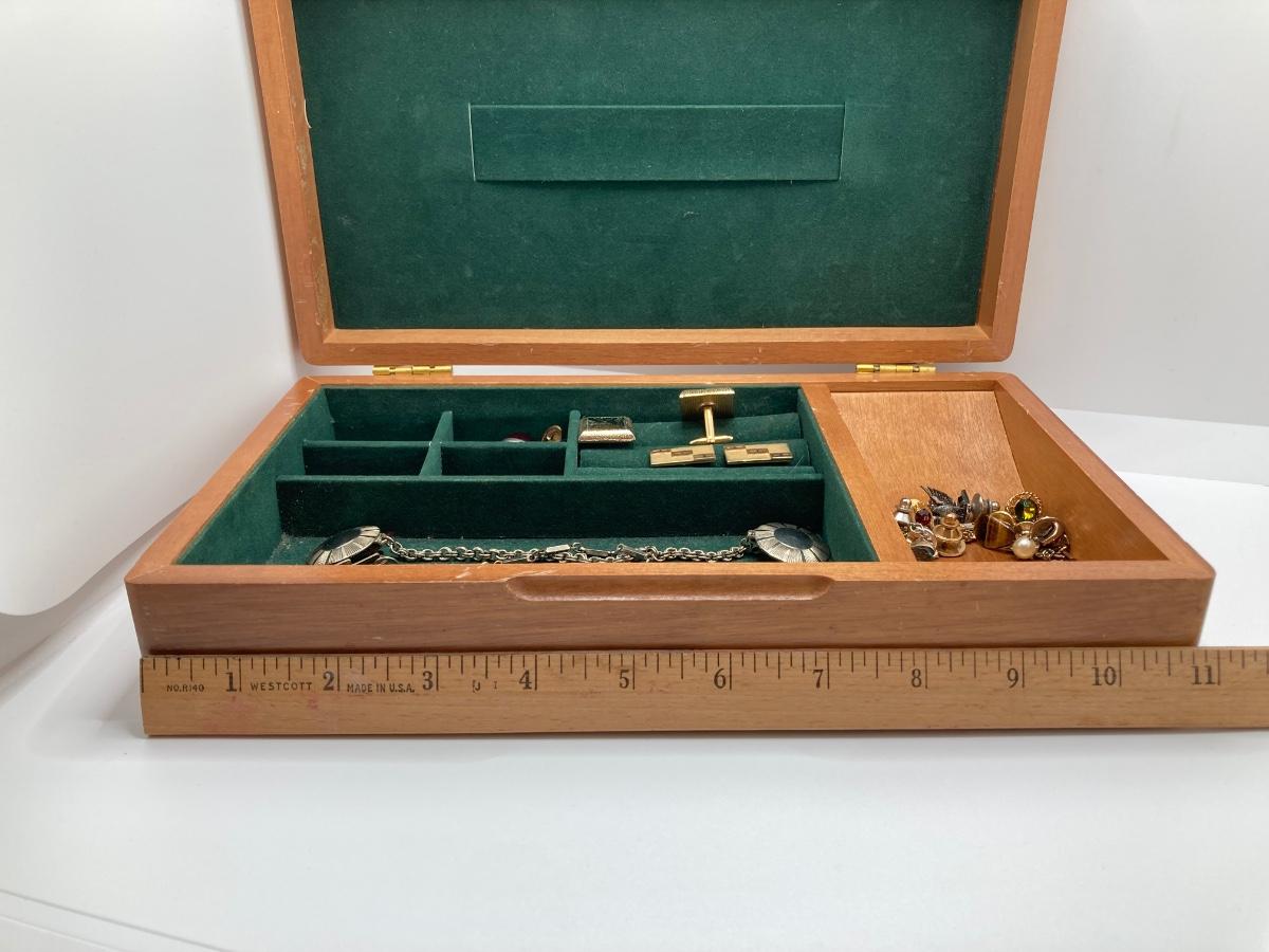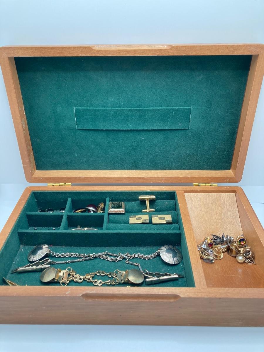 LOT 294: Wooden Jewelry Box with Vintage Cufflinks, Tie Tacs & More (Swank Included)