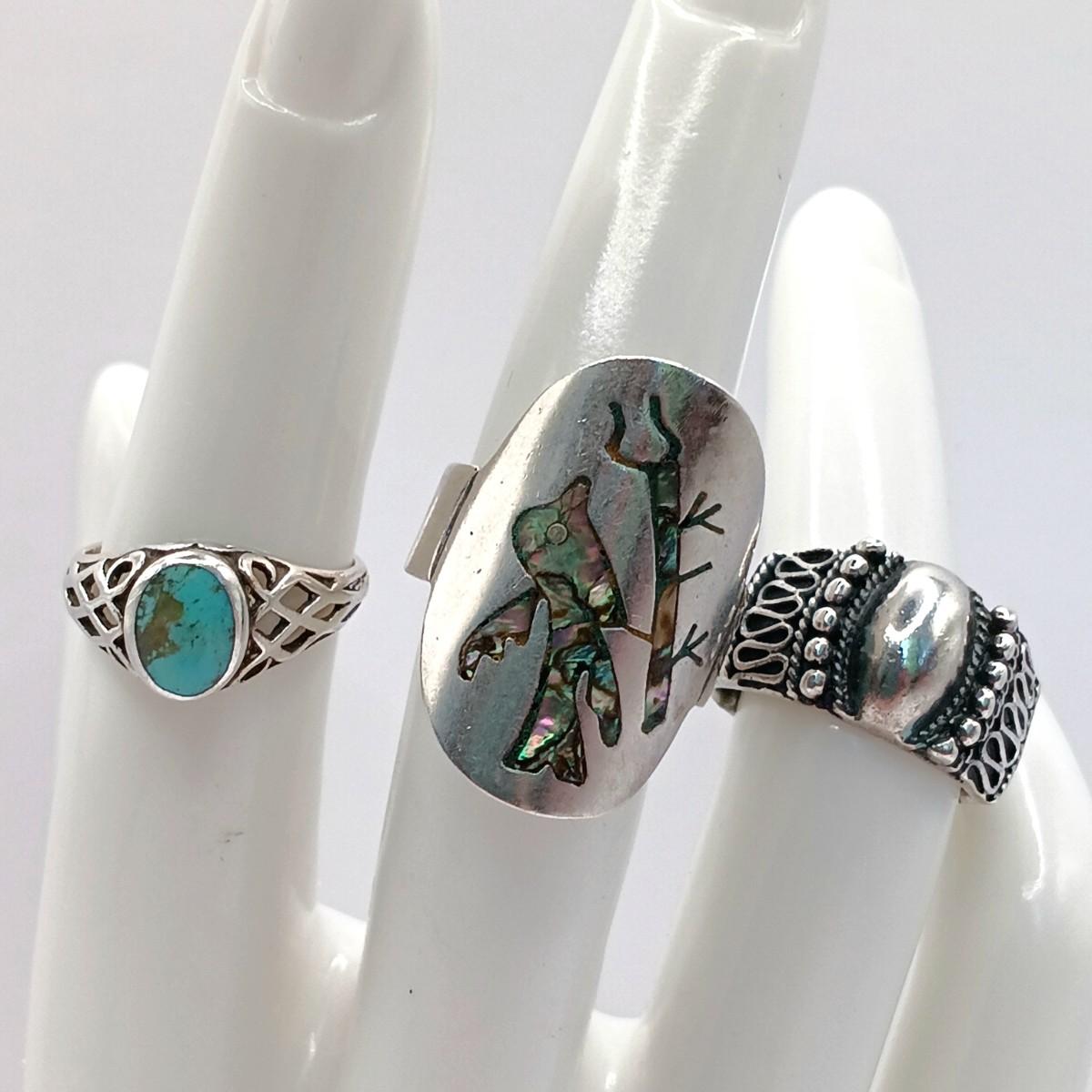 LOT 301: Set of 3 Sterling Silver Rings- Cigar Band, Taxco Abalone & Turquoise Stone