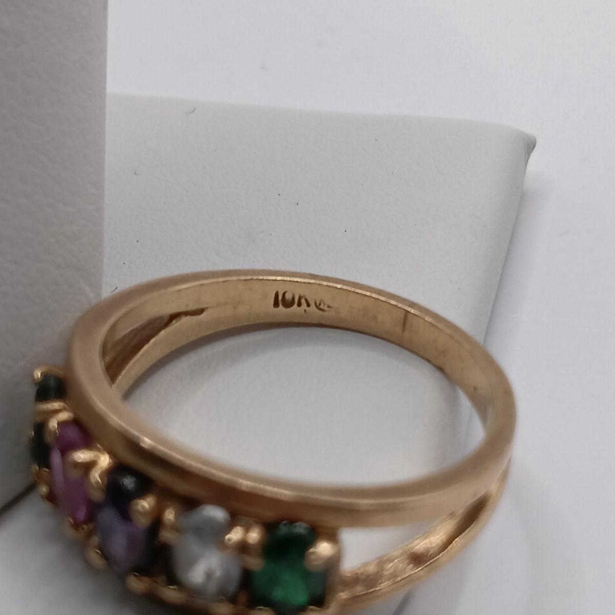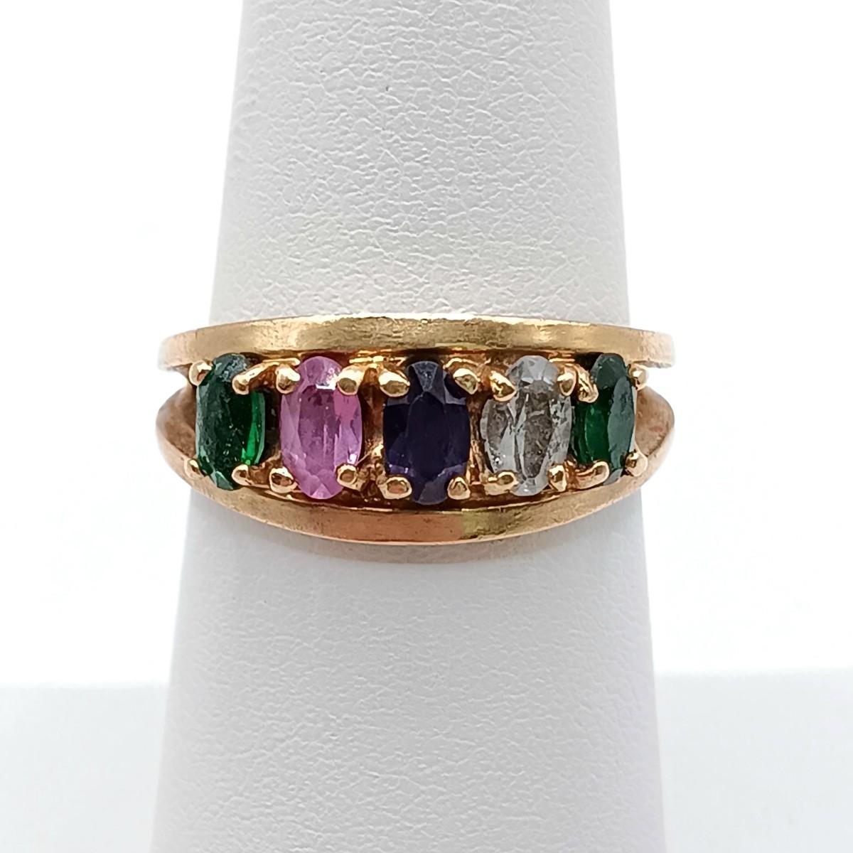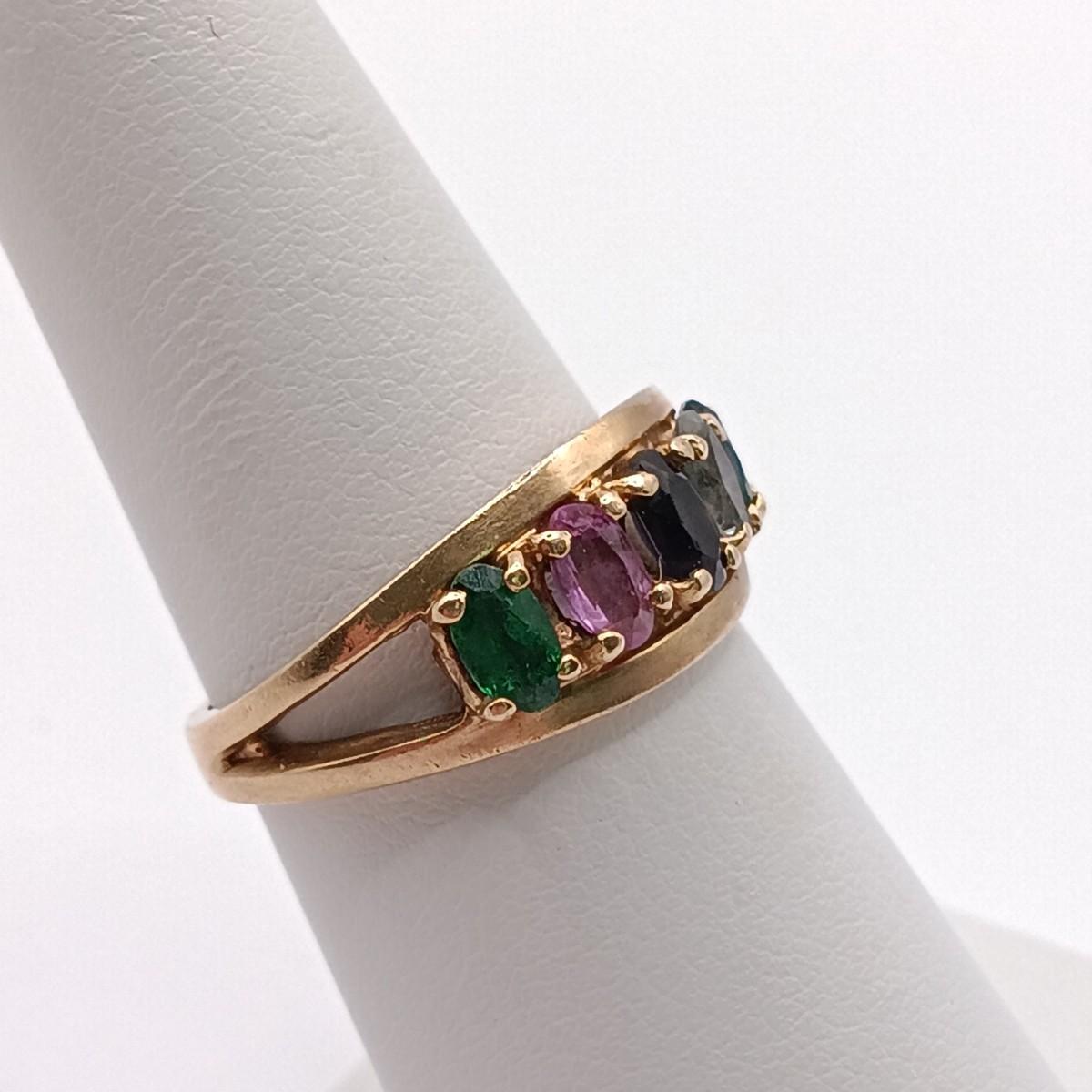 LOT 310: 10K Gold Birthstone Ring- Emerald, Amethyst, Pink Tourmaline & Blue Topaz 3.16gr Sz 6