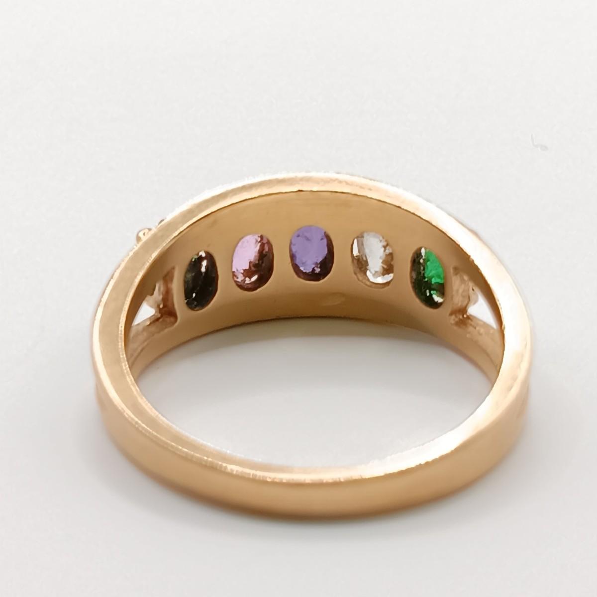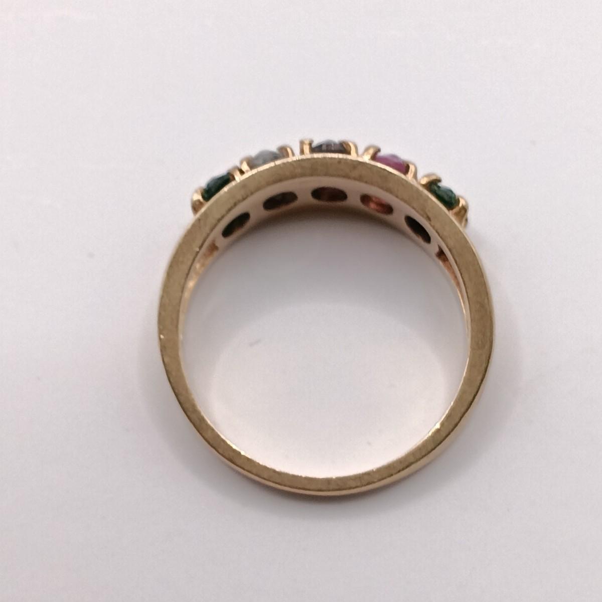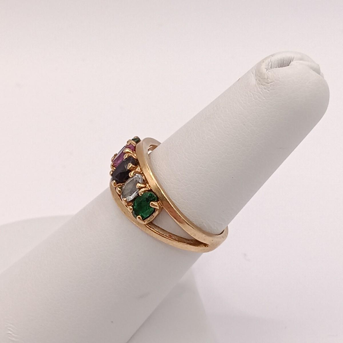 LOT 310: 10K Gold Birthstone Ring- Emerald, Amethyst, Pink Tourmaline & Blue Topaz 3.16gr Sz 6