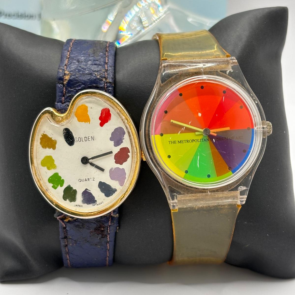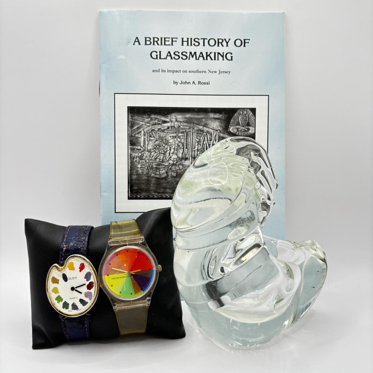 LOT 323: Huddle Art Glass Sculpture w/ Metropolitan Museum of Art Watch, Golden Art Palette Watch & More