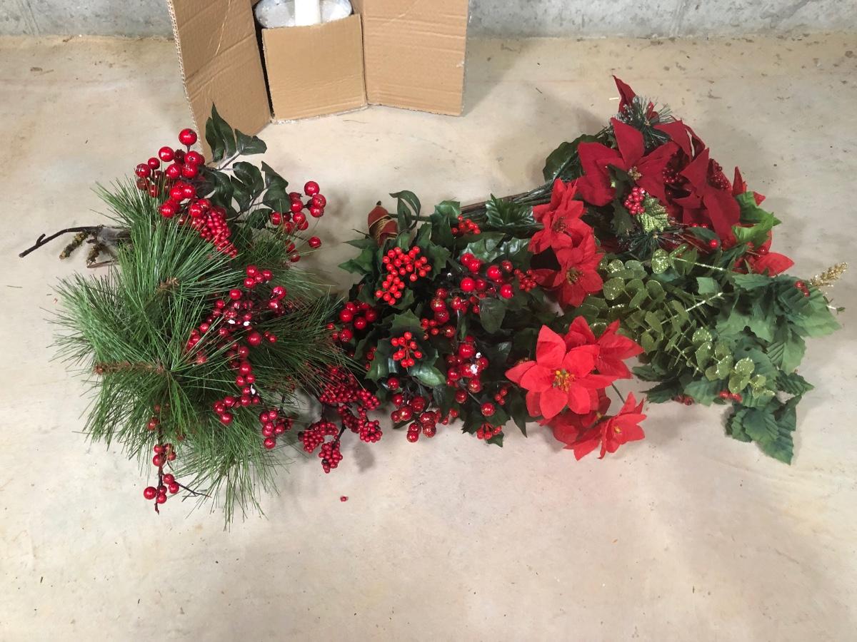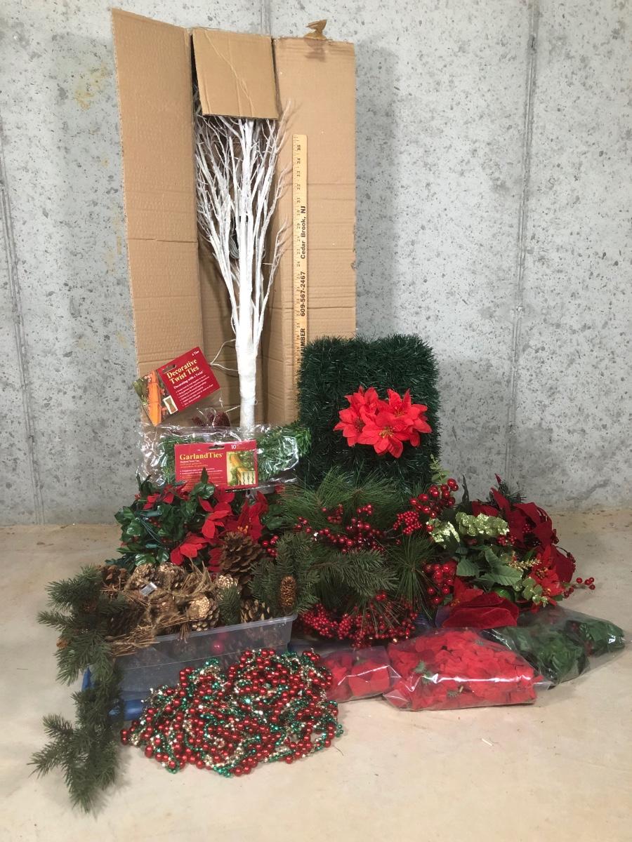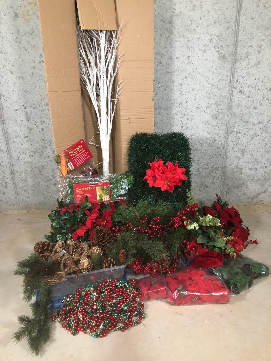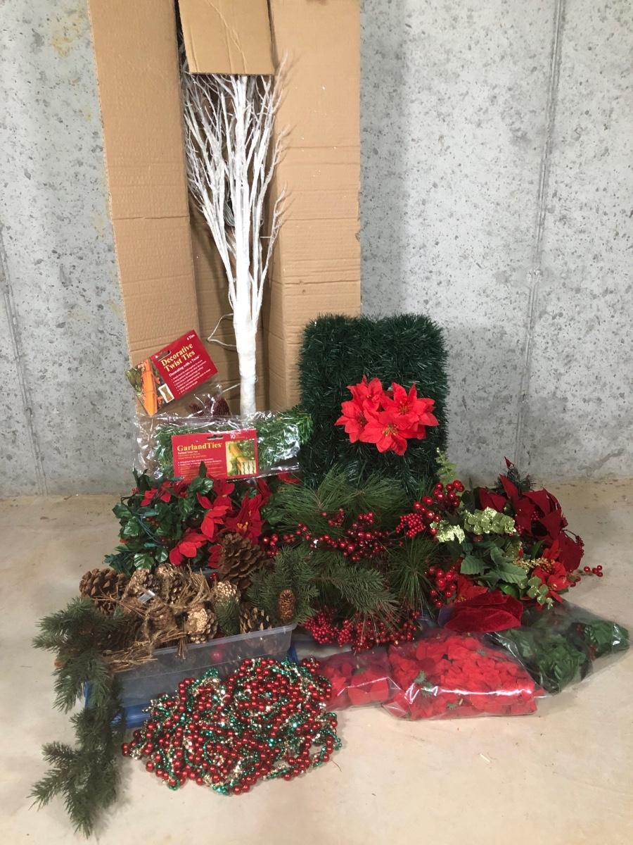LOT 31X: Christmas Decor - White Birch Tree, Garland, Faux Flowers & Pinecones