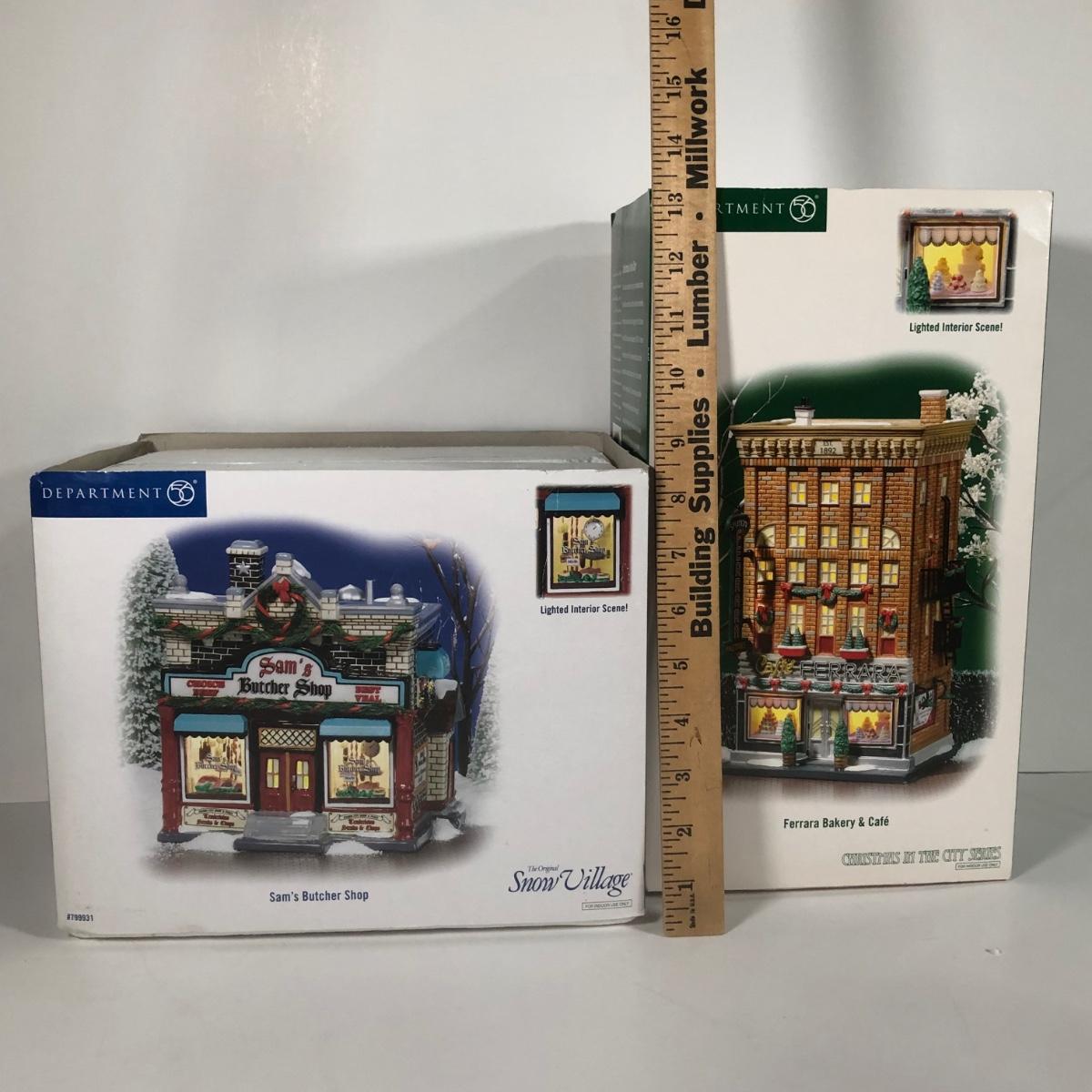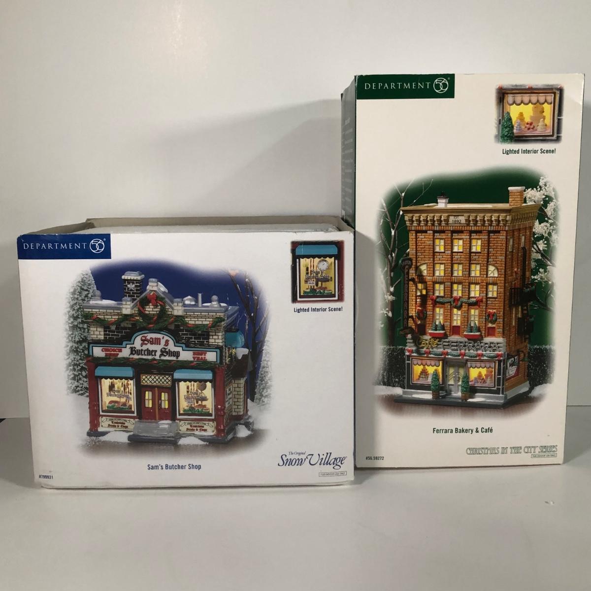 LOT 41X: Dept 56 w/ Boxes: Snow Village Sam's Butcher Shop & Christmas in the City Ferrara Bakery & Cafe