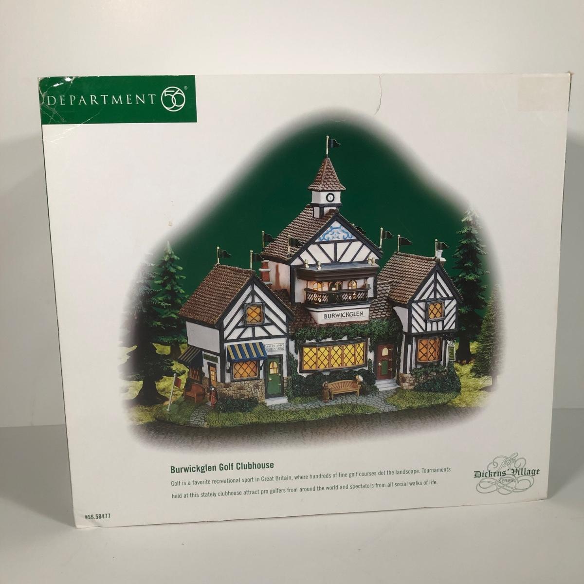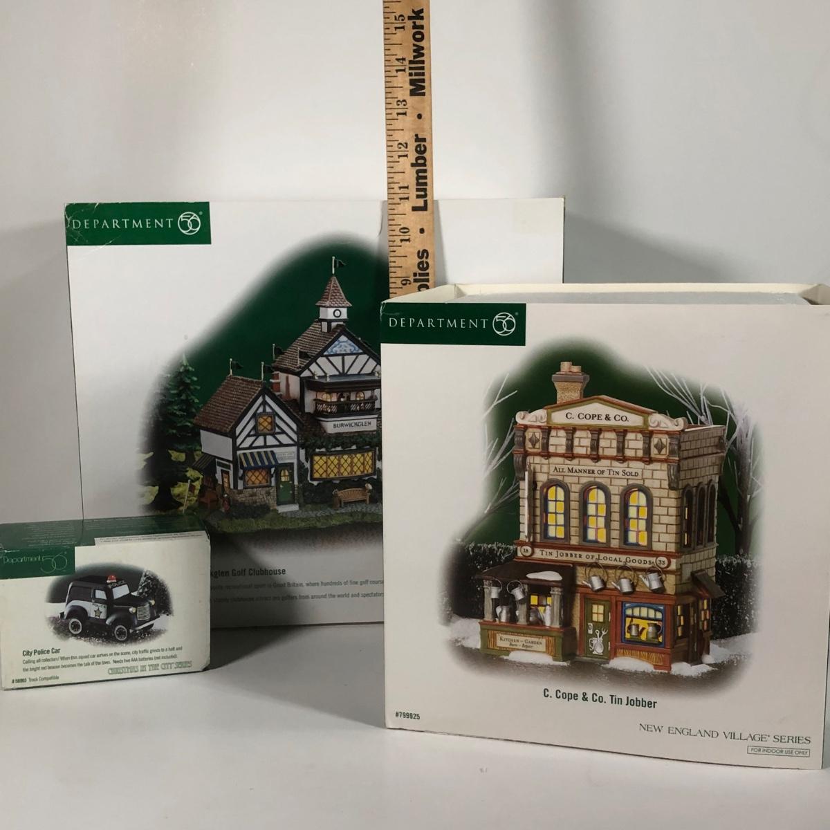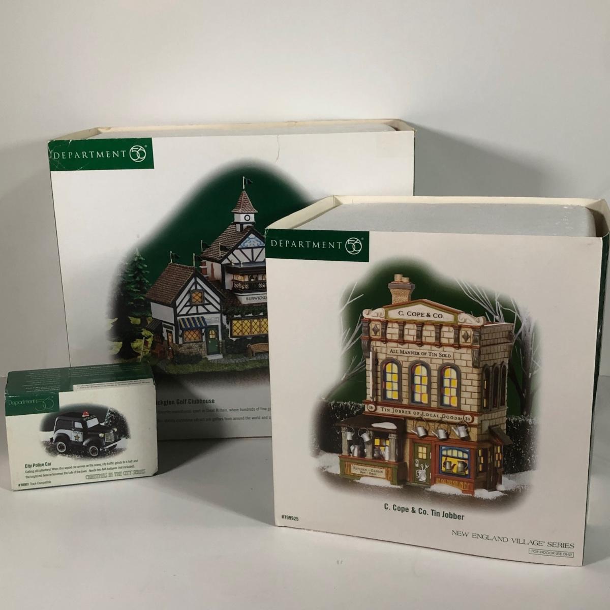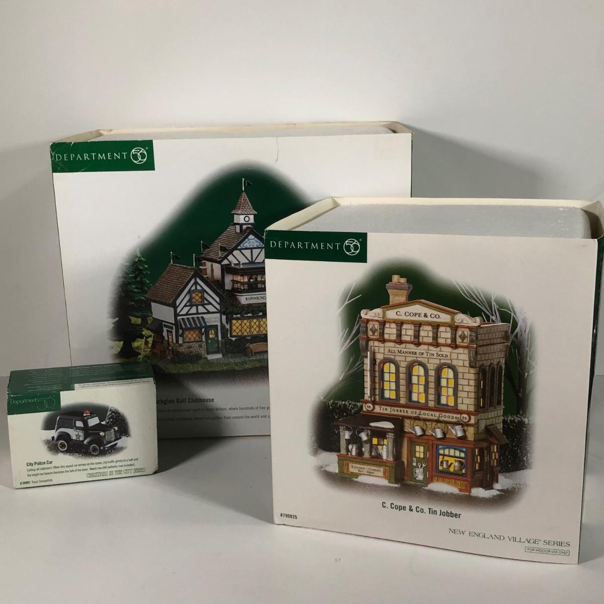 LOT 42X: Dept 56 w/ Boxes: Dicken's Village Burwickglen Golf Clubhouse, New England Village C Cope & Co Tin Jobber & Christmas in the City Police Car
