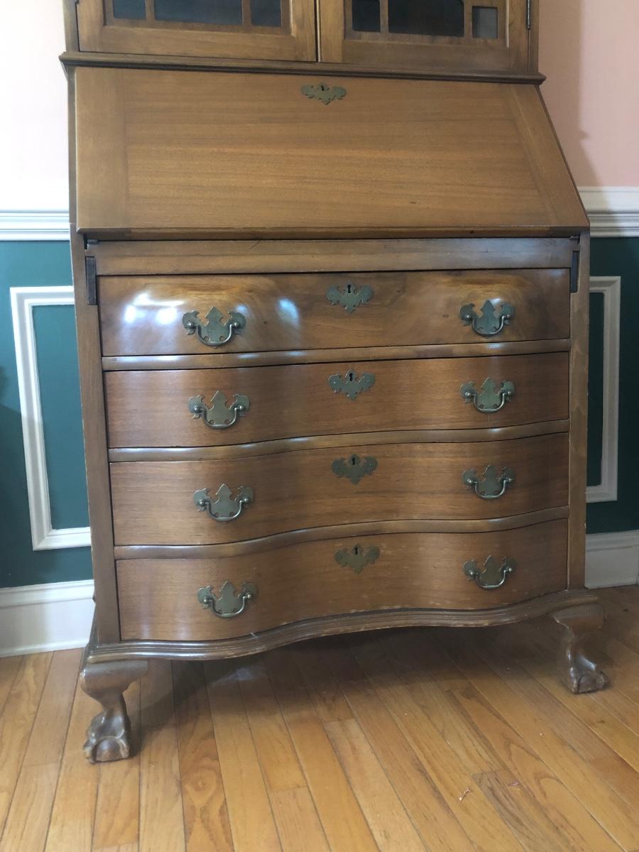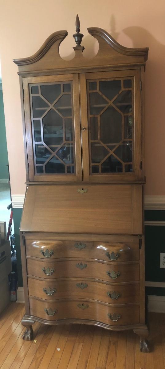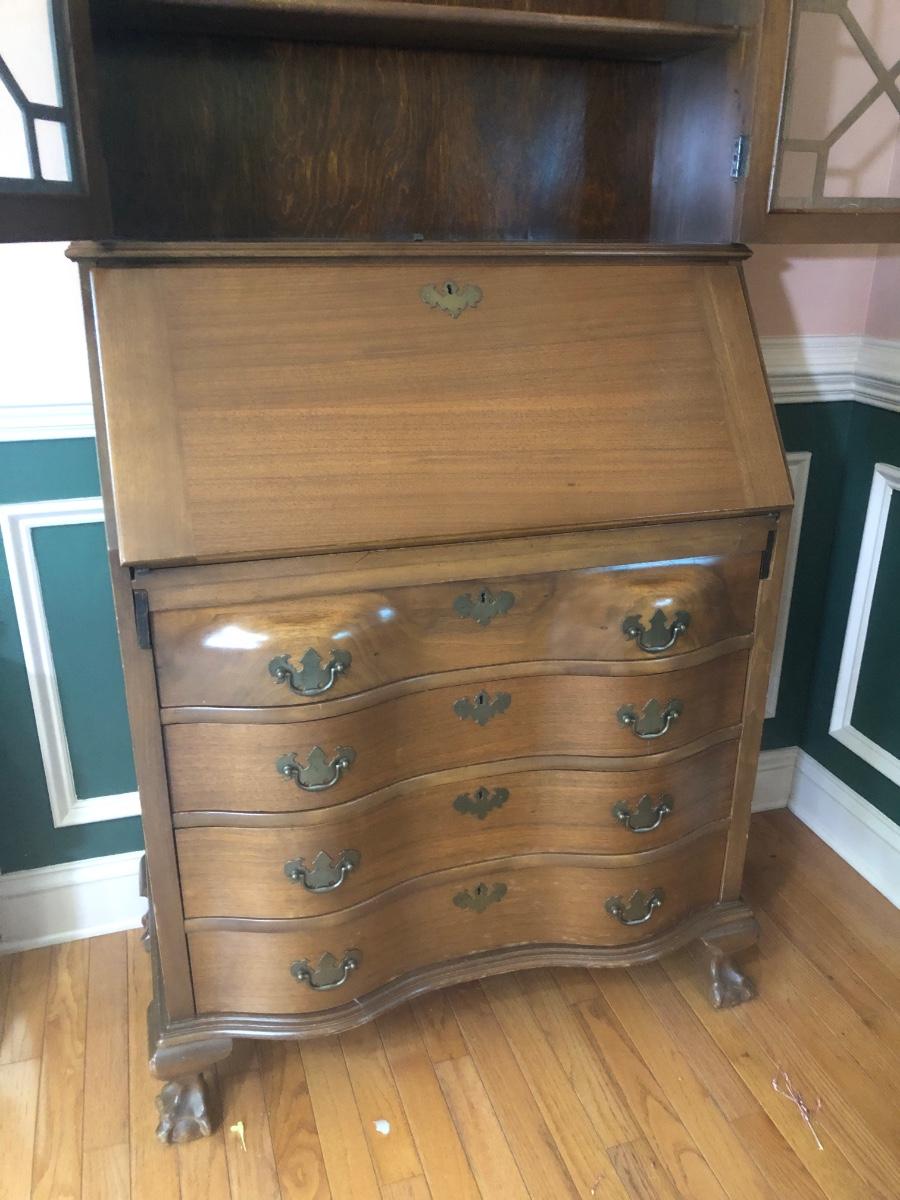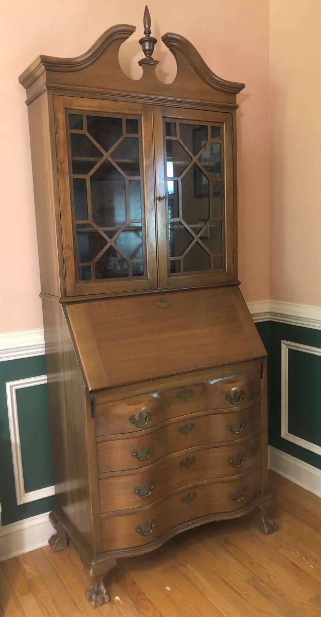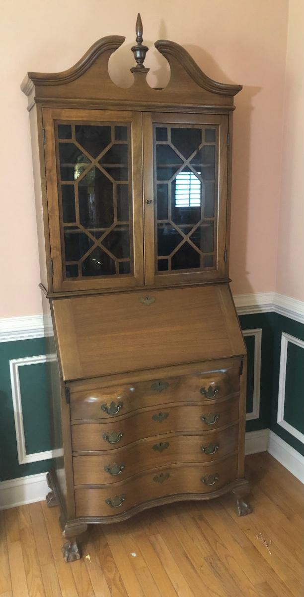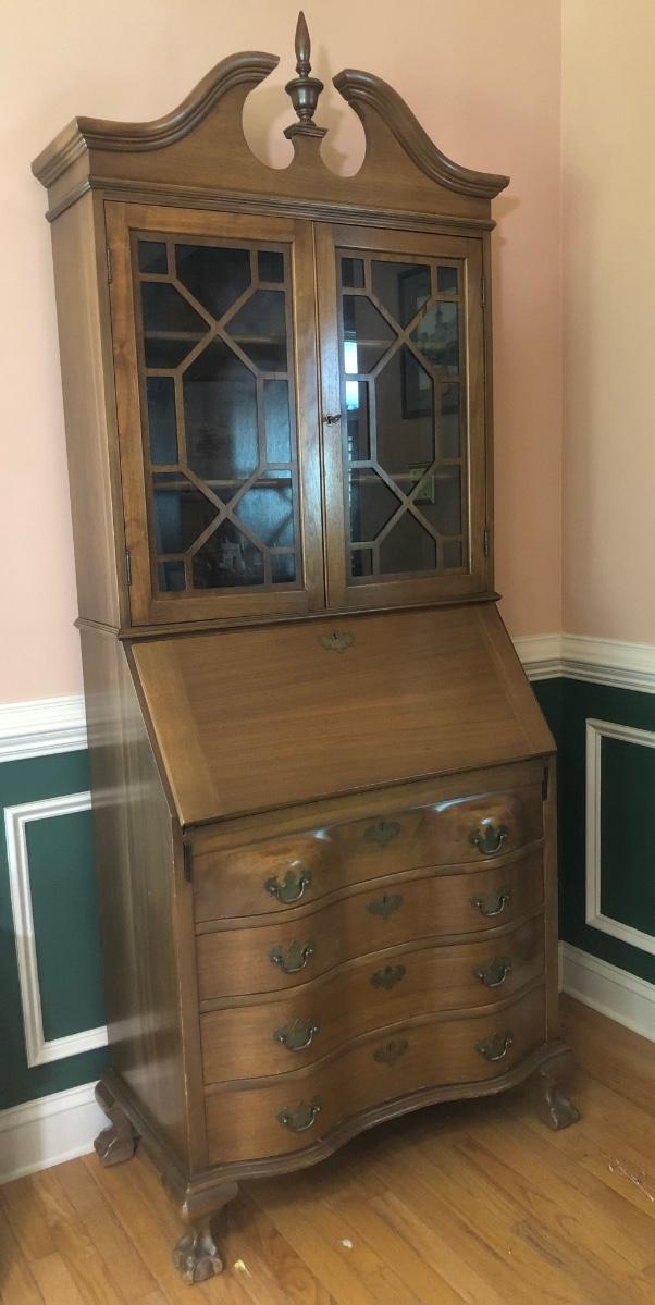 LOT 71D: Vintage Clawfoot Drop Front Desk w/ Glass Front Cabinet & Key
