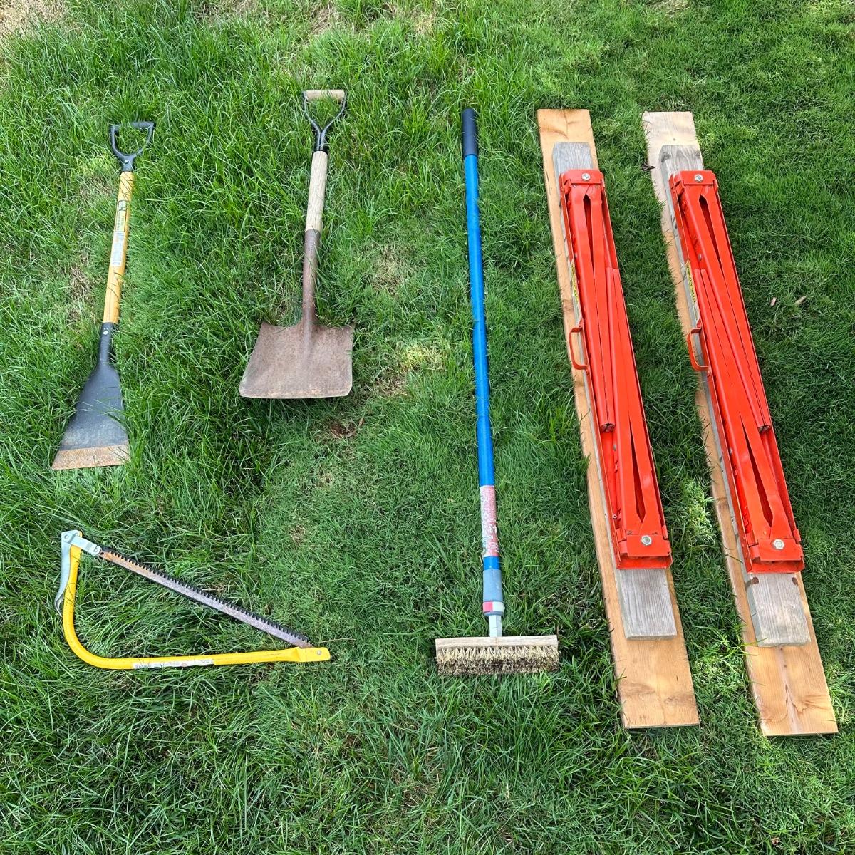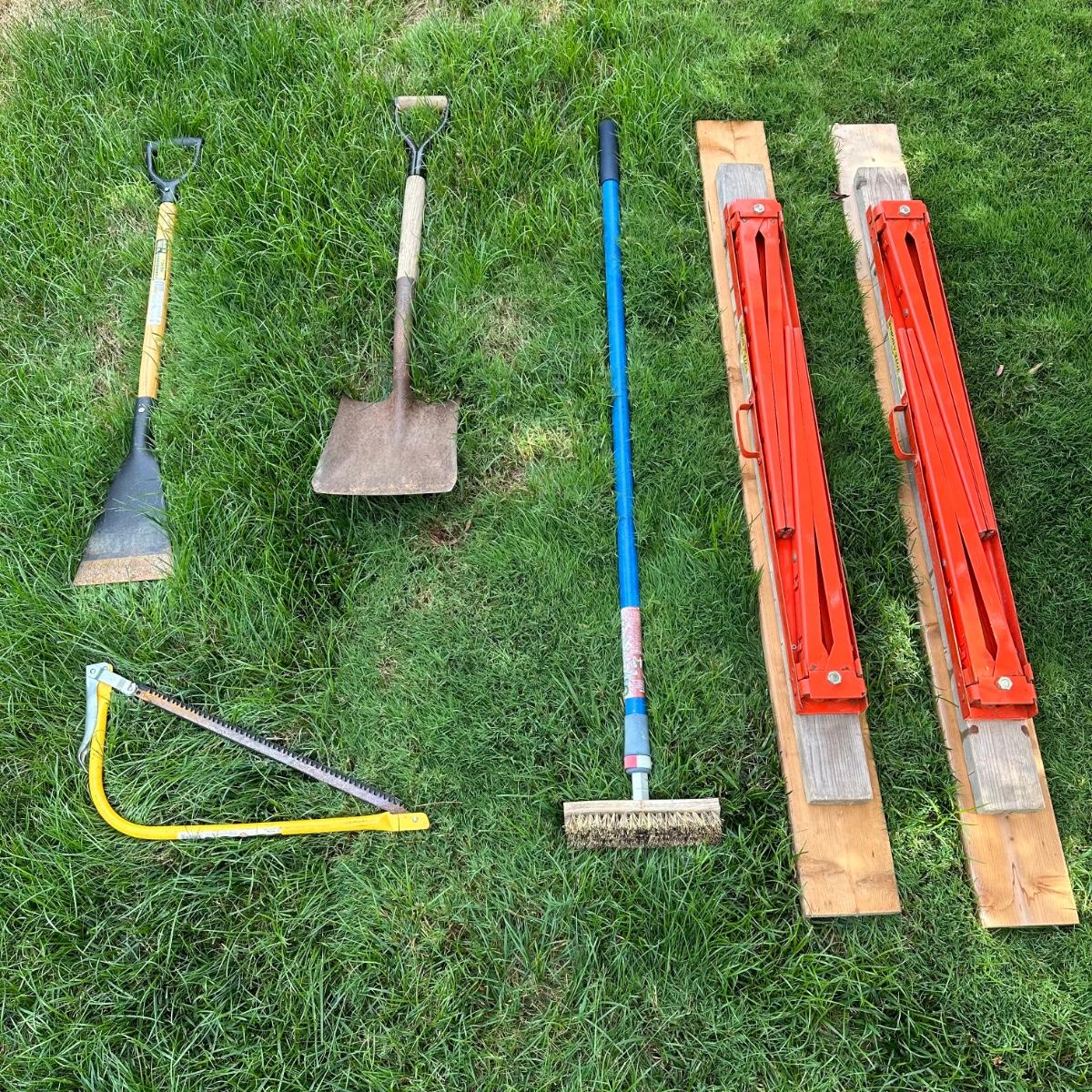 LOT 110S: Gardening Tools & Tote a Horse Saw Horses