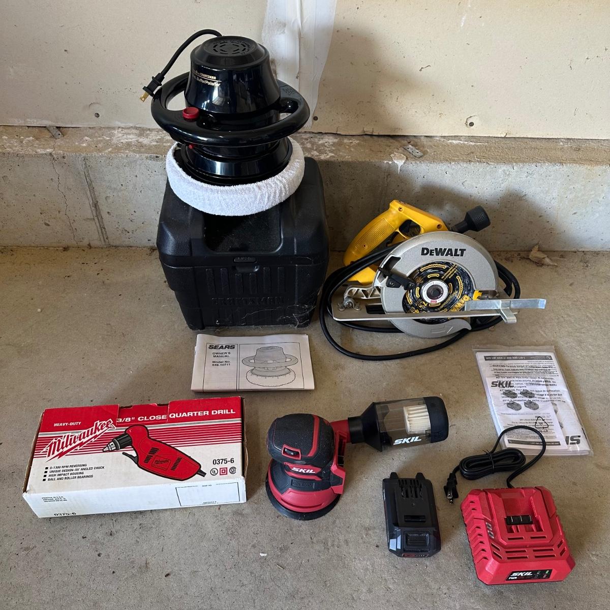 LOT 120G: Assorted Power Tool - DeWalt Circular Saw, Milwaukee Close Quarters Drill NIB, Sears Buffer/Polisher & More