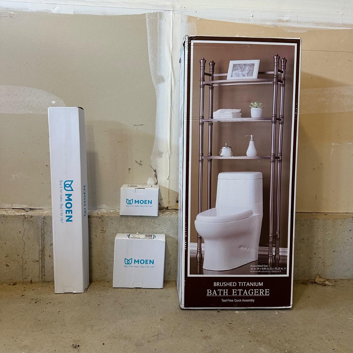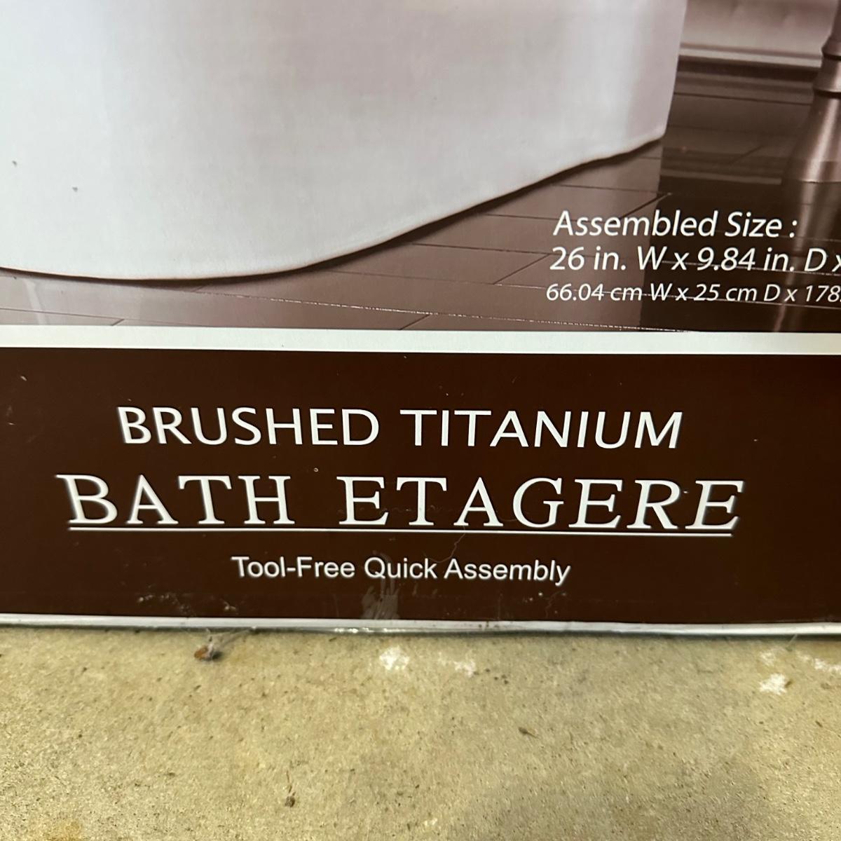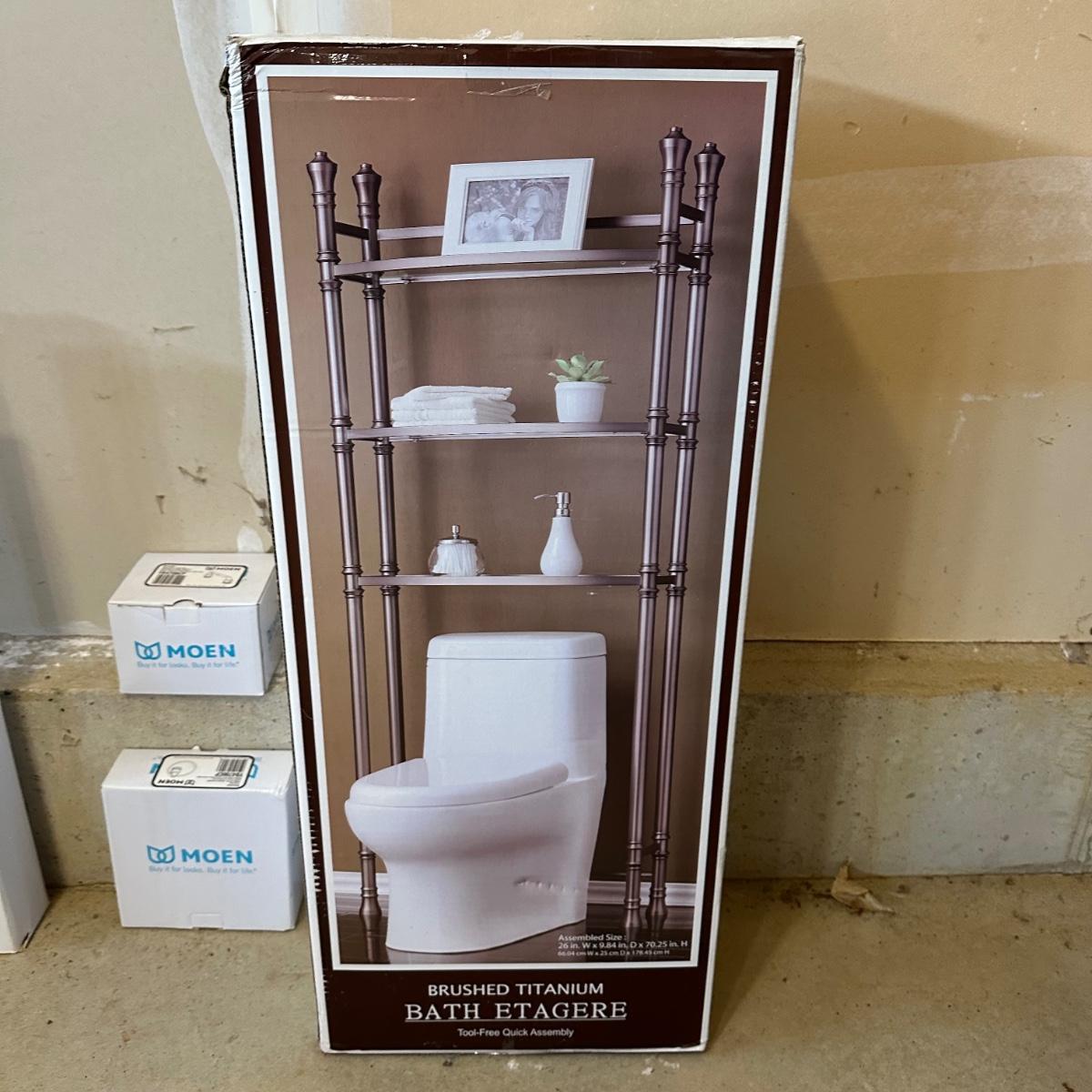 LOT 157G: Bathroom Essentials - Brushed Titanium Bath Etagere, Moen Towel Rings, Toilet Paper Holder & Towel Bar