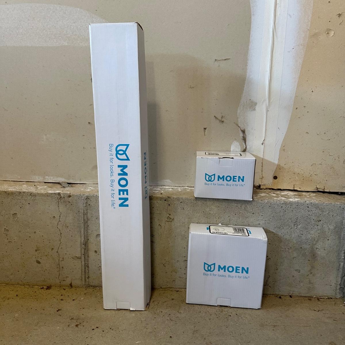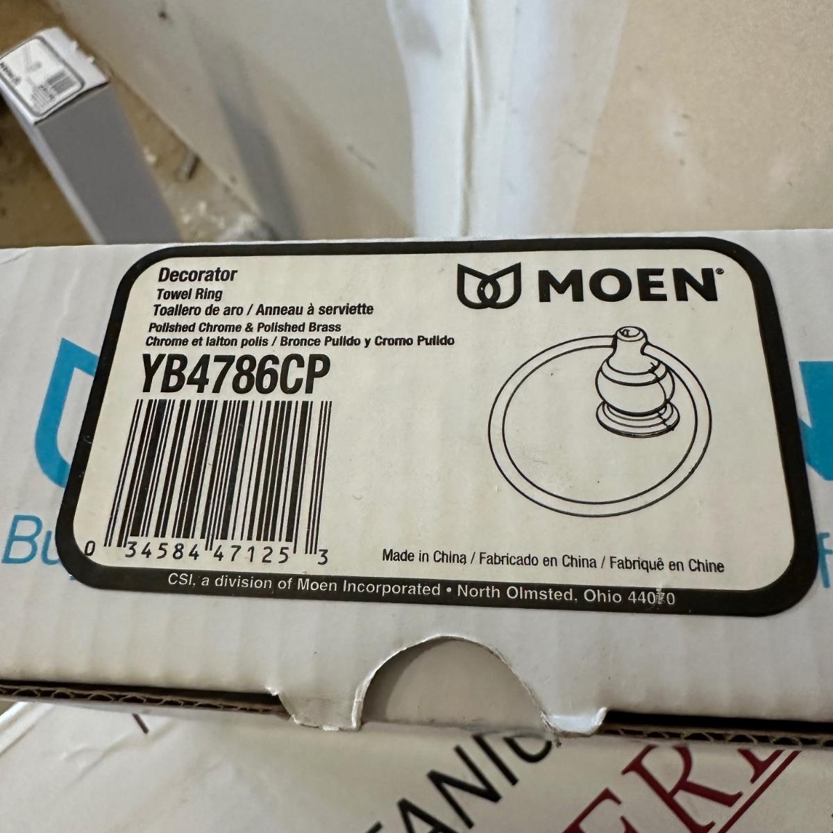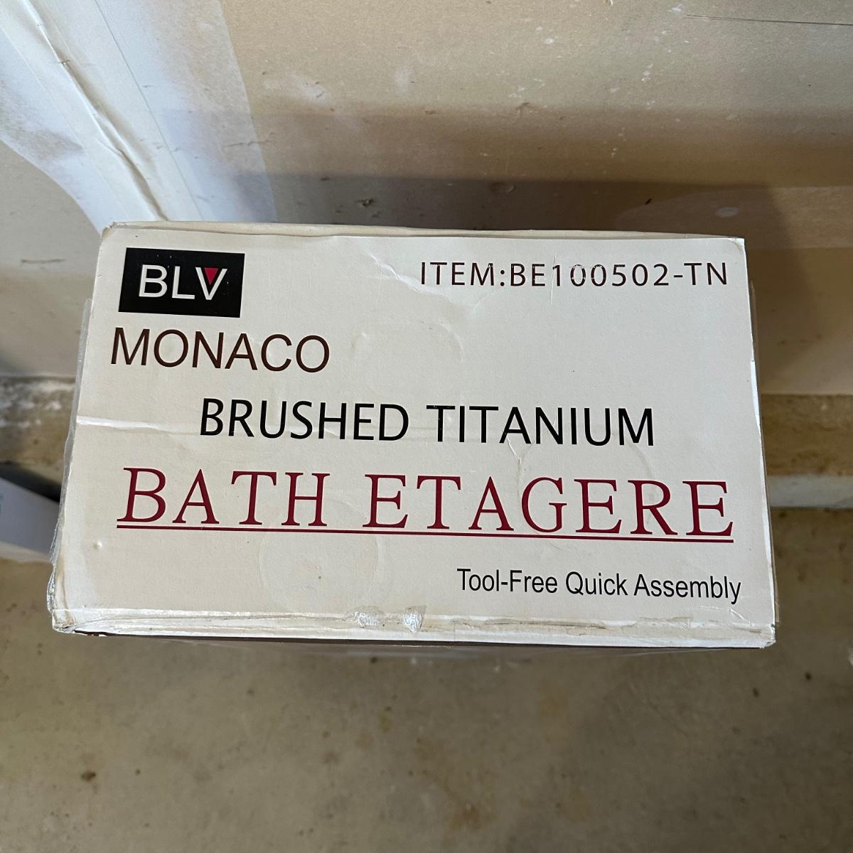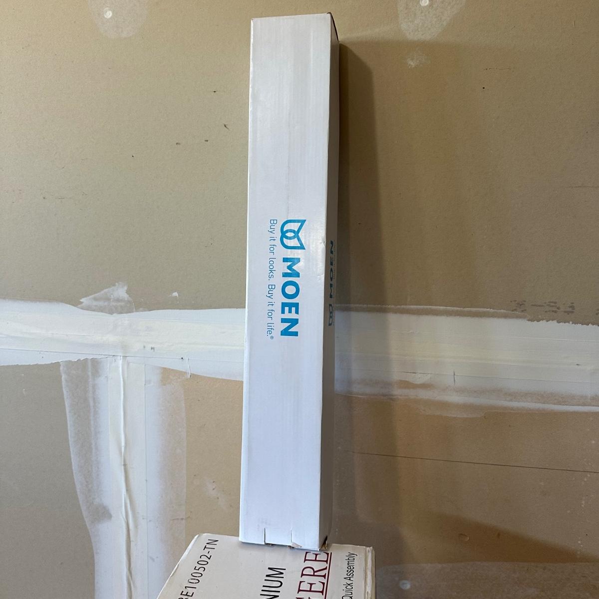 LOT 157G: Bathroom Essentials - Brushed Titanium Bath Etagere, Moen Towel Rings, Toilet Paper Holder & Towel Bar