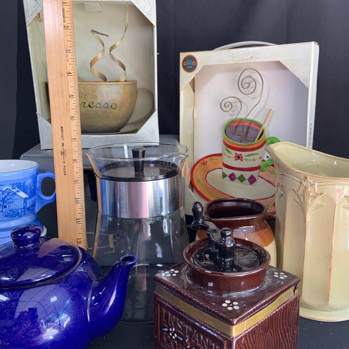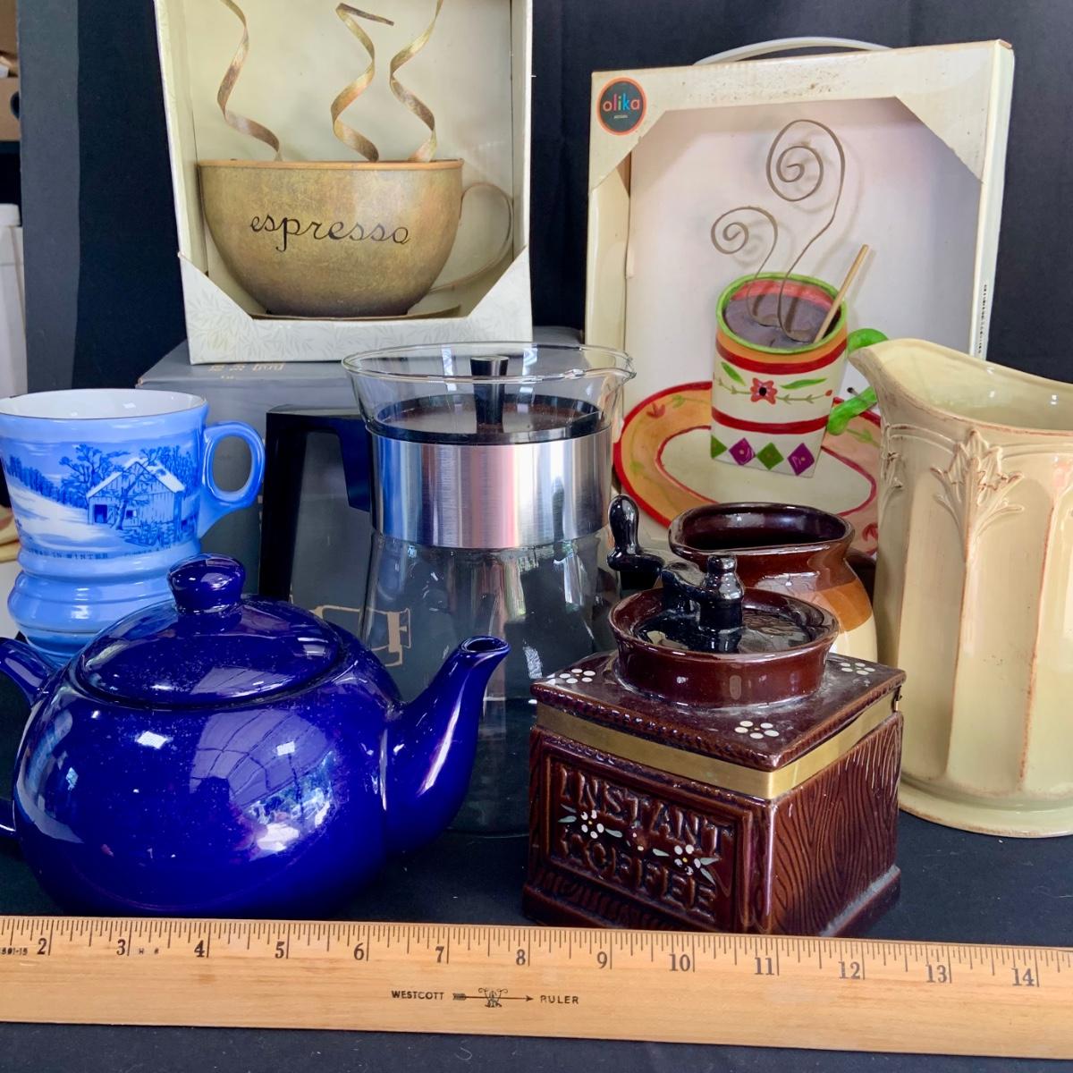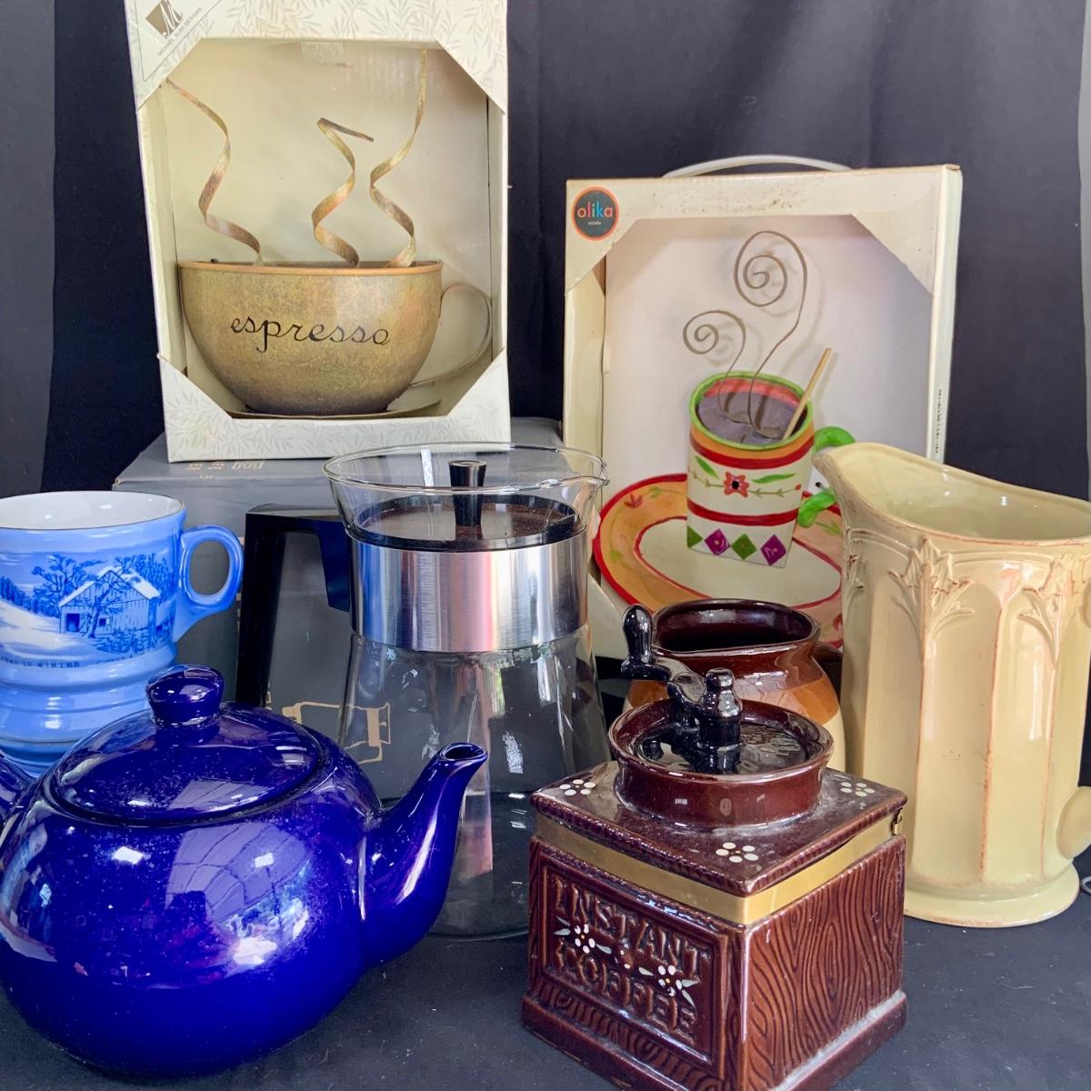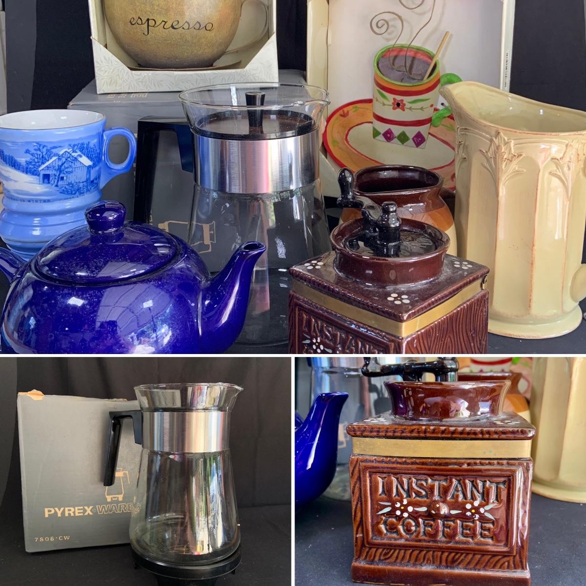 LOT:9: Have a Warm Cup Collection Featuring a Vintage Pyrex Ware Coffee Decanter, Teapot, Currier & Ives Mugs, Vintage Grinder Ceramic Canister, Wall Decor & More