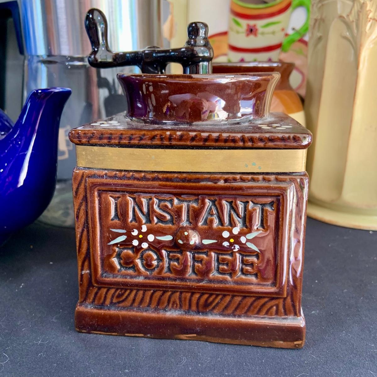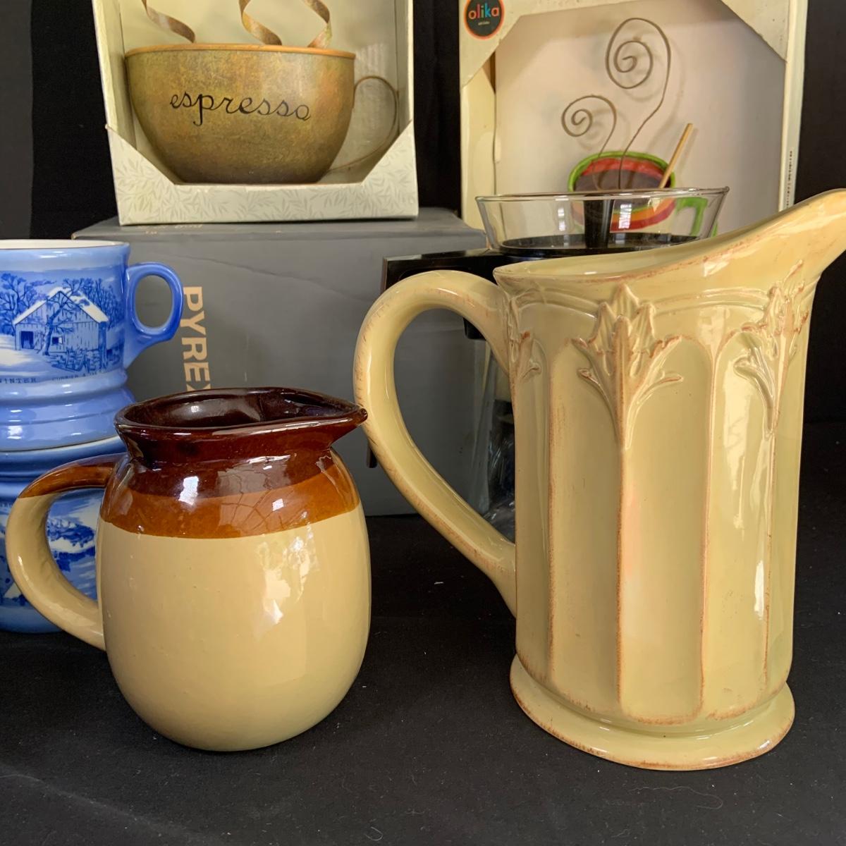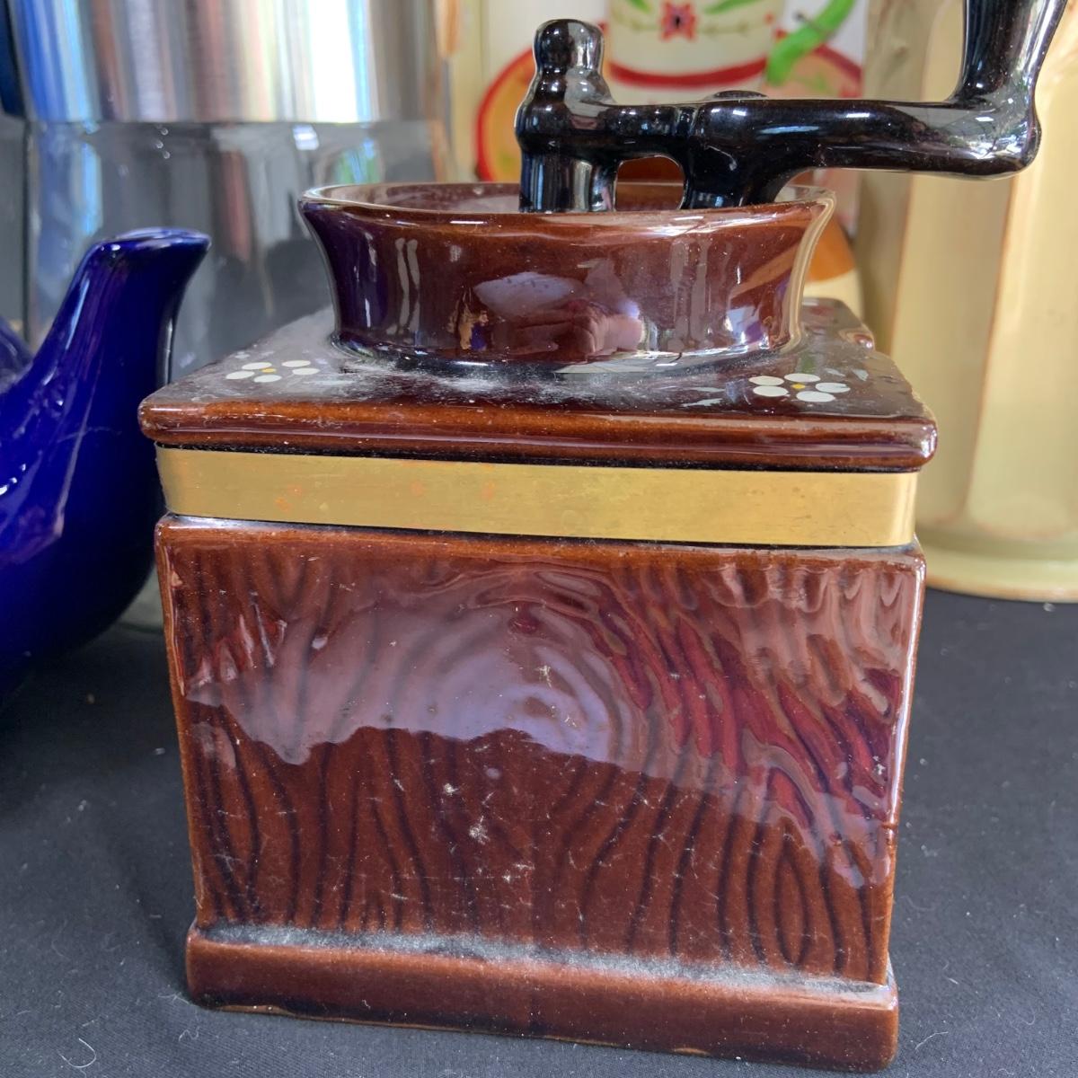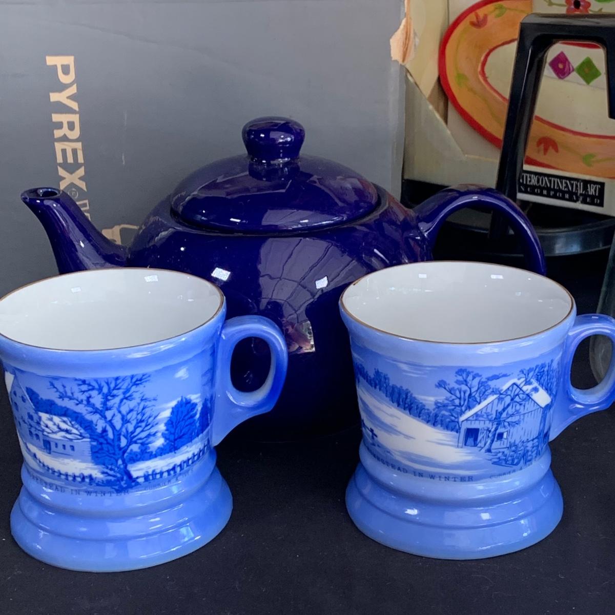 LOT:9: Have a Warm Cup Collection Featuring a Vintage Pyrex Ware Coffee Decanter, Teapot, Currier & Ives Mugs, Vintage Grinder Ceramic Canister, Wall Decor & More