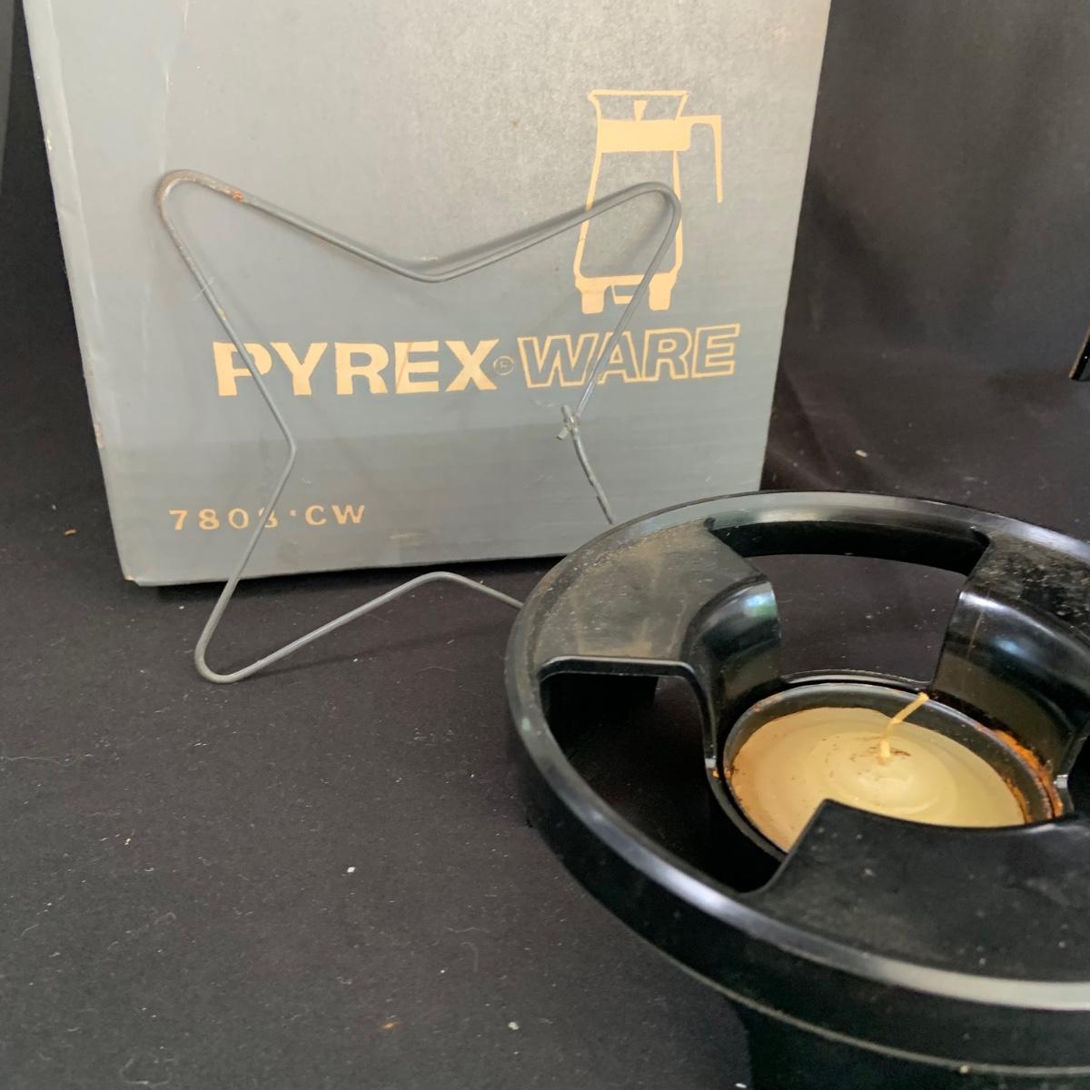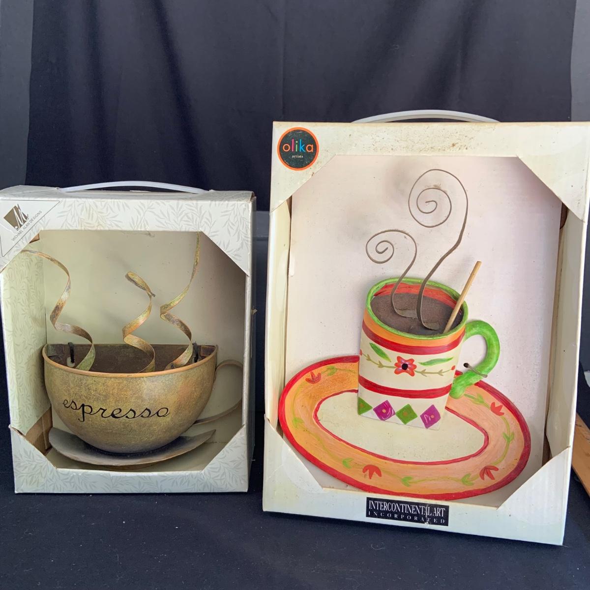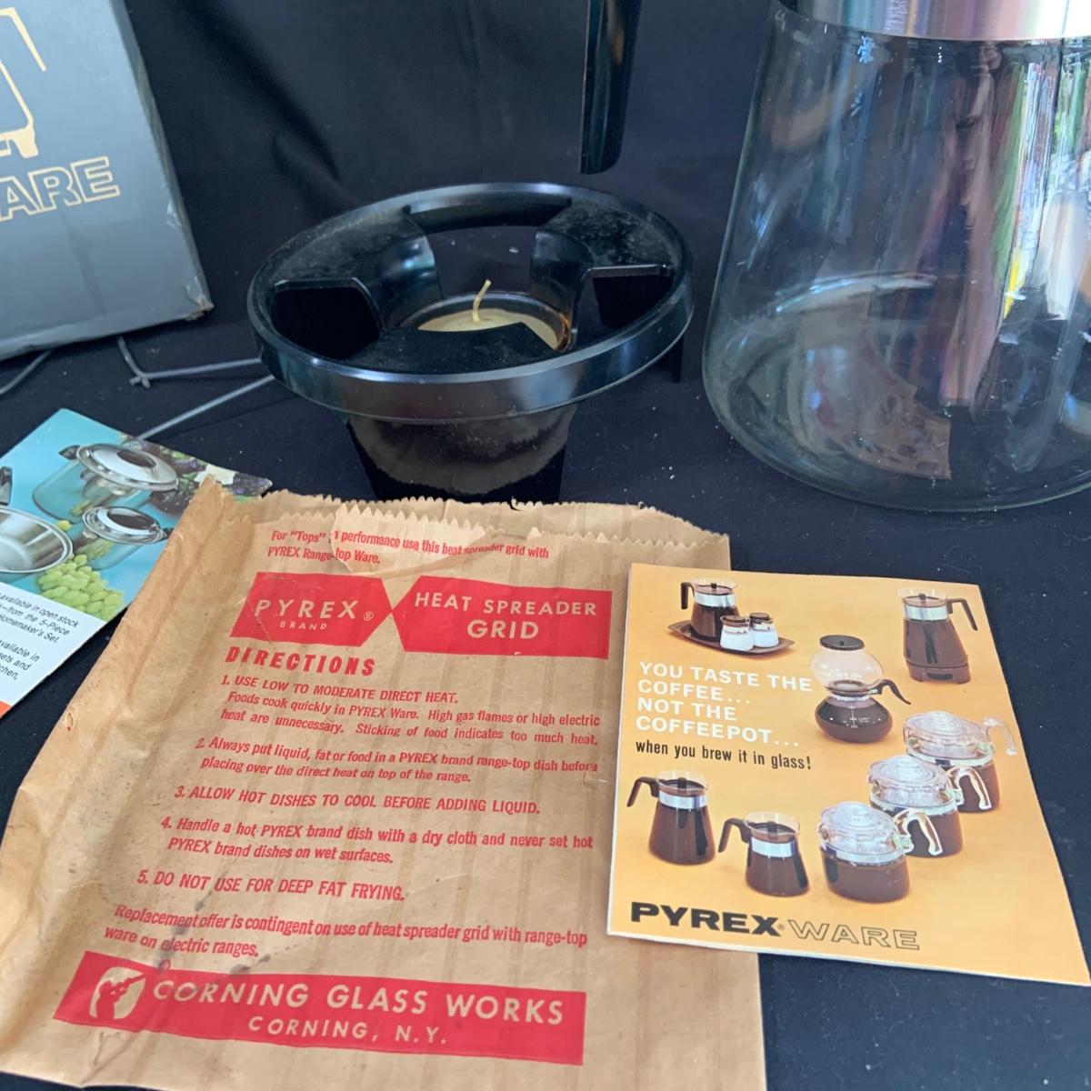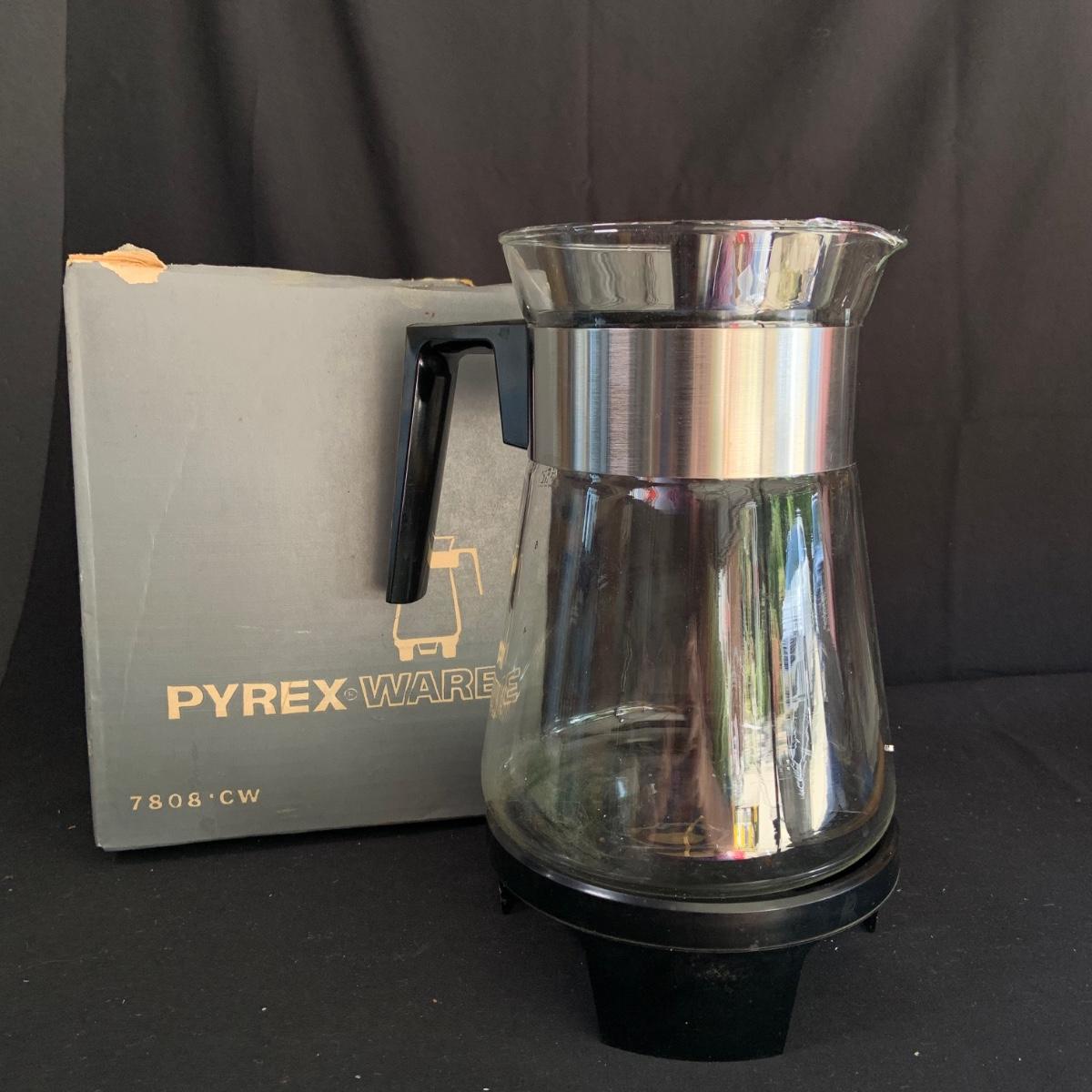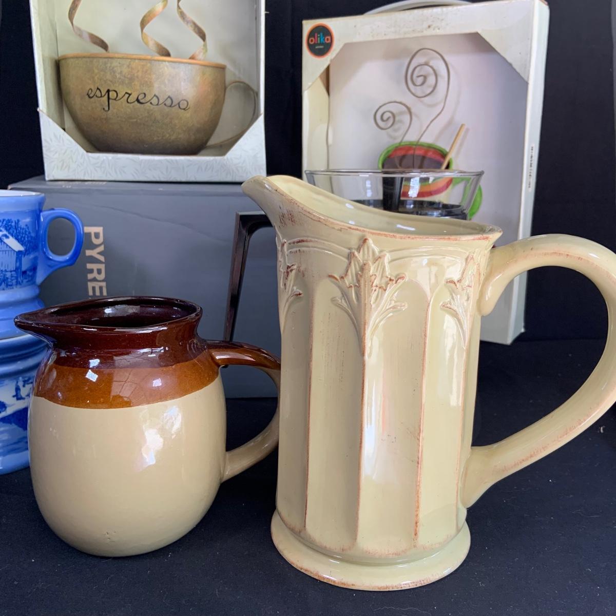 LOT:9: Have a Warm Cup Collection Featuring a Vintage Pyrex Ware Coffee Decanter, Teapot, Currier & Ives Mugs, Vintage Grinder Ceramic Canister, Wall Decor & More