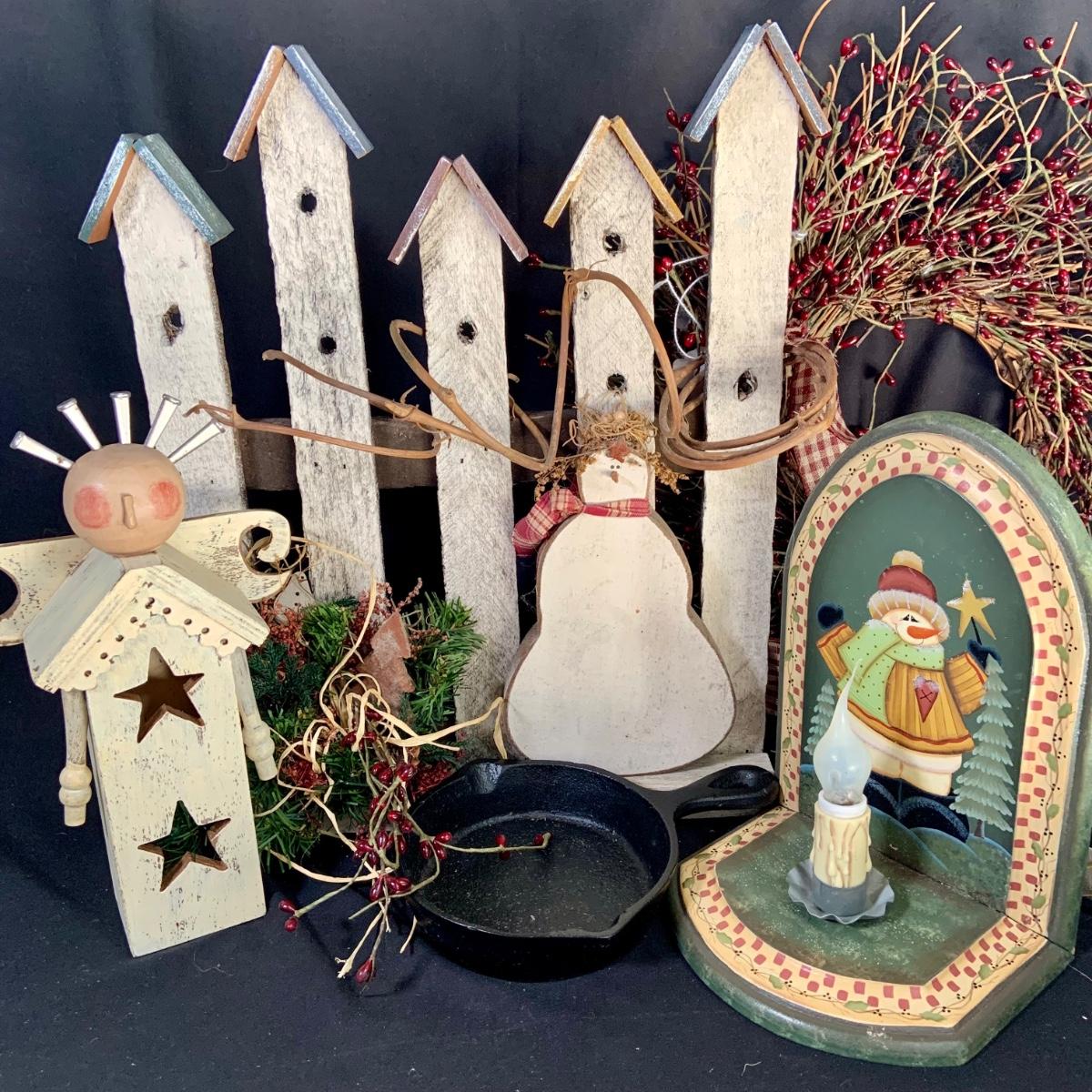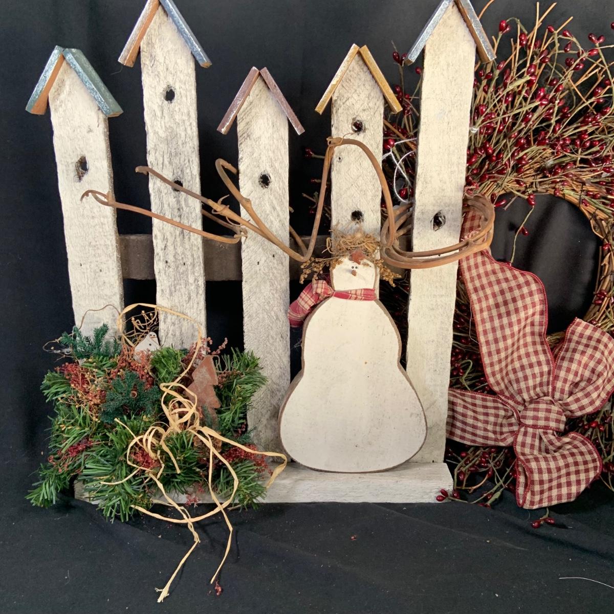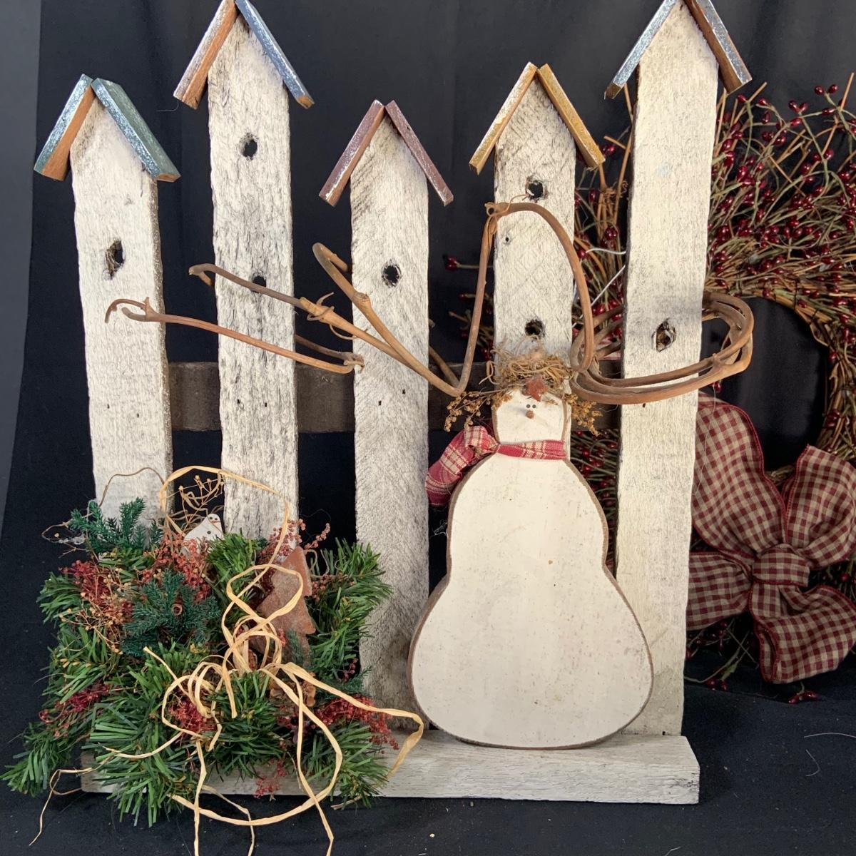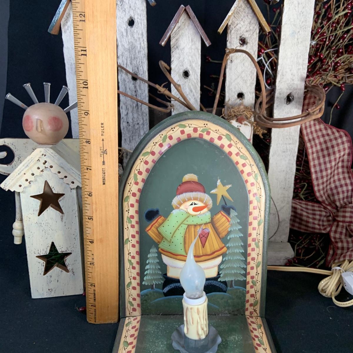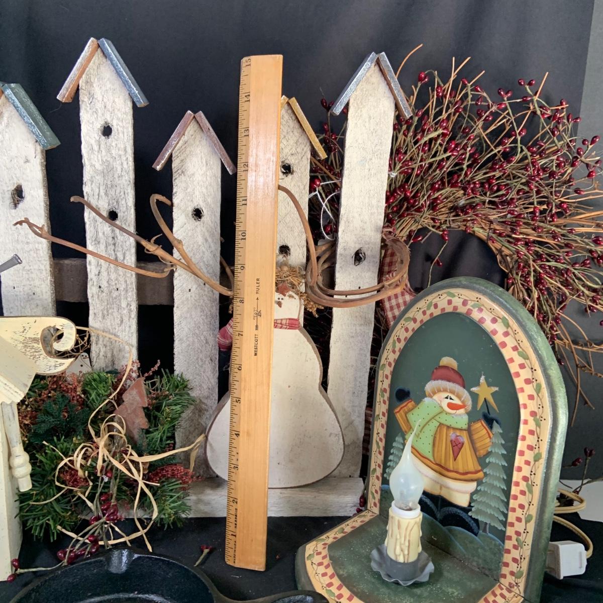 LOT:18:Rustic/ Primitive Winter Decor Including Birdhouse Fence, Birdhouse Angle Snowman Electric Candle Holder, Wreath and More
