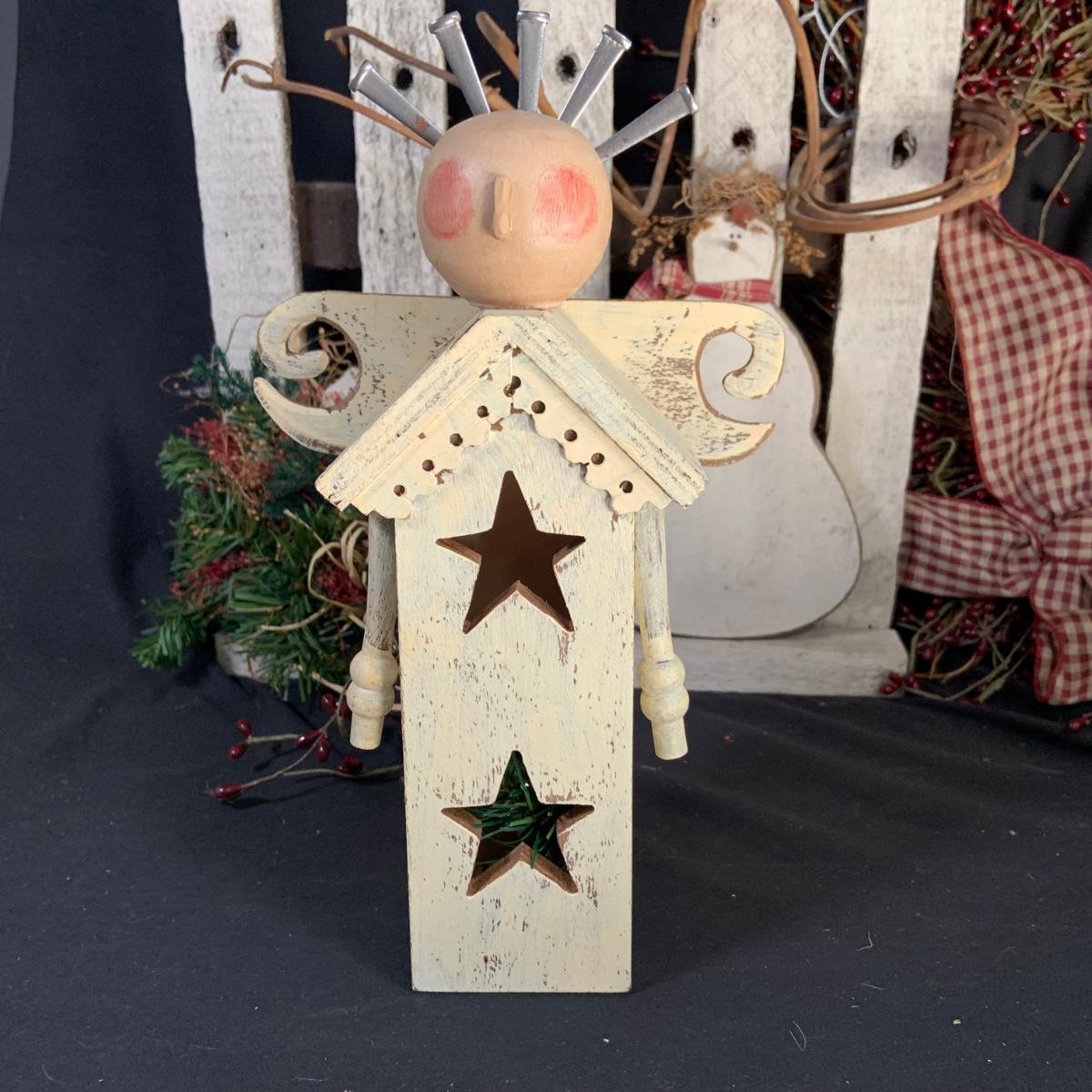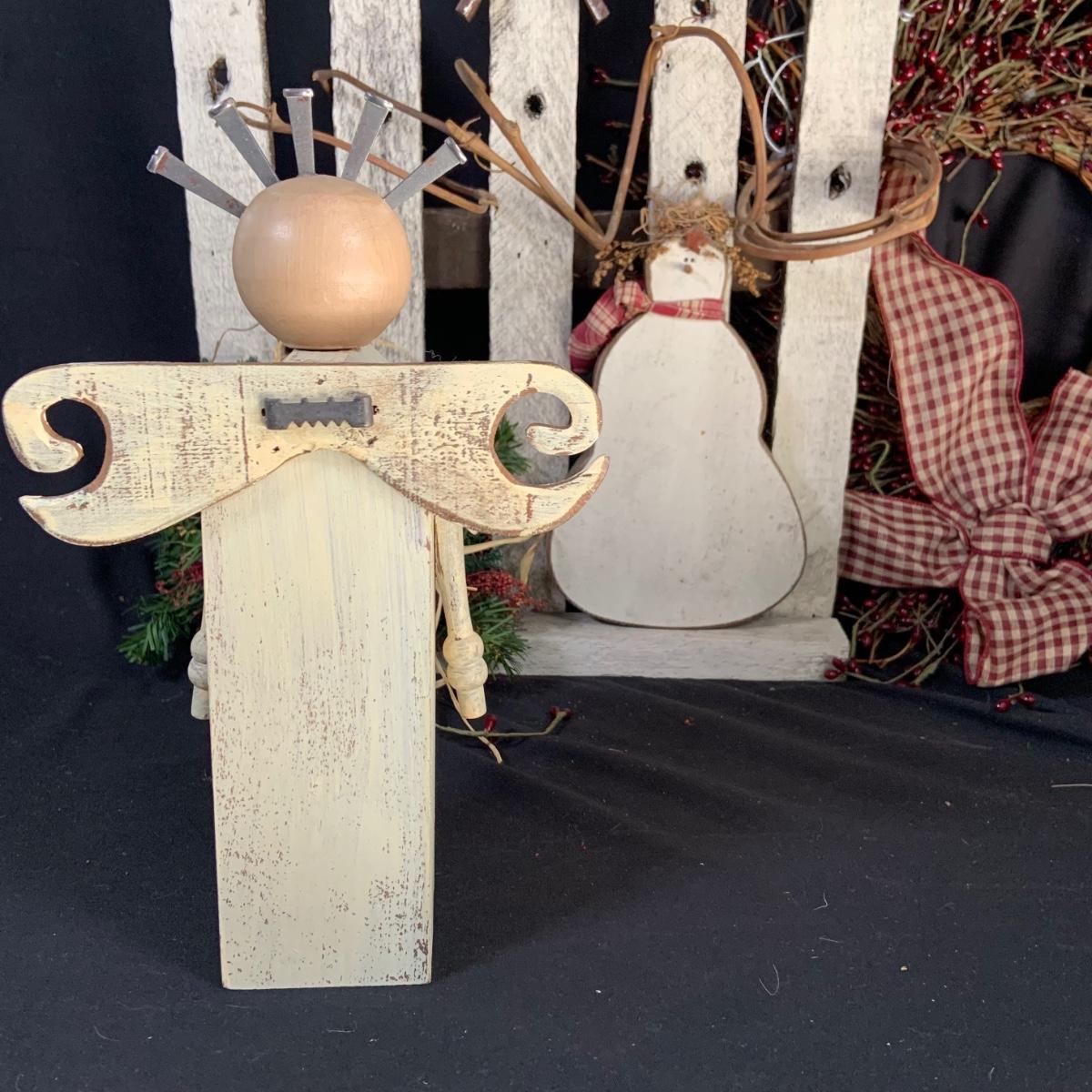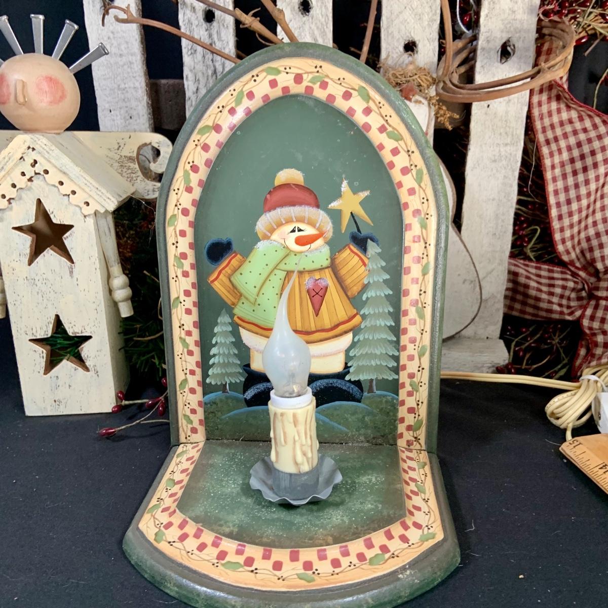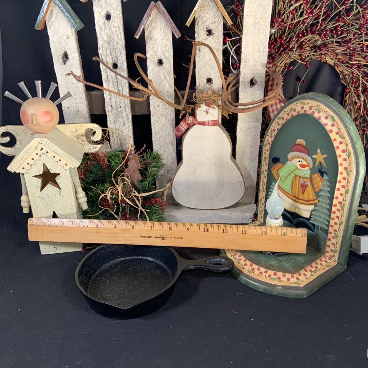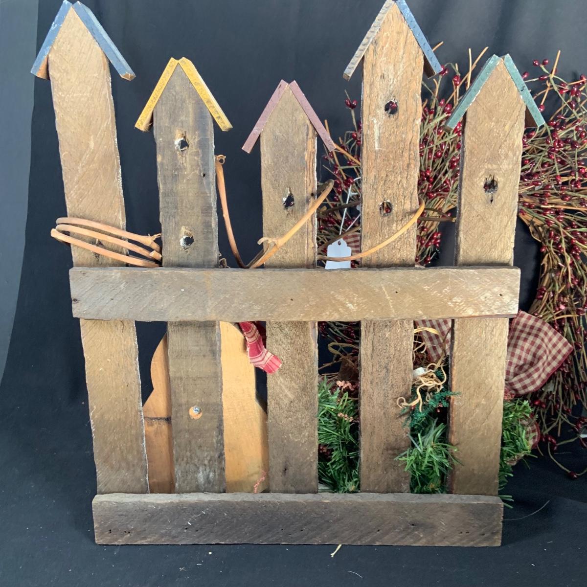 LOT:18:Rustic/ Primitive Winter Decor Including Birdhouse Fence, Birdhouse Angle Snowman Electric Candle Holder, Wreath and More