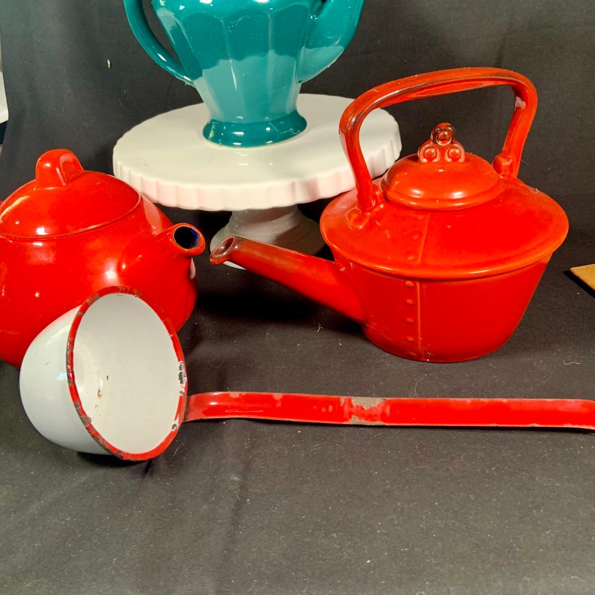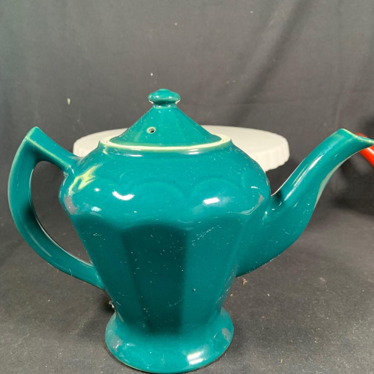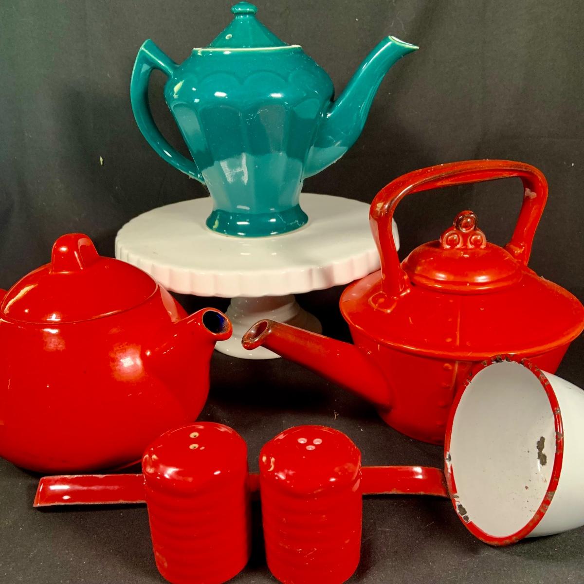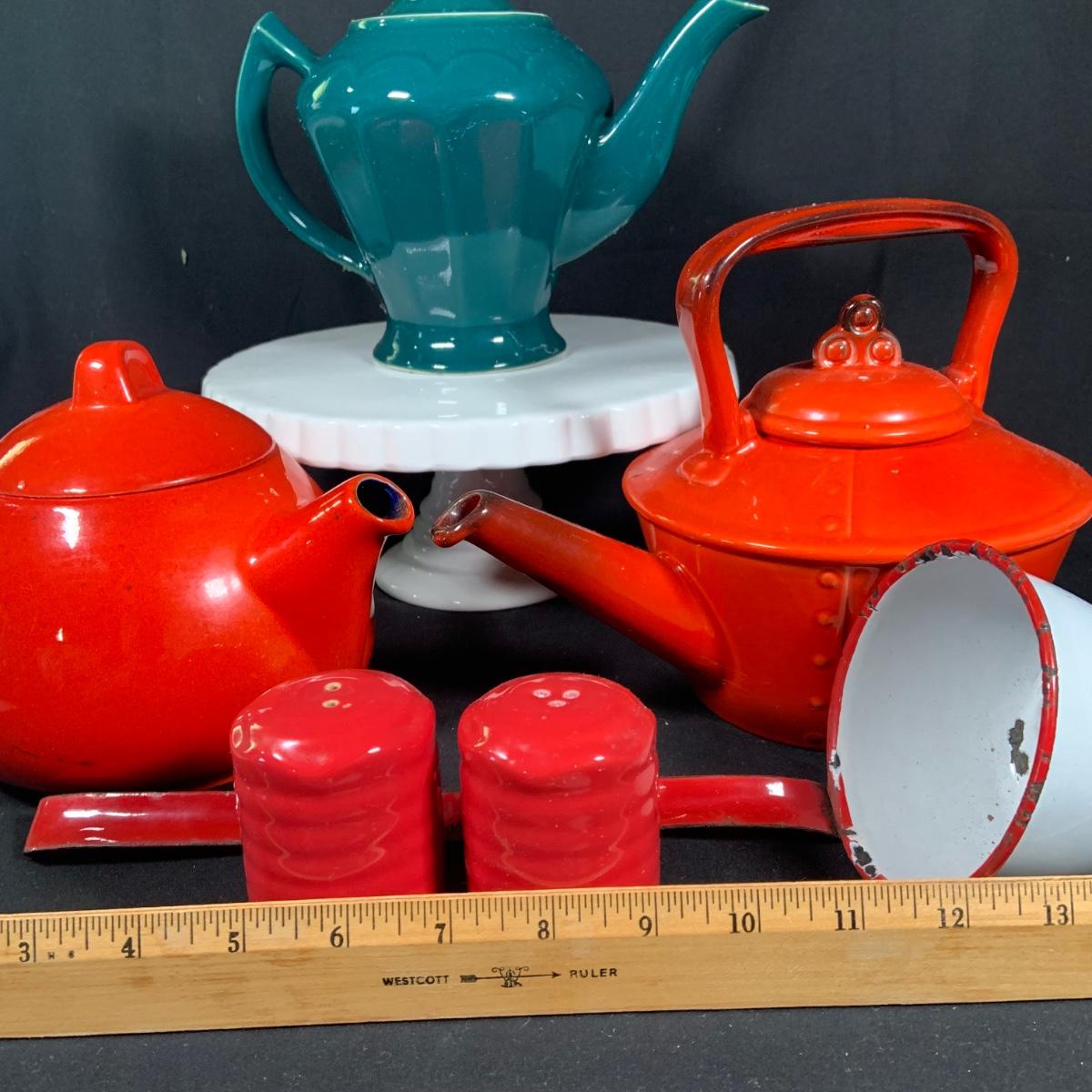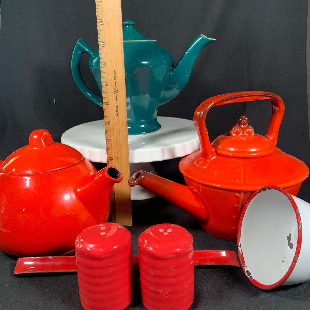LOT:27: Vintage Teapots Featuring Hall and Others, a Metal Ladle, Salt and Pepper Shakers and Cake Plate
