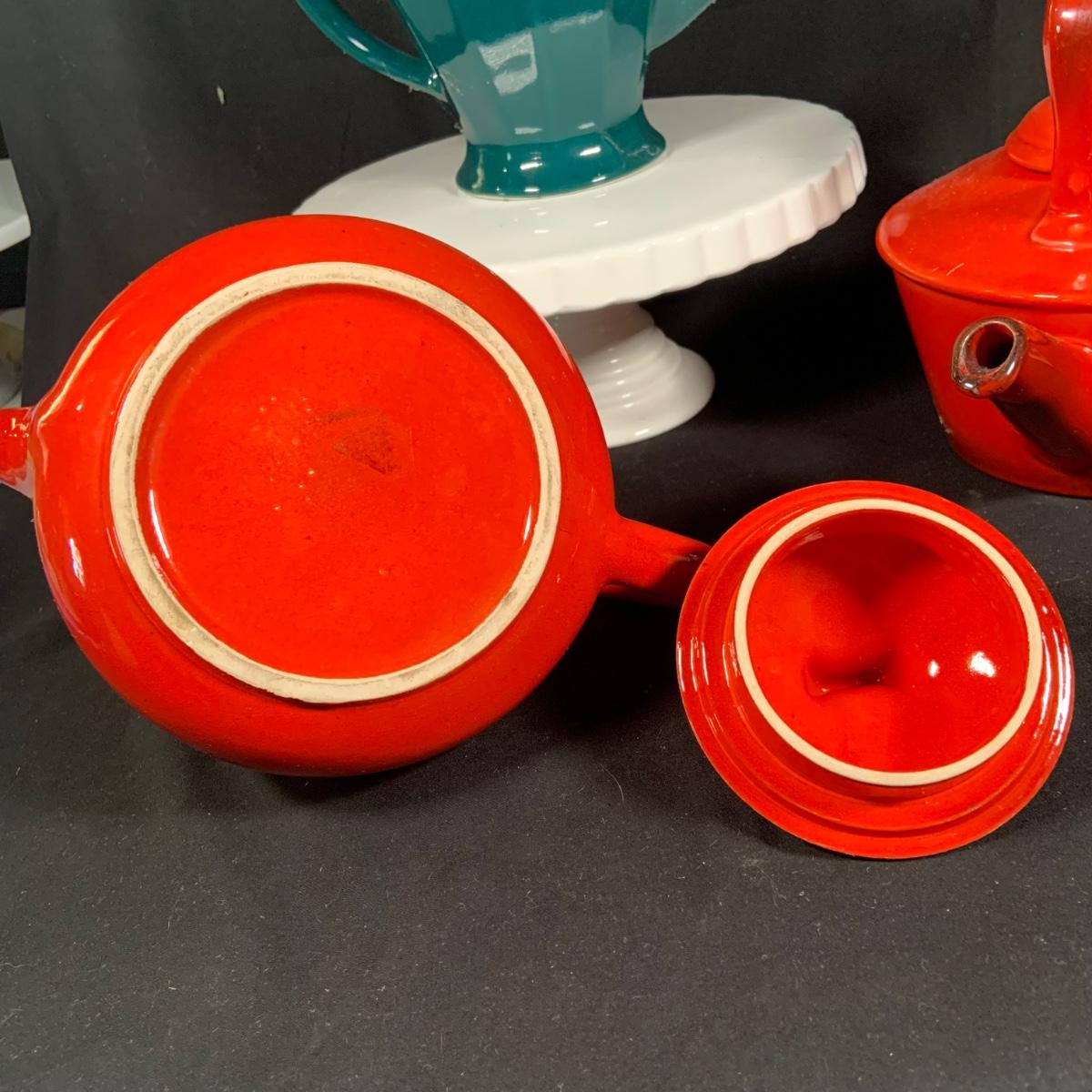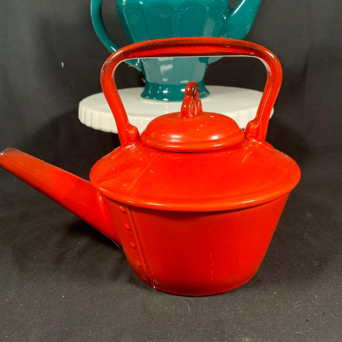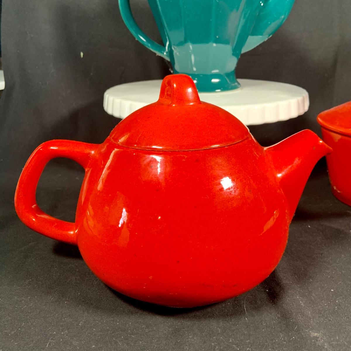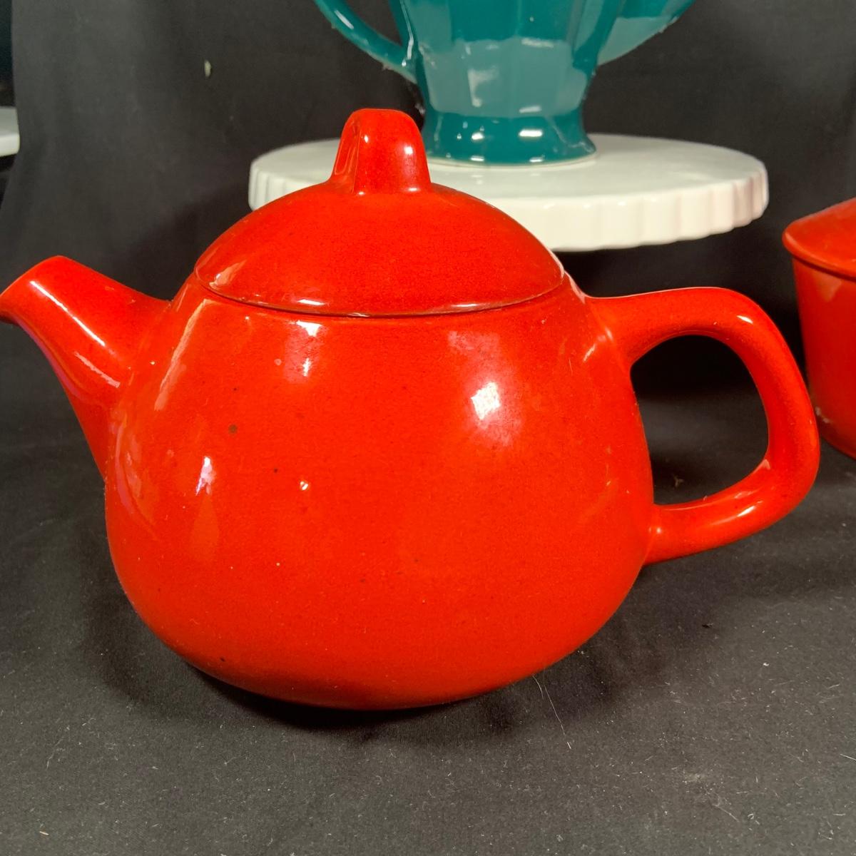 LOT:27: Vintage Teapots Featuring Hall and Others, a Metal Ladle, Salt and Pepper Shakers and Cake Plate