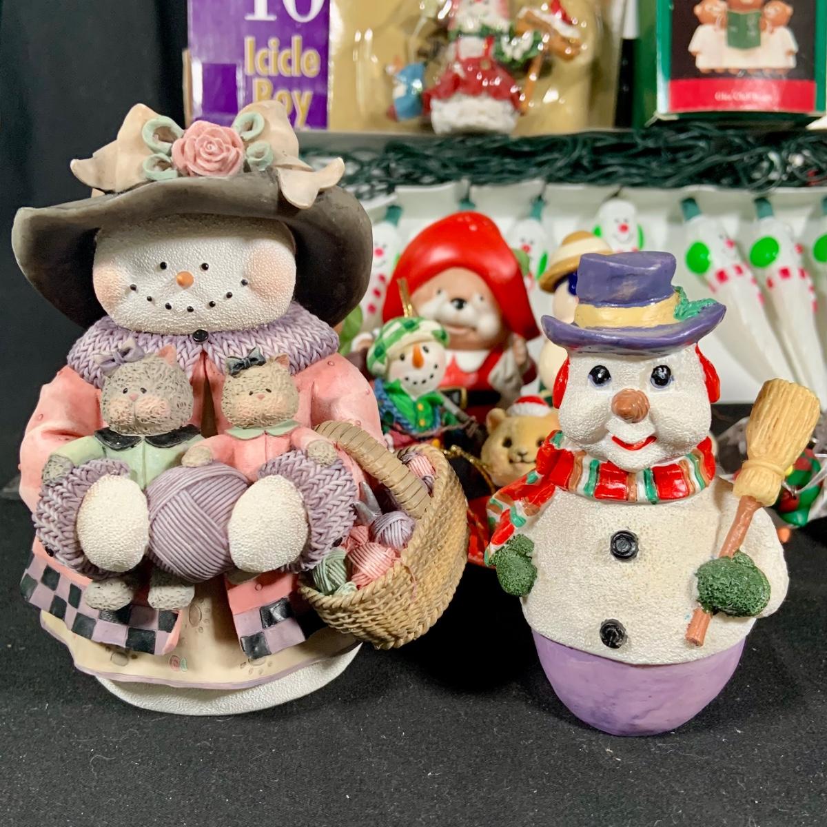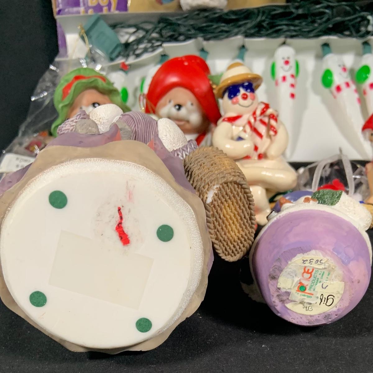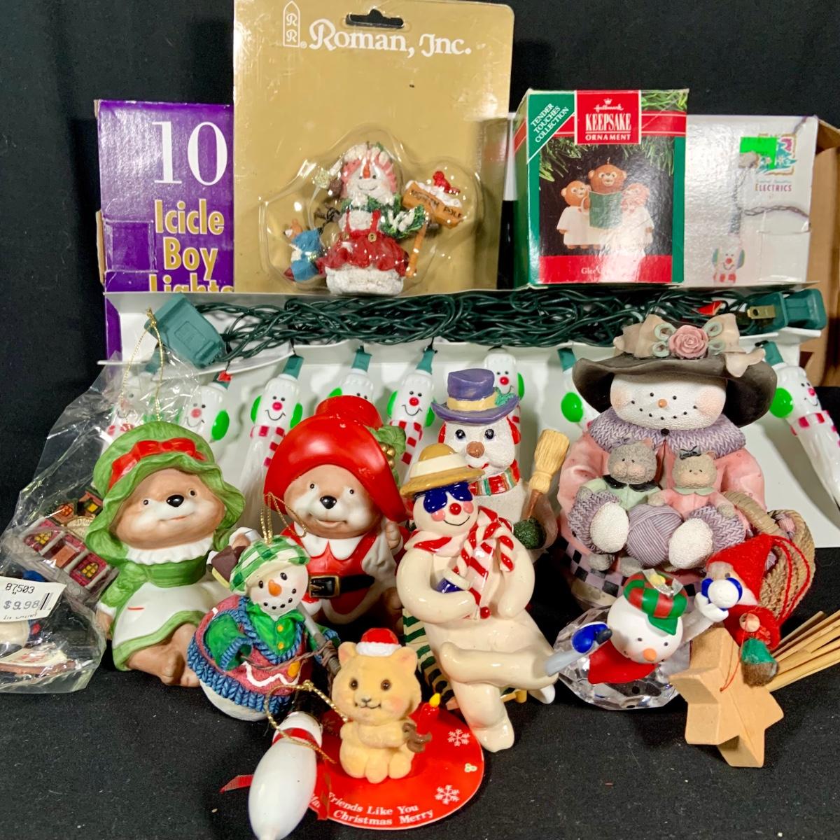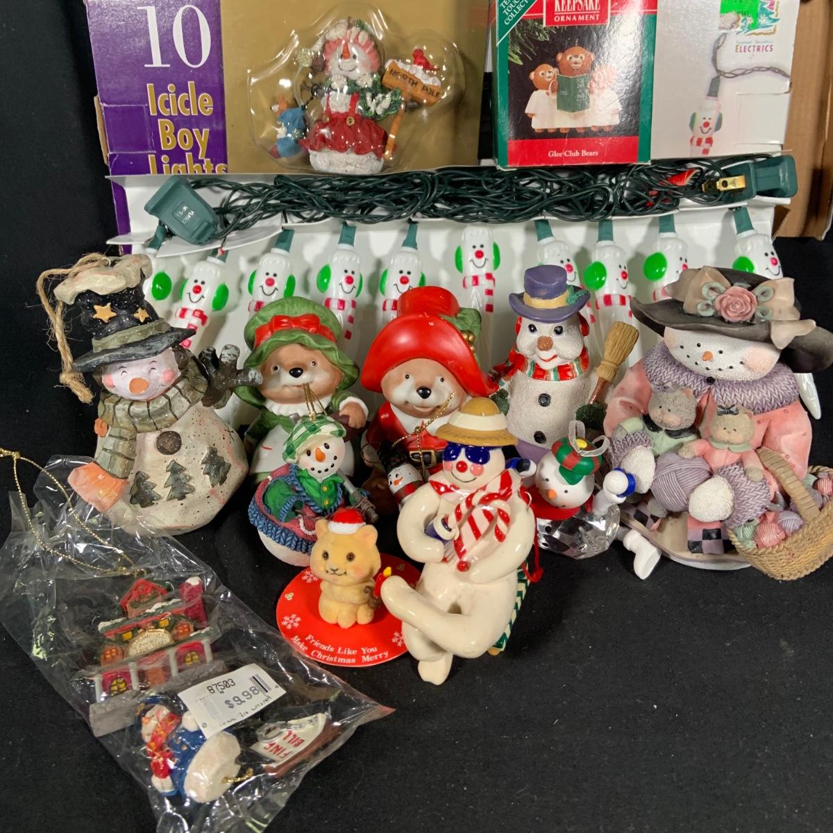 LOT:28: Vintage Holiday Decorations Including Snowman Icicle Lights, Homco Bears, Hallmark and More