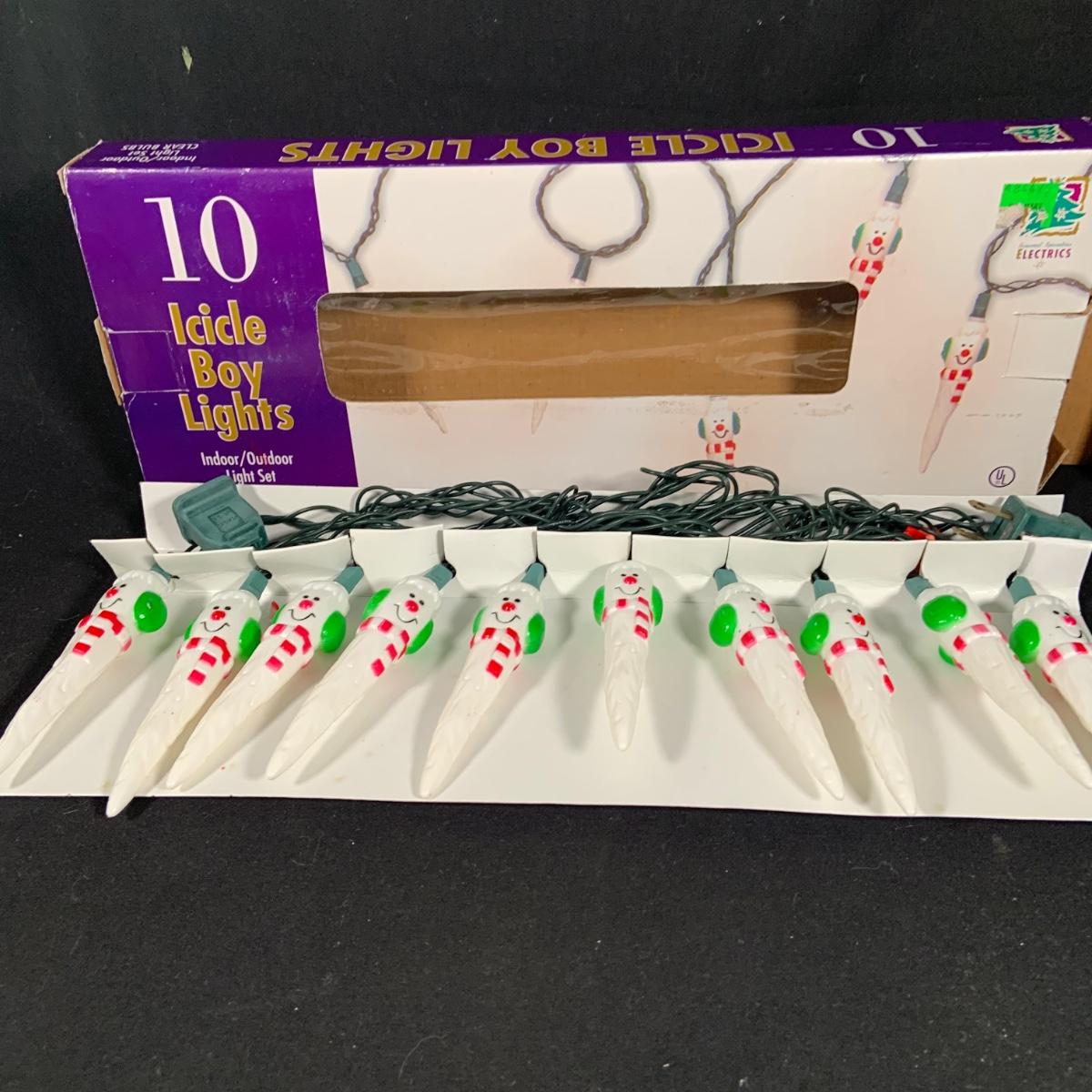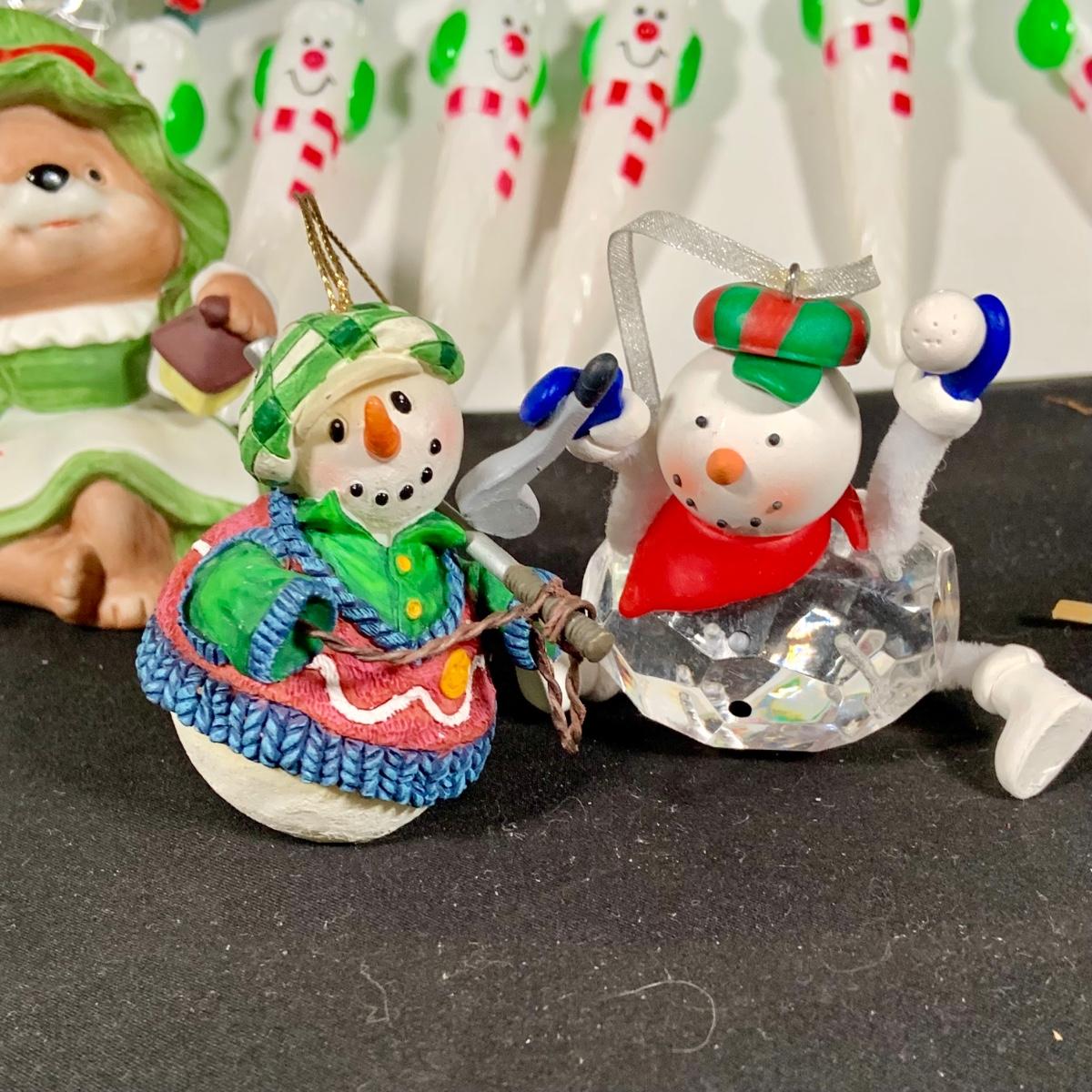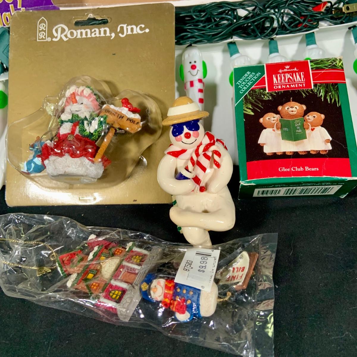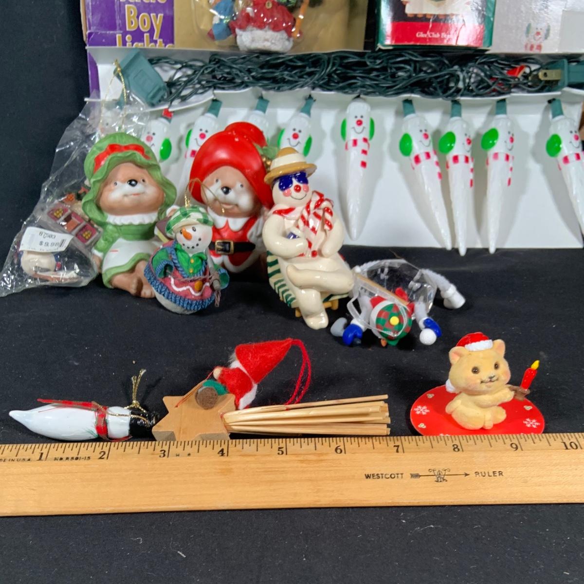 LOT:28: Vintage Holiday Decorations Including Snowman Icicle Lights, Homco Bears, Hallmark and More
