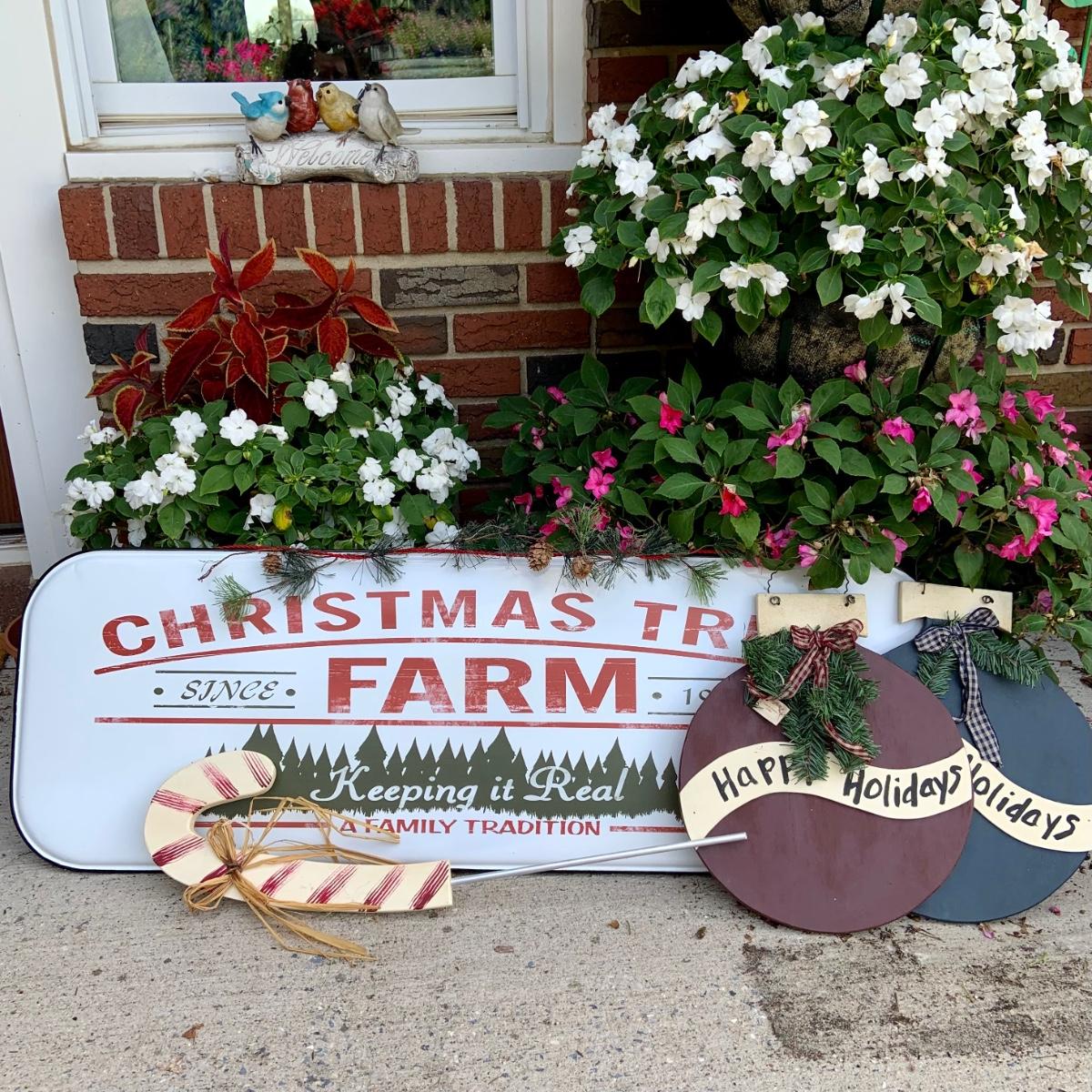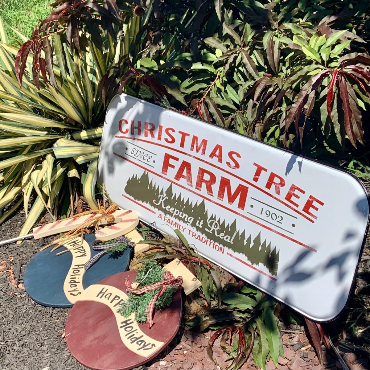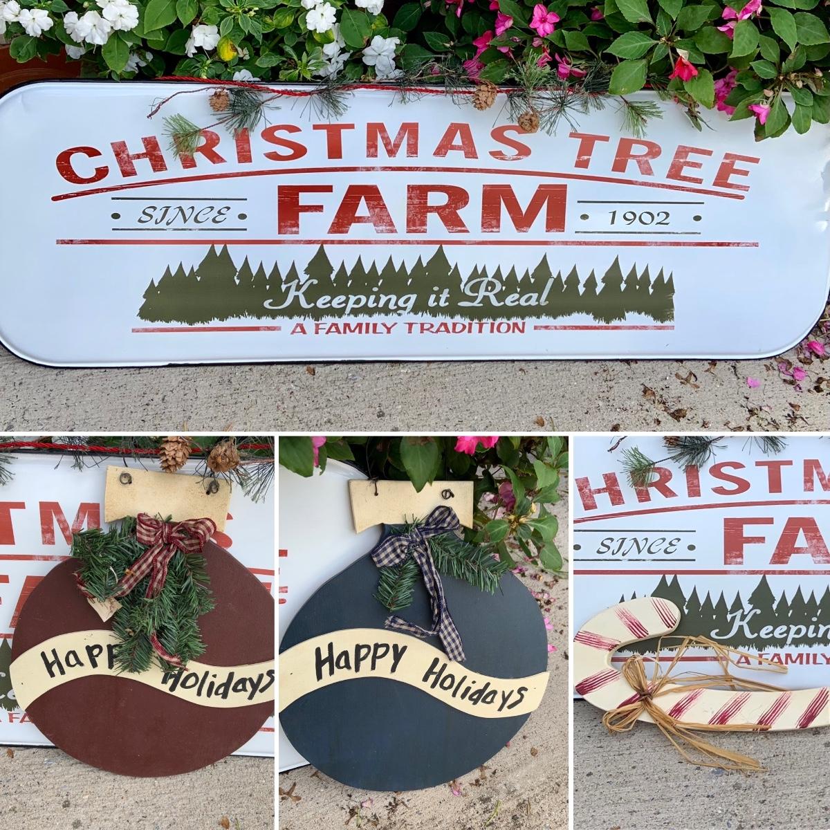 LOT:36: Large Christmas Tree Farm Metal Sign and Large Wood Holiday Decorations