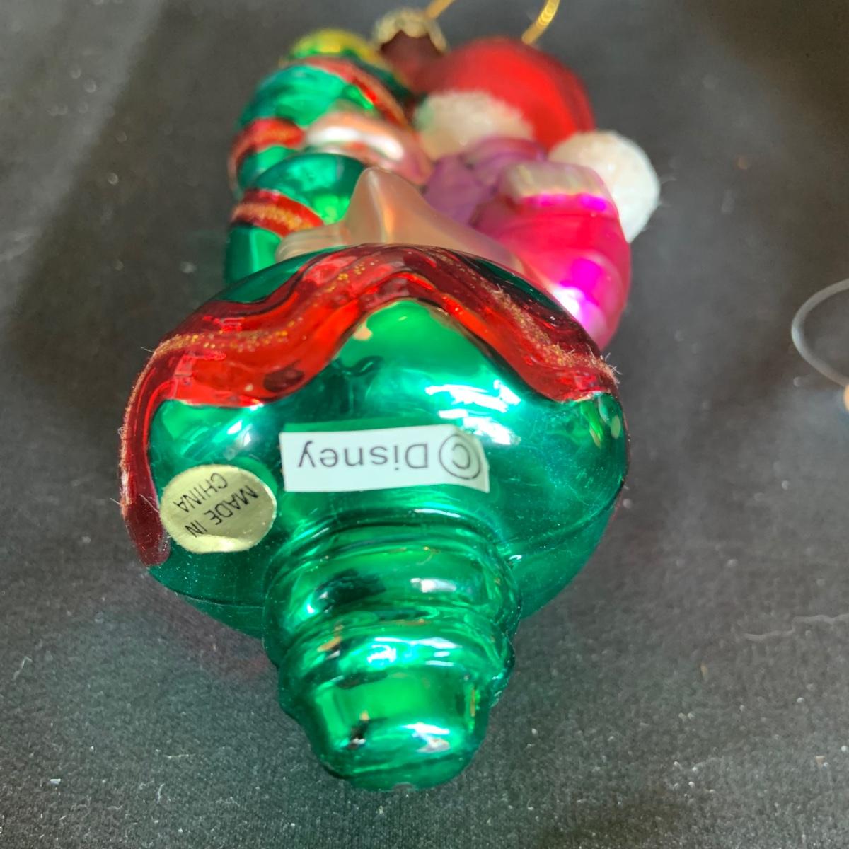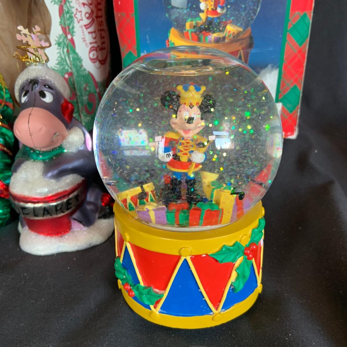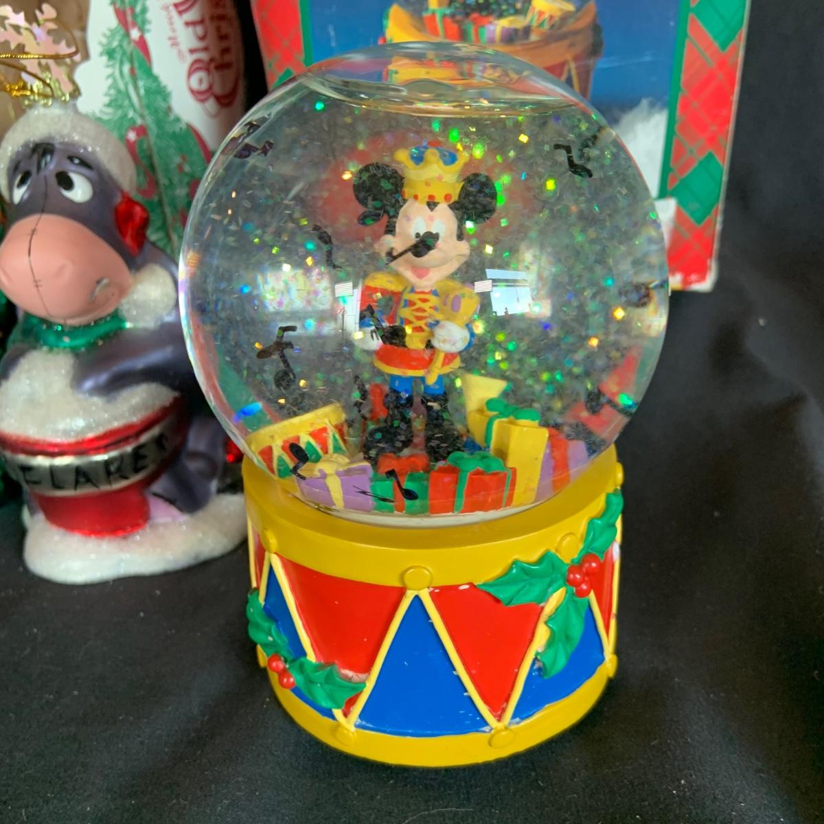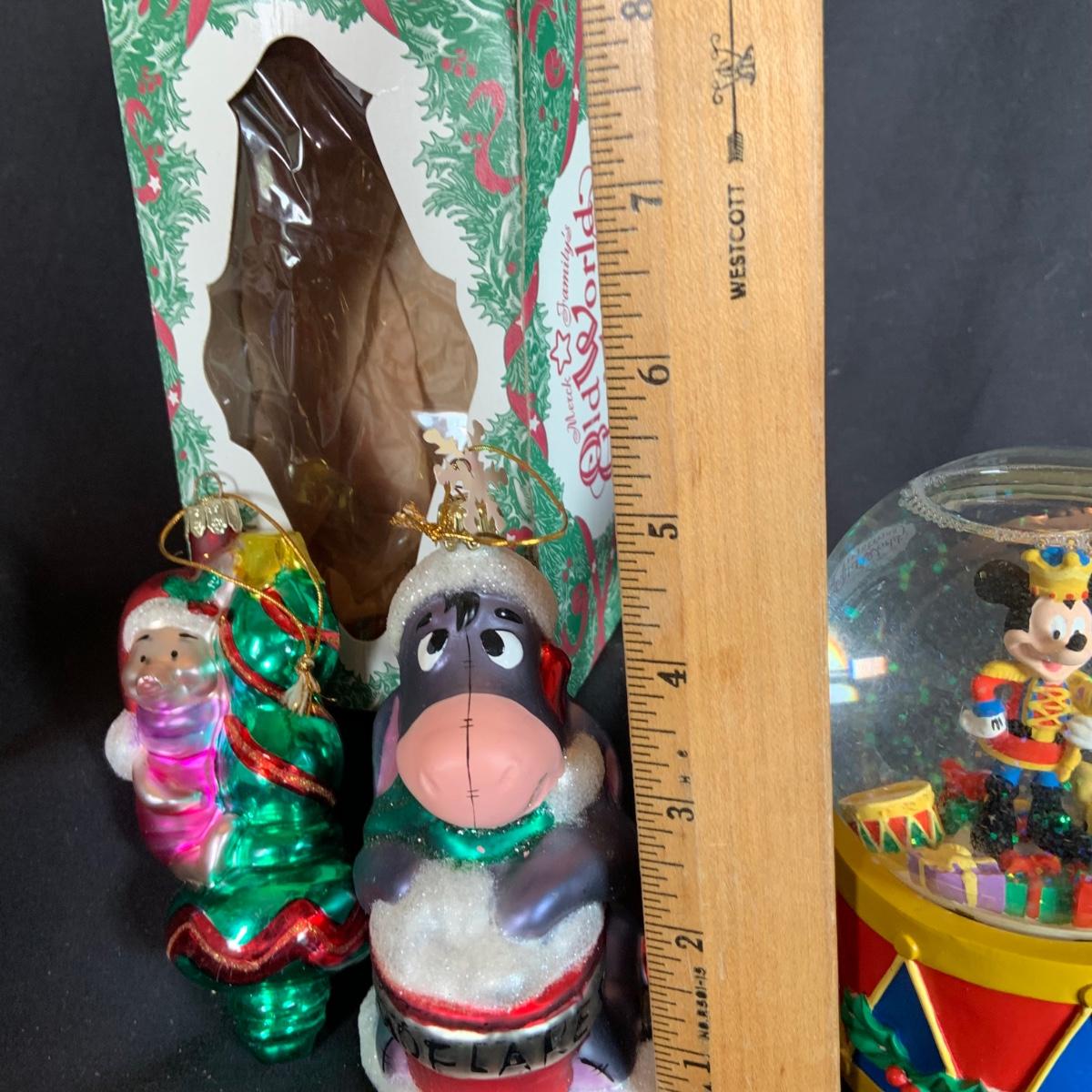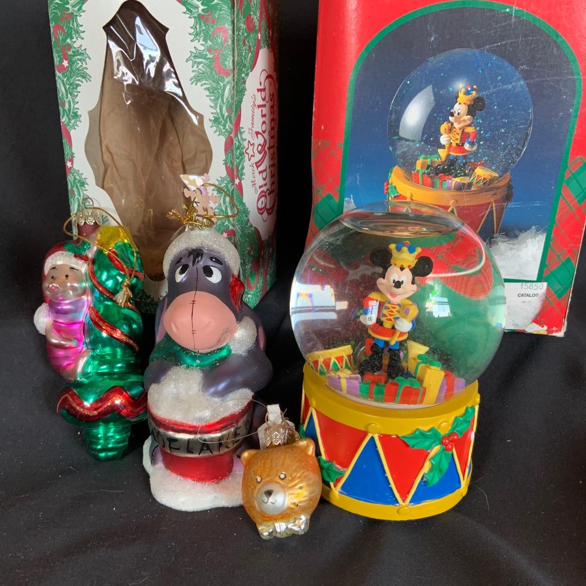 LOT:57: Disney Glass Ornaments, Mickey Mouse Holiday Snow Globe and Dept 56 Glass Bear Head