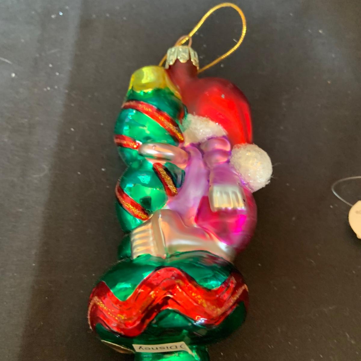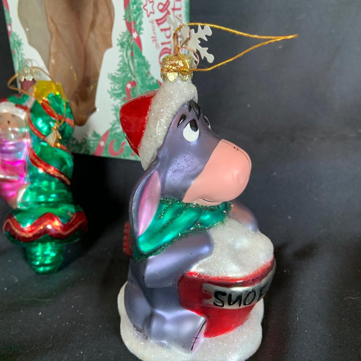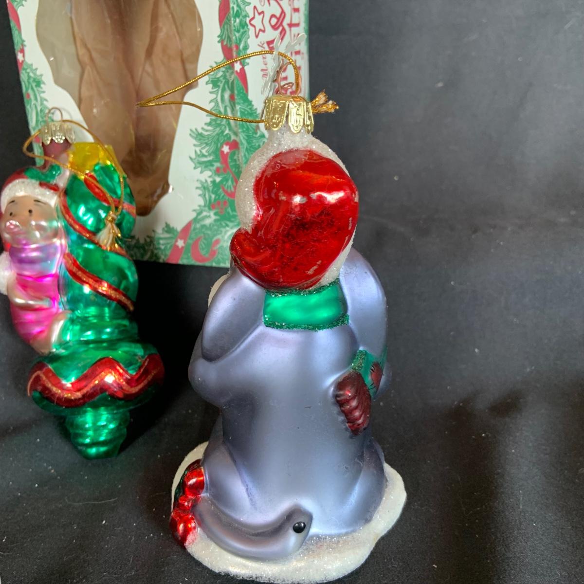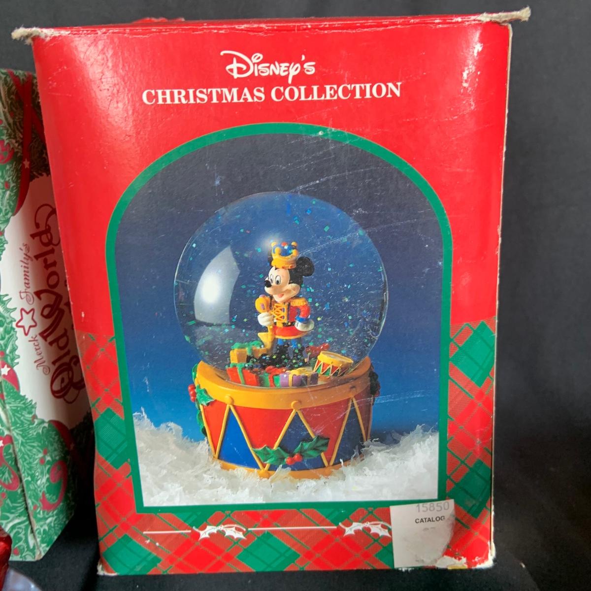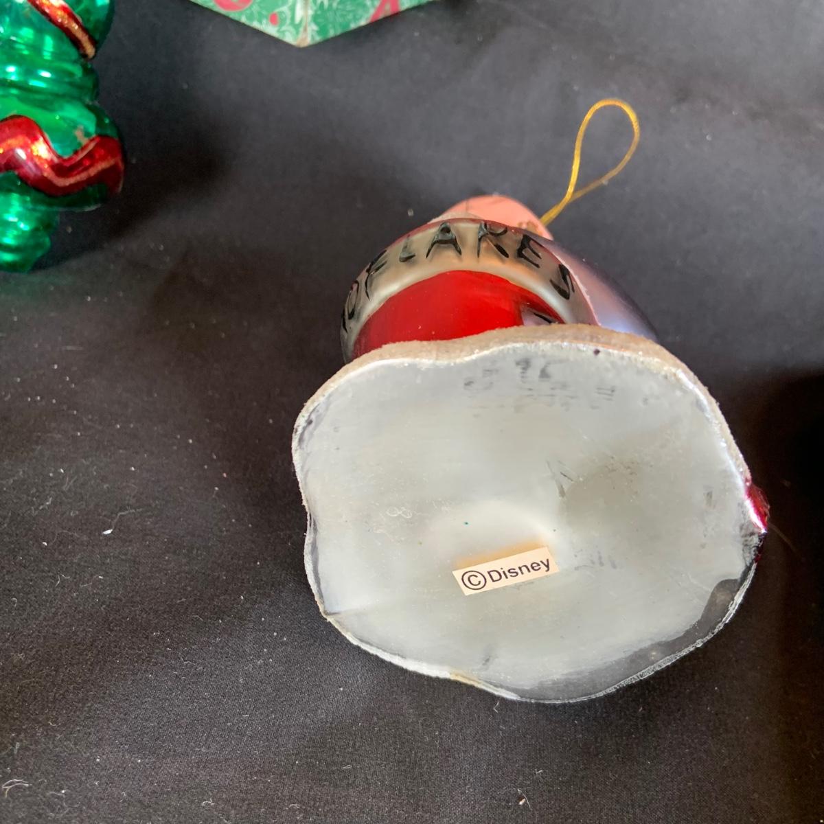 LOT:57: Disney Glass Ornaments, Mickey Mouse Holiday Snow Globe and Dept 56 Glass Bear Head