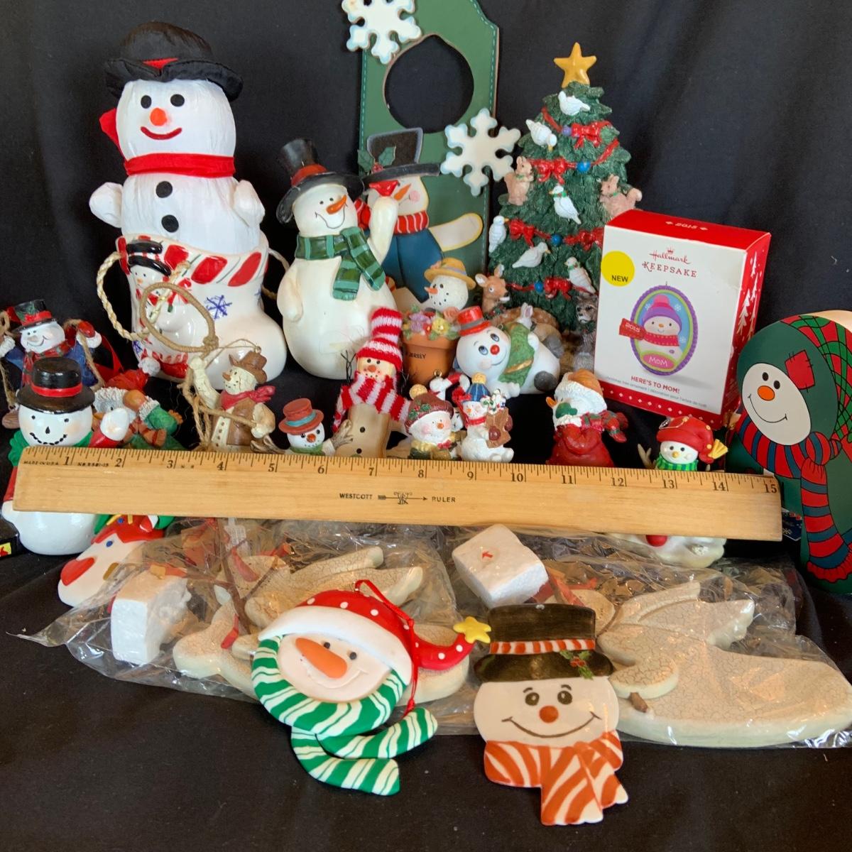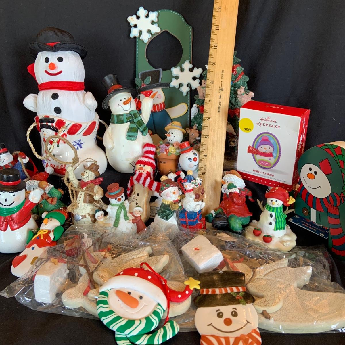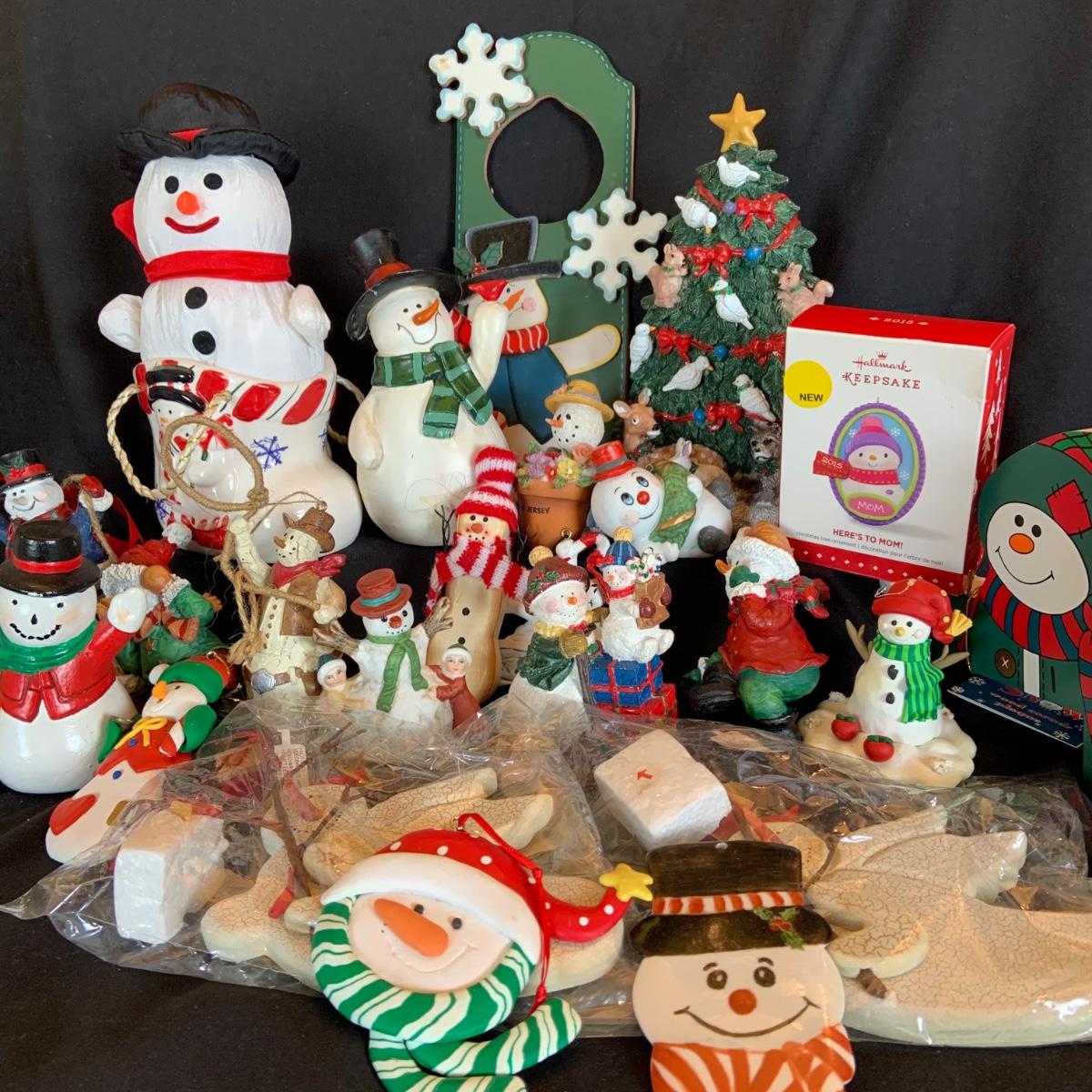 LOT:65: Seasonal Holiday Snowmen Decorations, Ornaments from Hallmark and Dept 56 and More