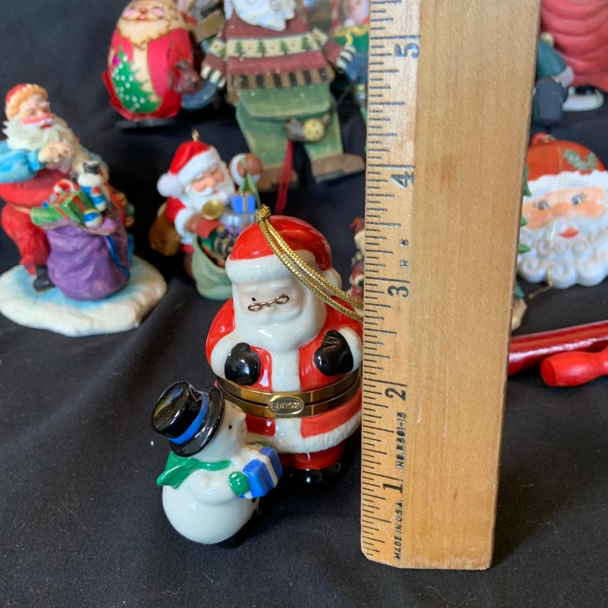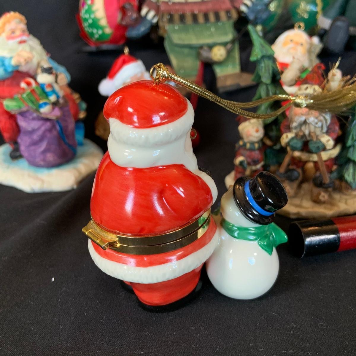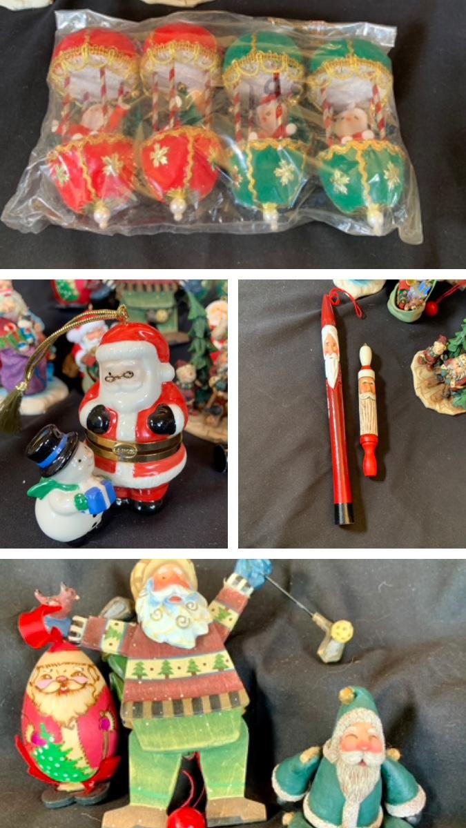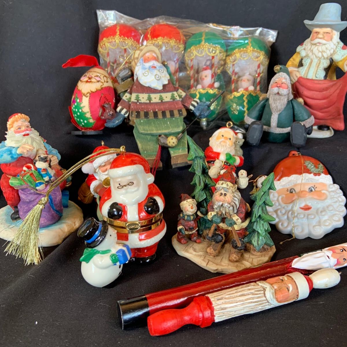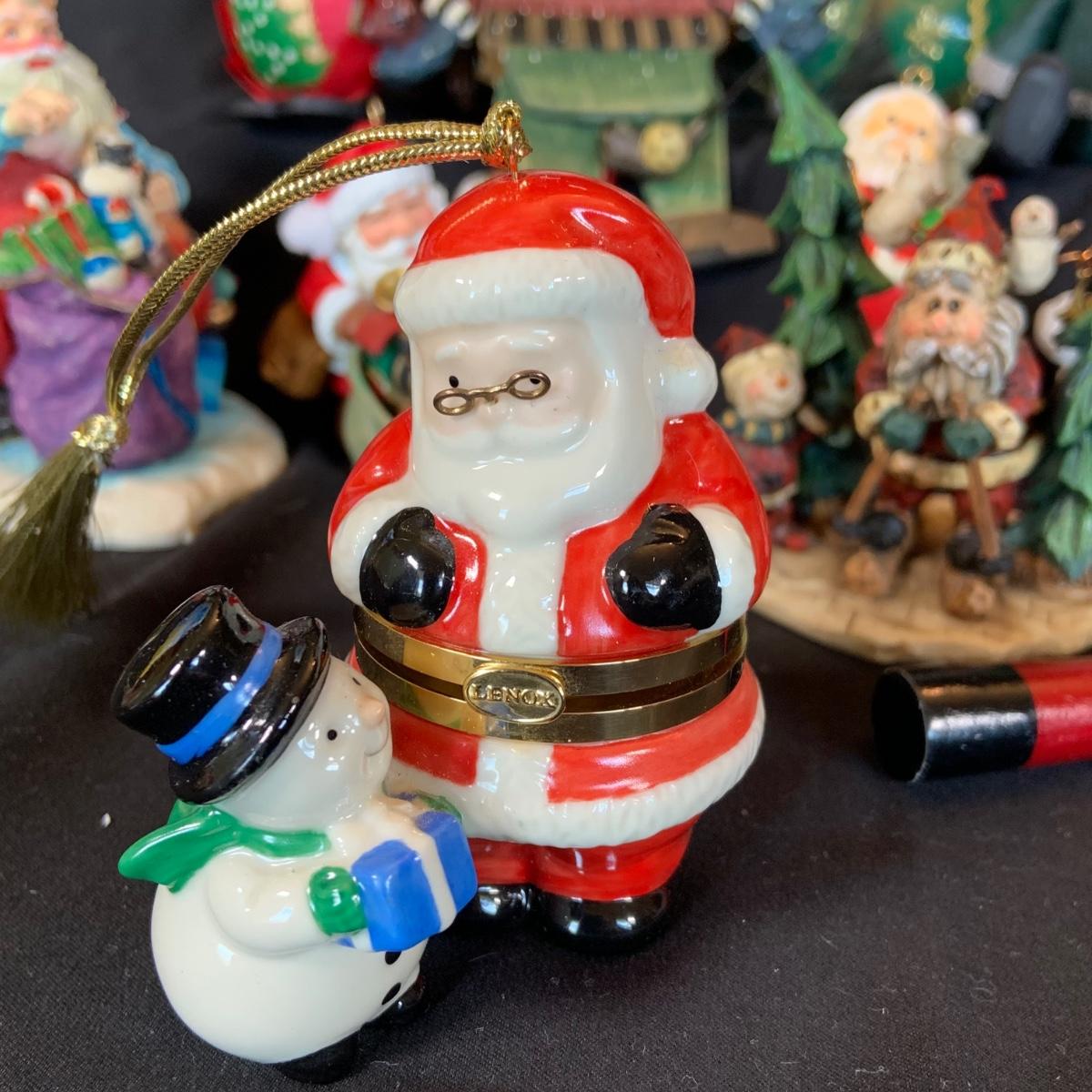LOT:67: Vintage Santa Decorations, Featuring Lenox Trinket Box, Unopened Santa Balloon Ornments, Wooden Ornaments, Figurines and More