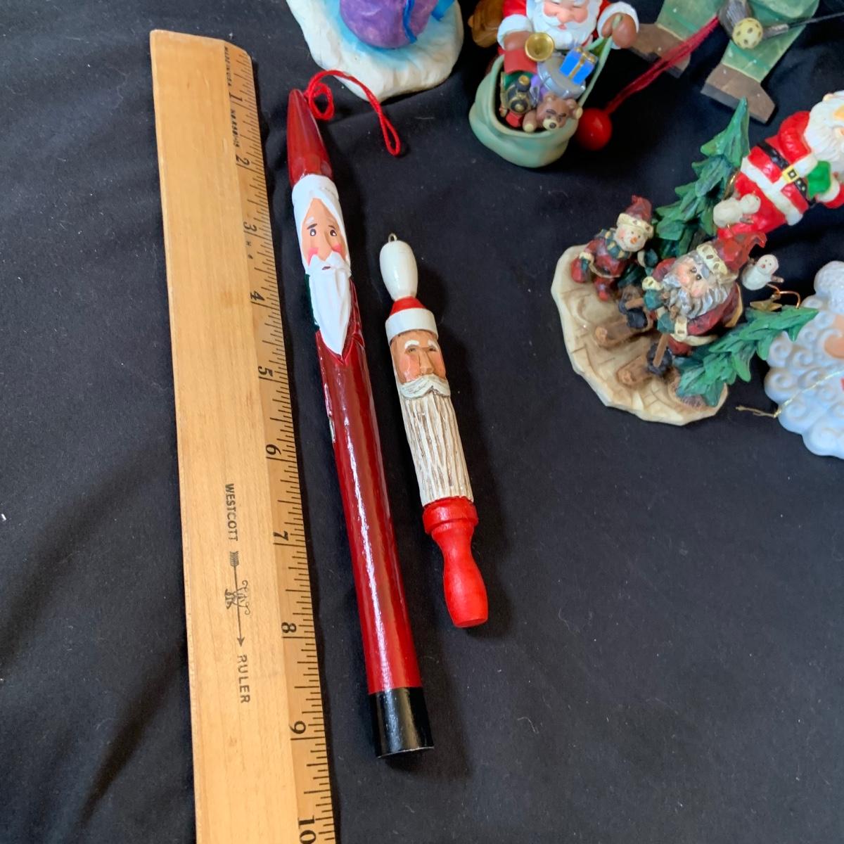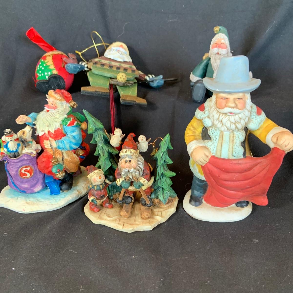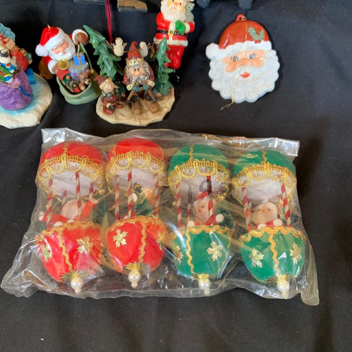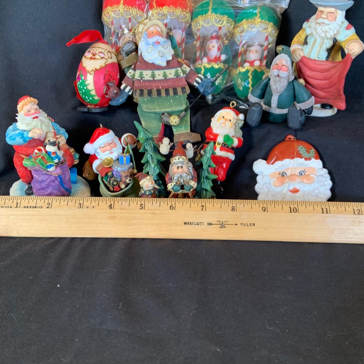 LOT:67: Vintage Santa Decorations, Featuring Lenox Trinket Box, Unopened Santa Balloon Ornments, Wooden Ornaments, Figurines and More