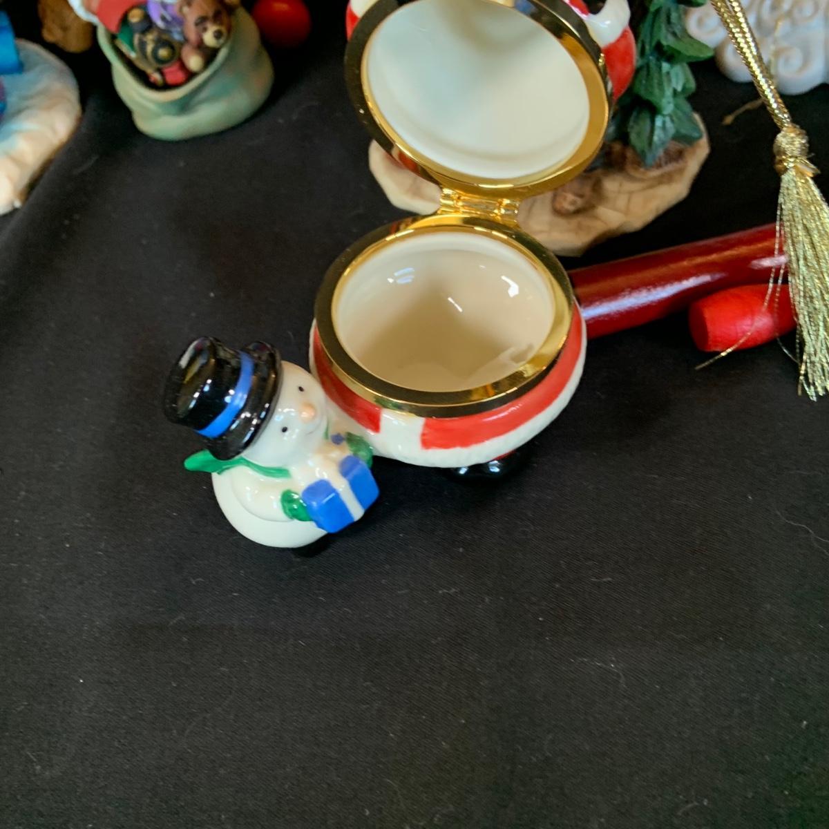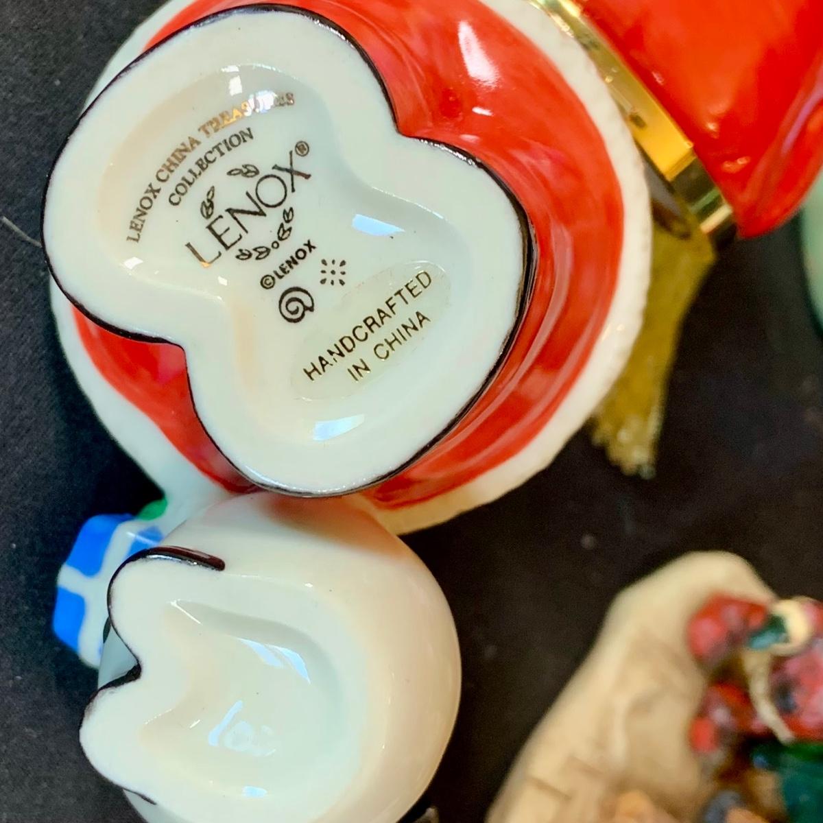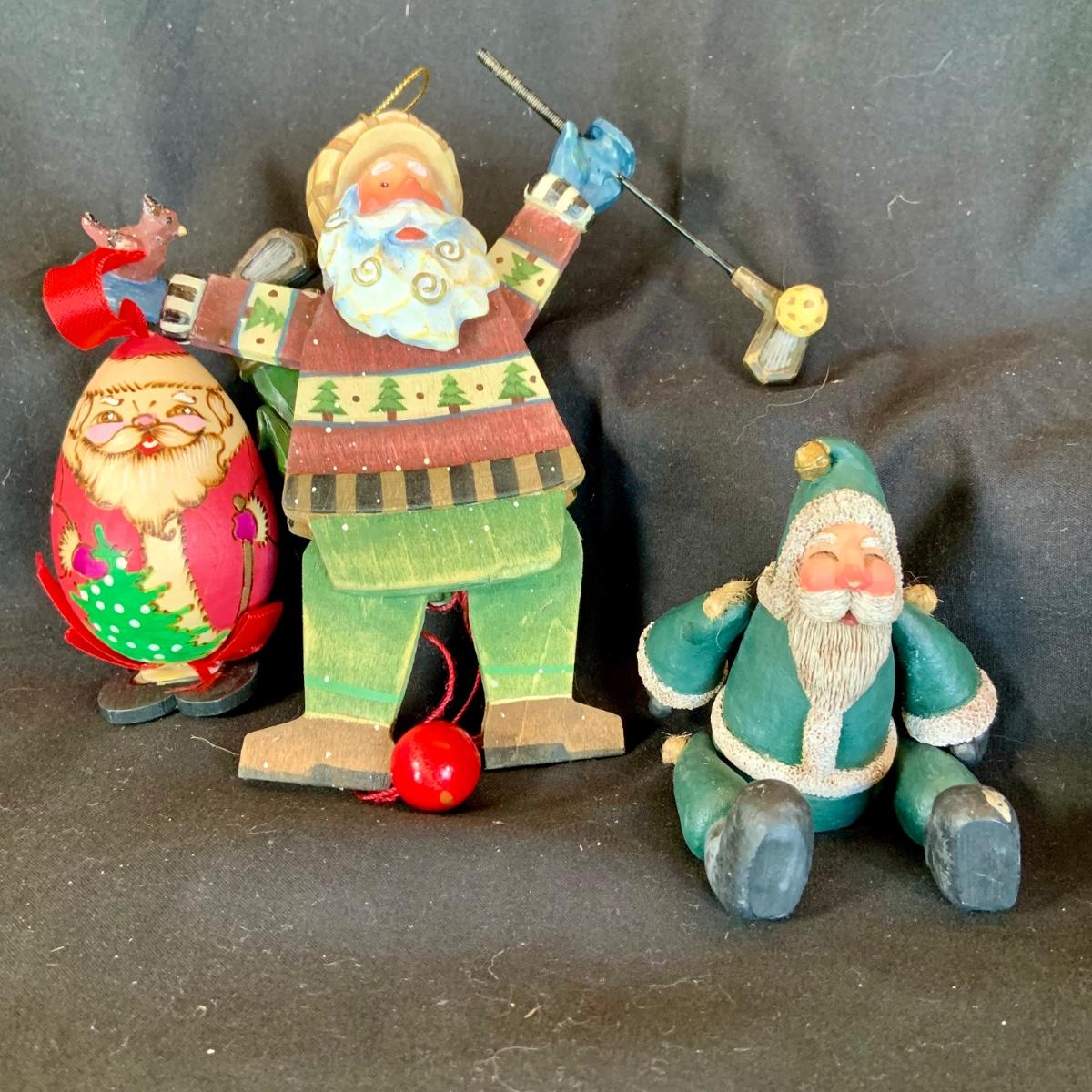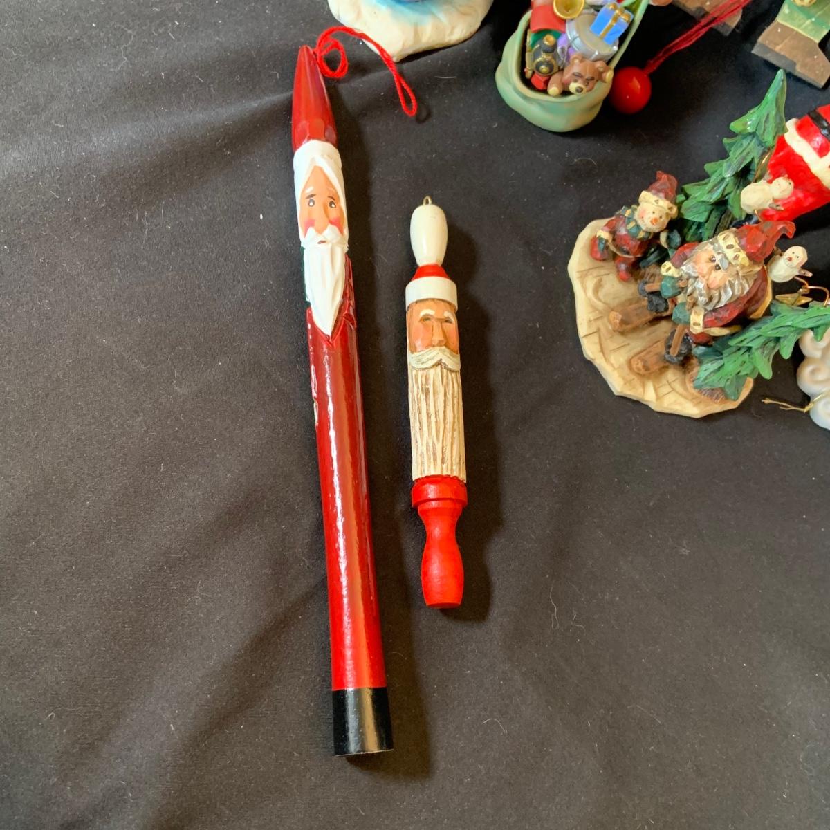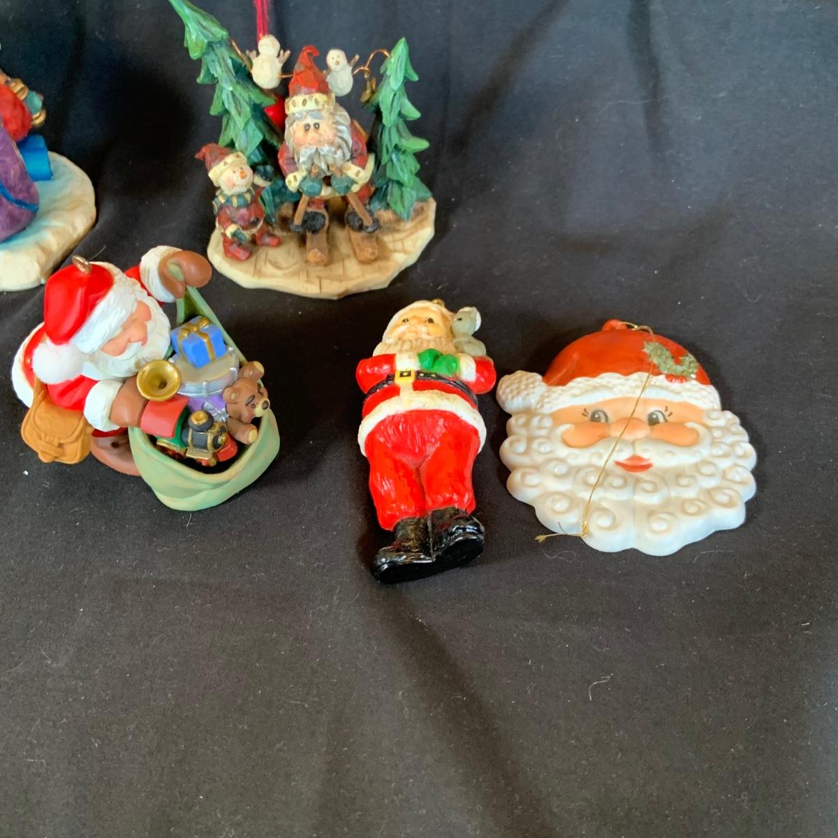 LOT:67: Vintage Santa Decorations, Featuring Lenox Trinket Box, Unopened Santa Balloon Ornments, Wooden Ornaments, Figurines and More