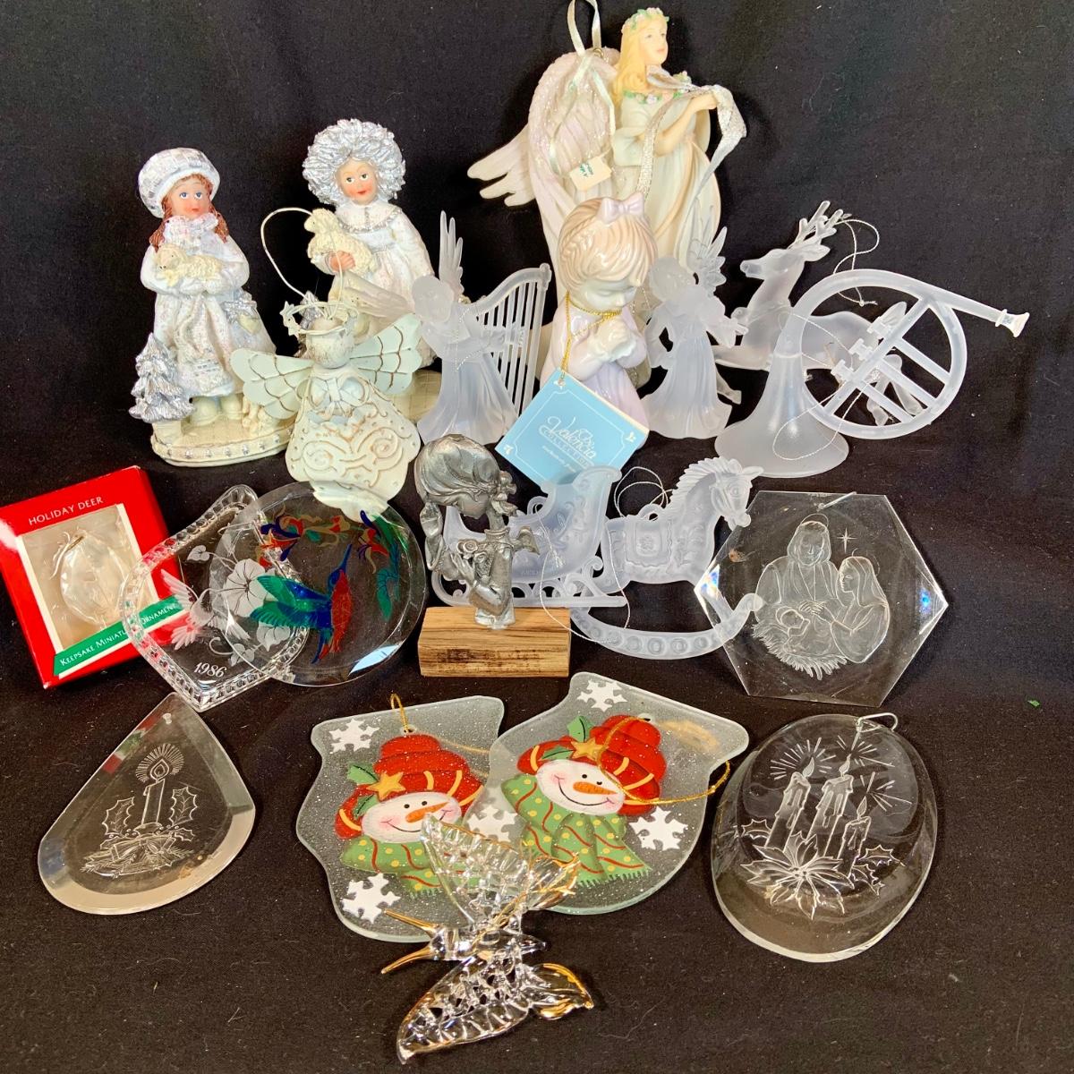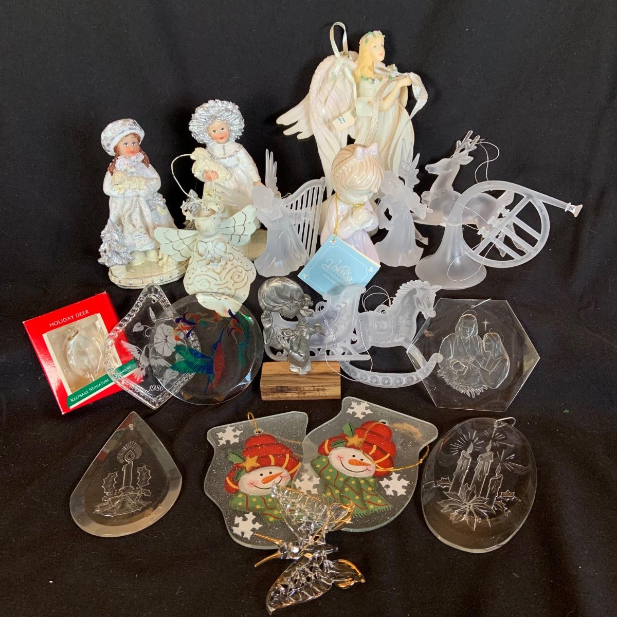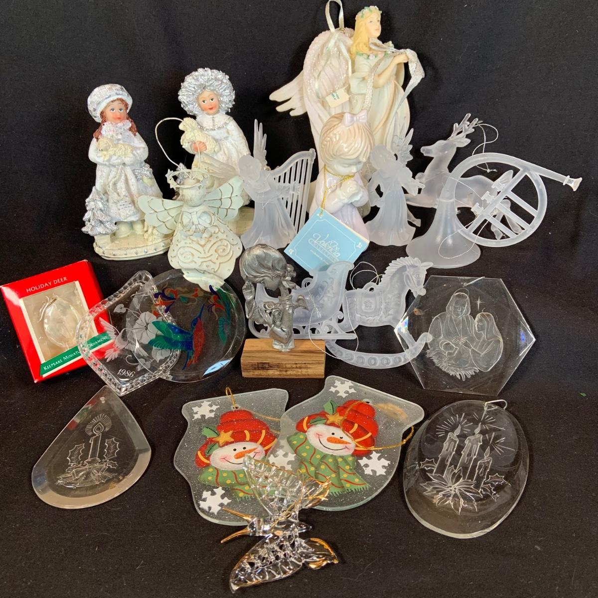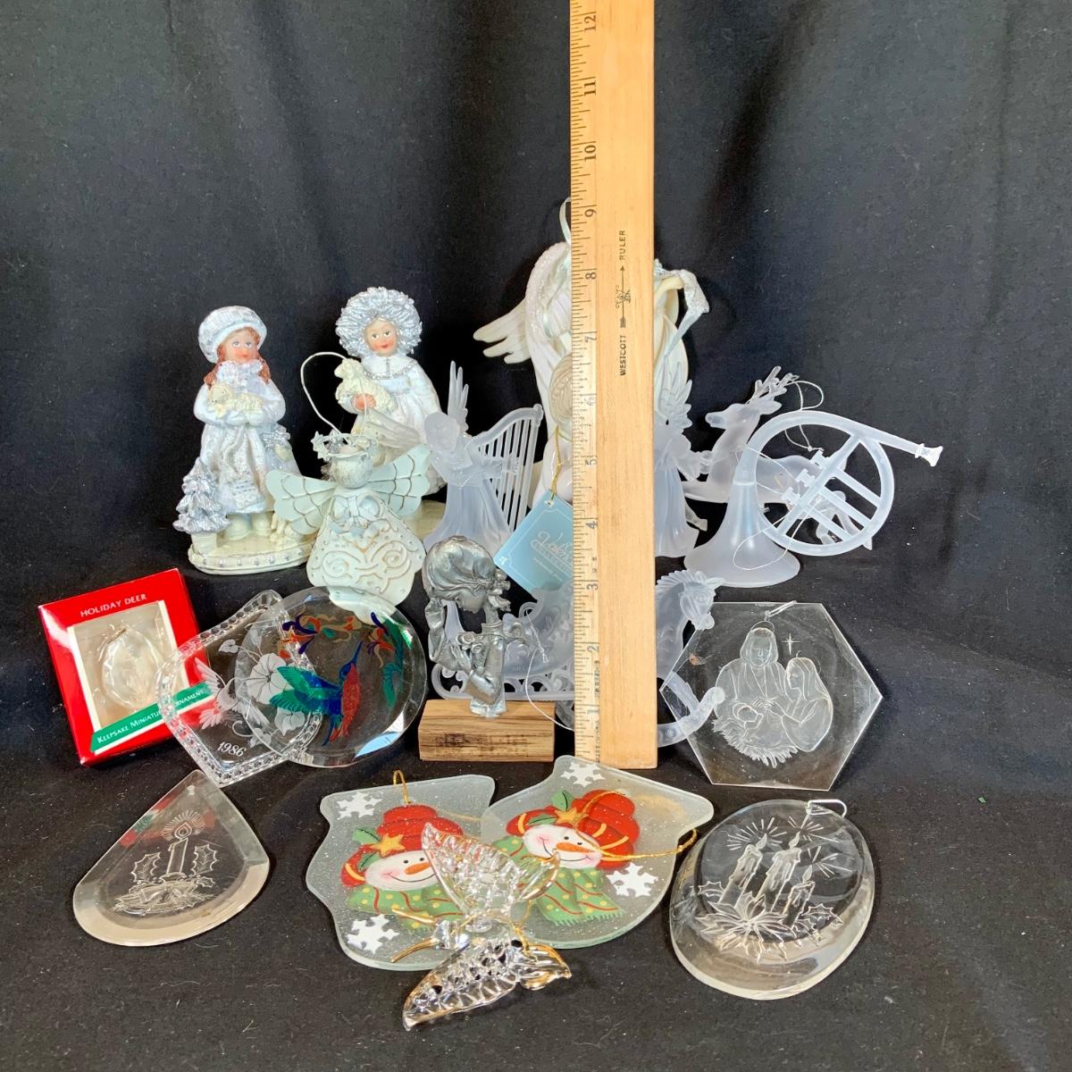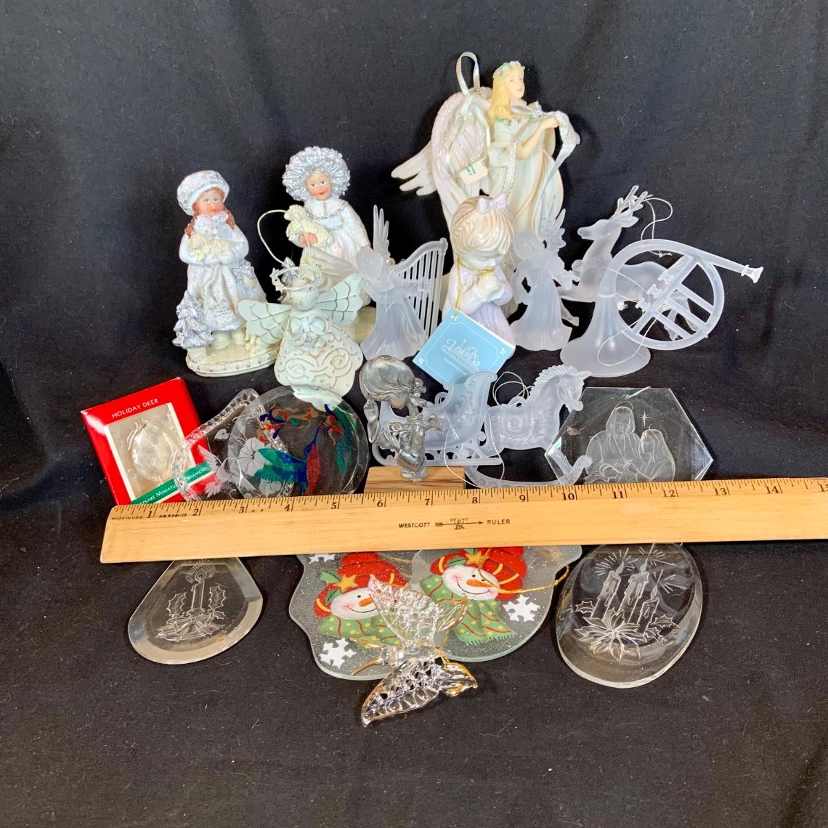 LOT:69: Acrylic Etched Ornaments, Plastic Frosted, Painted Glass Ornaments, Angel Figurines and More
