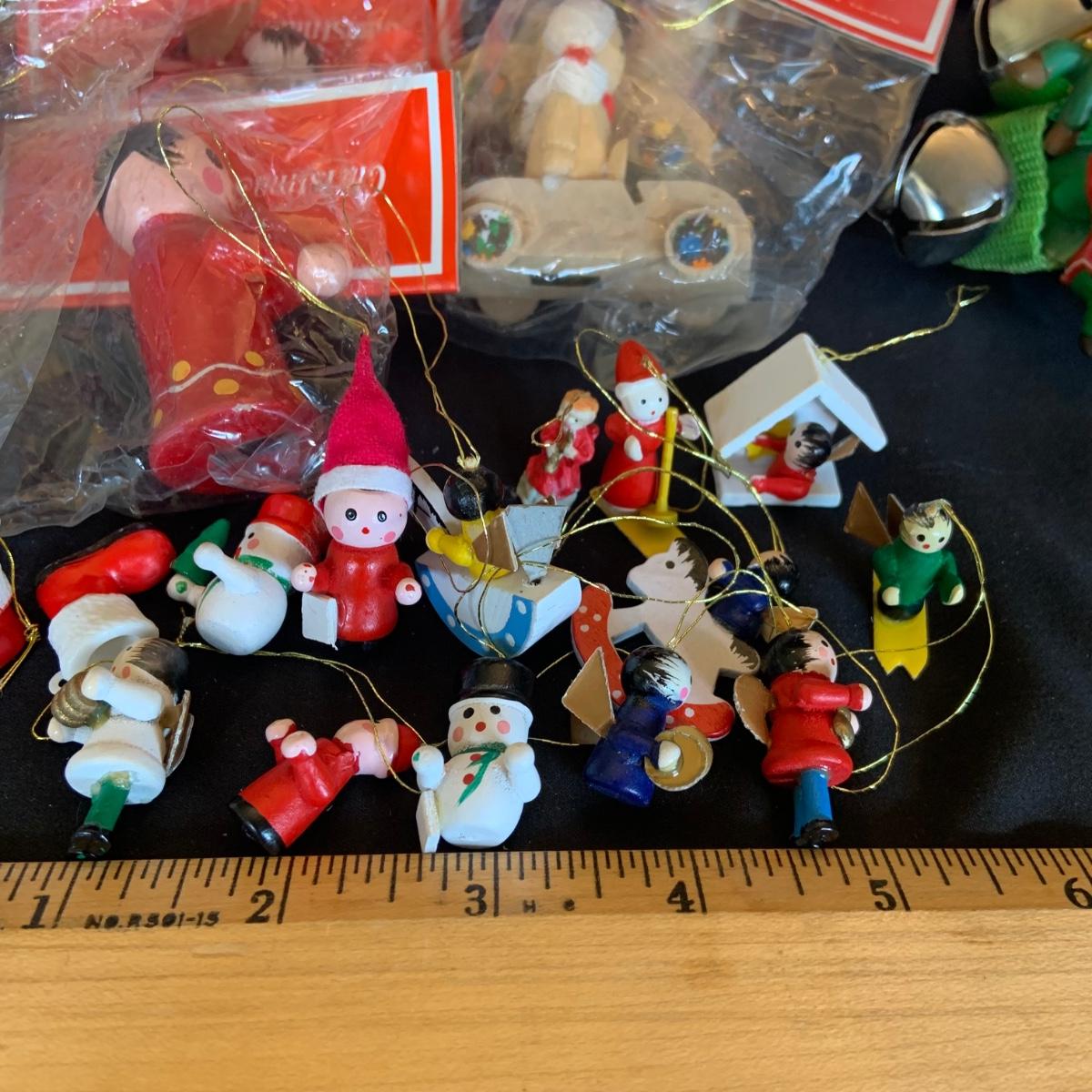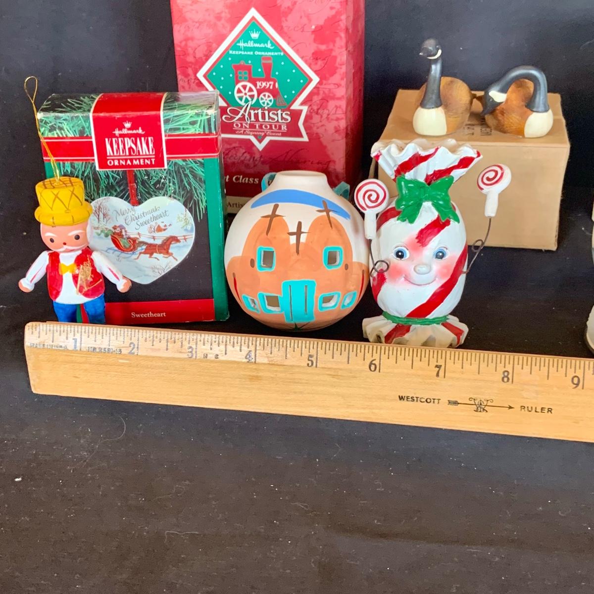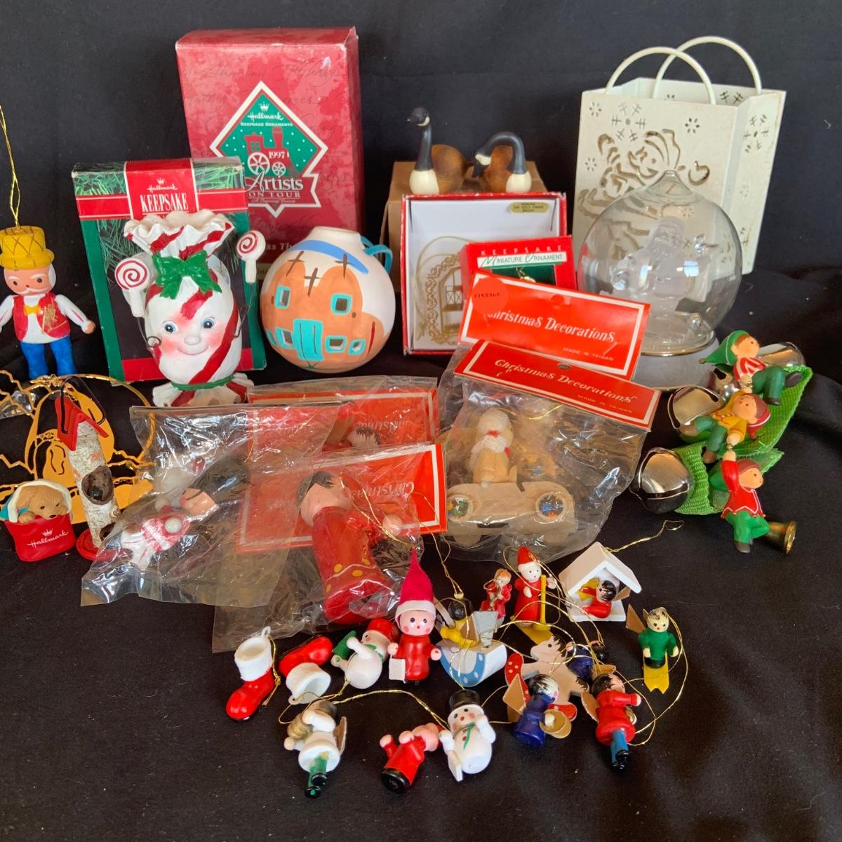 LOT:75: Collection of Assorted Christmas Decoration. Miniture Wooden Ornaments, Hallmark Ornaments and More