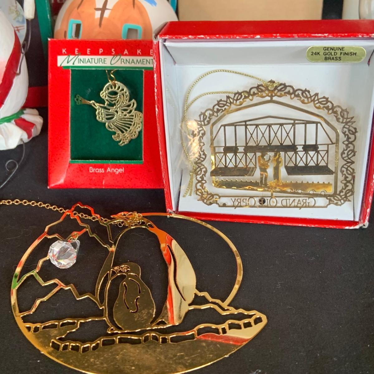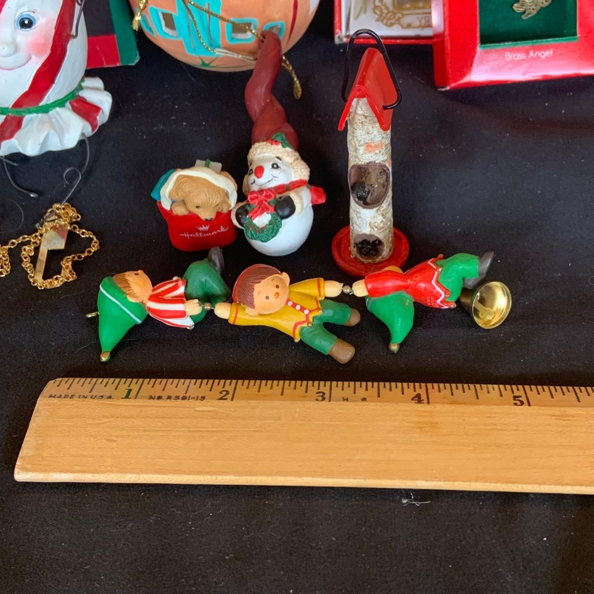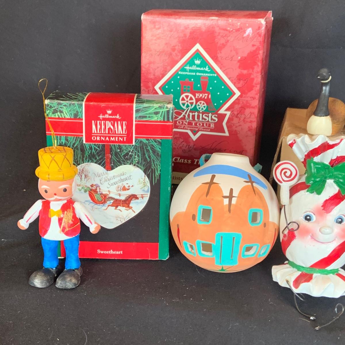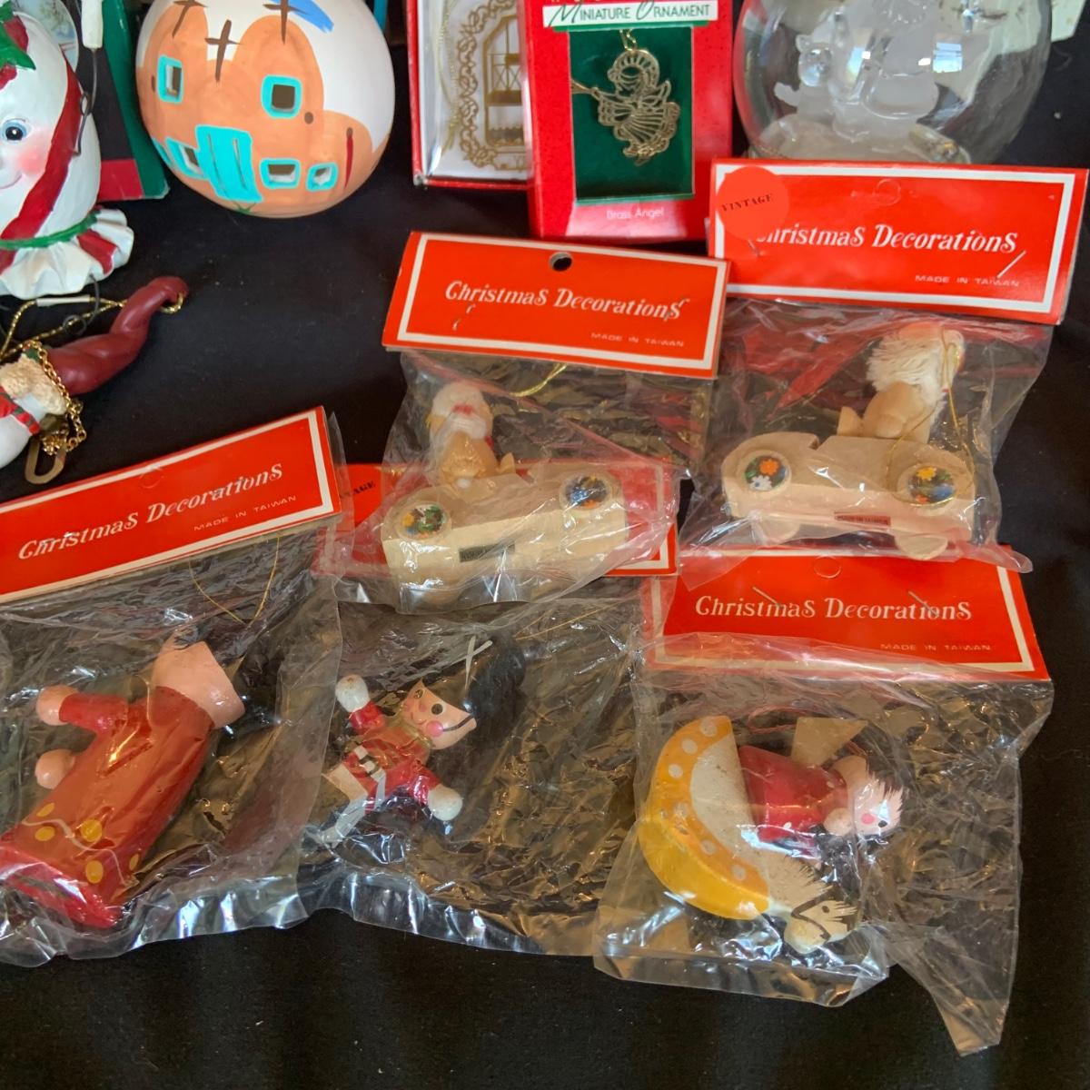 LOT:75: Collection of Assorted Christmas Decoration. Miniture Wooden Ornaments, Hallmark Ornaments and More