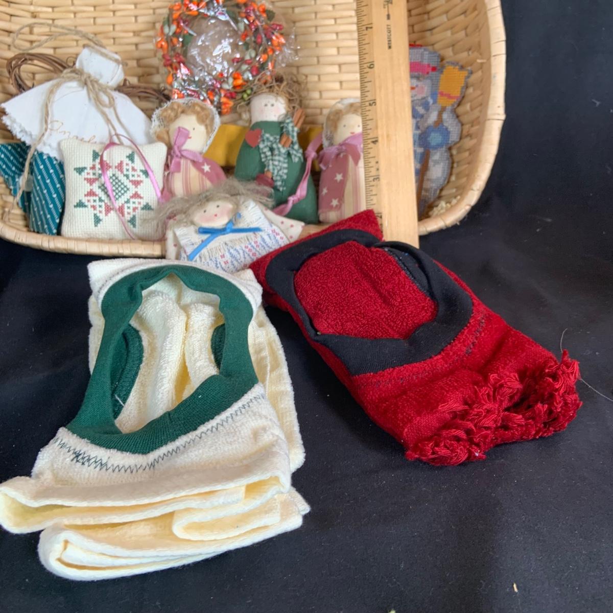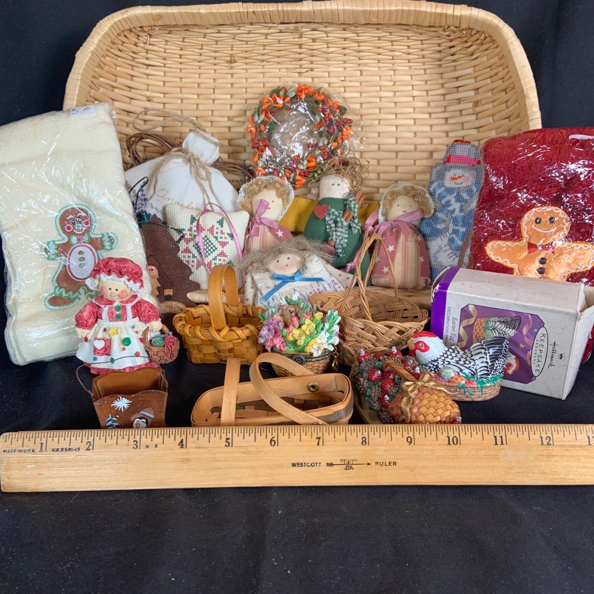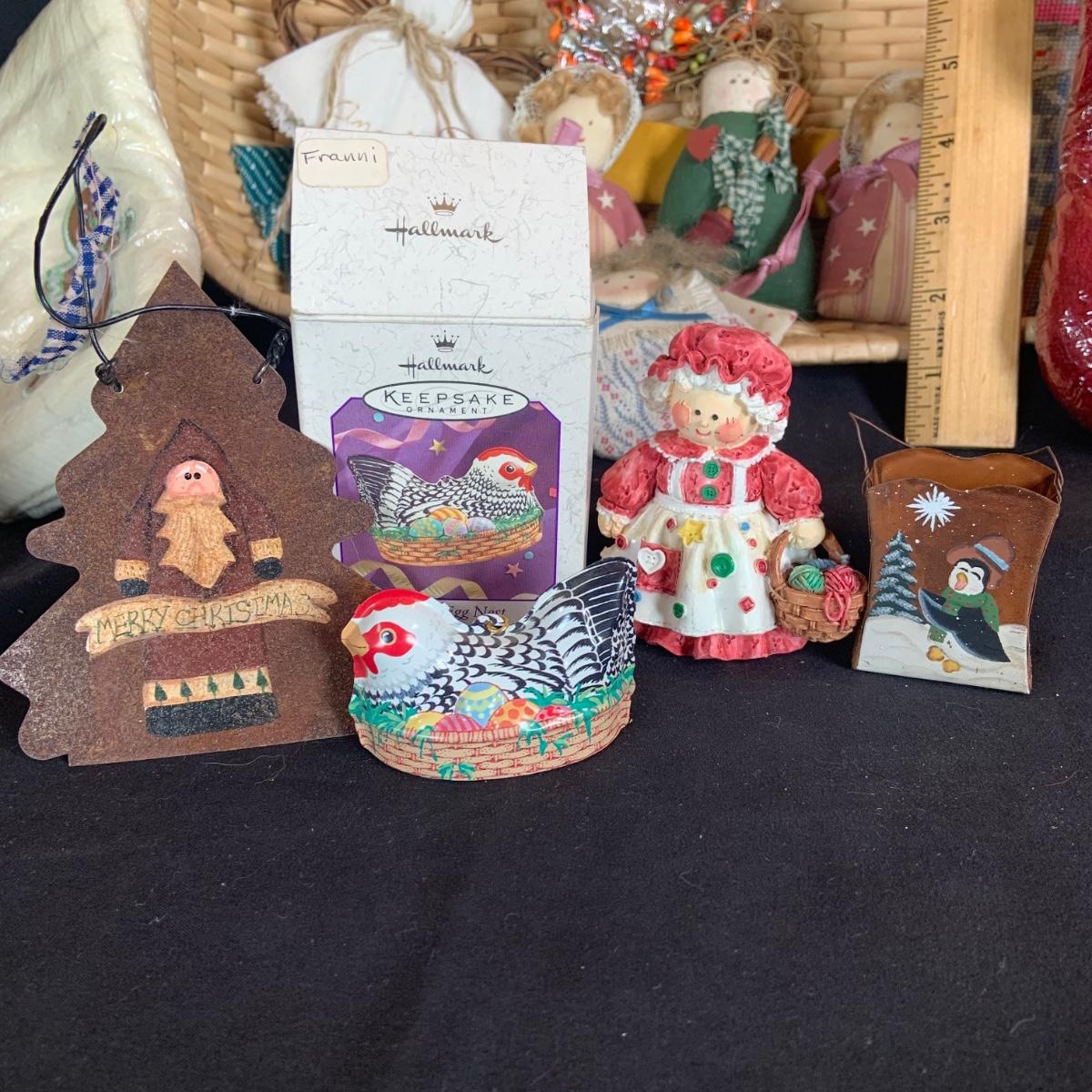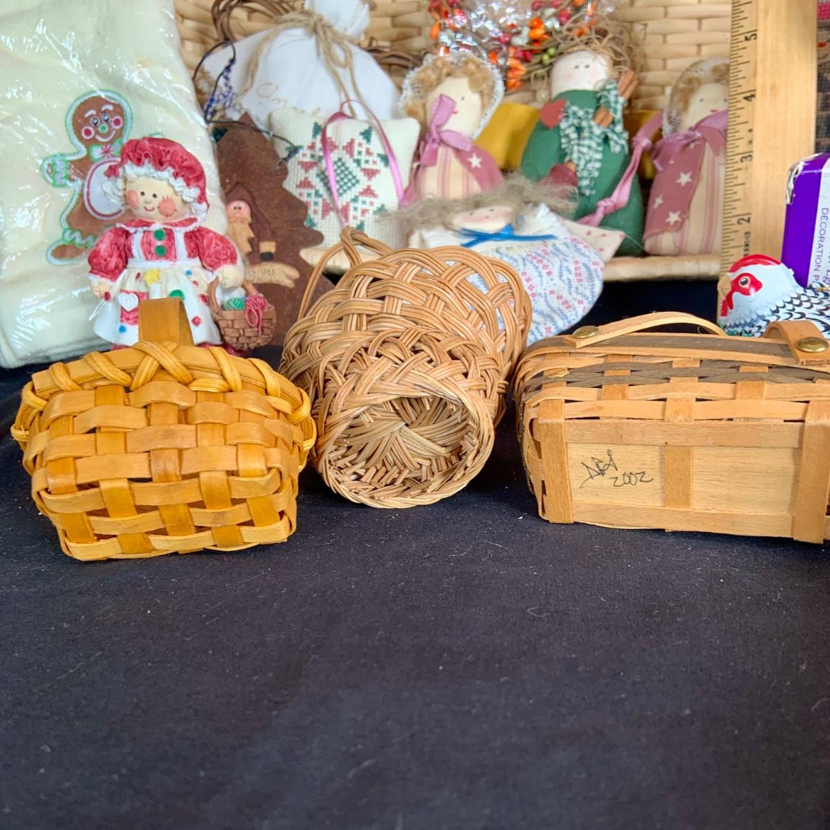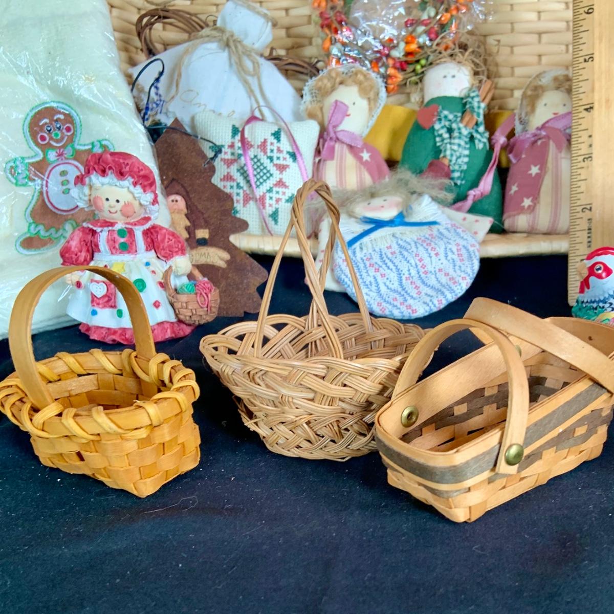 LOT:84: Basket Full of Christmas Mini Baskets, Rag Doll Ornaments, Hand Towl Bibs, Hallmark Chicken Ornament and More