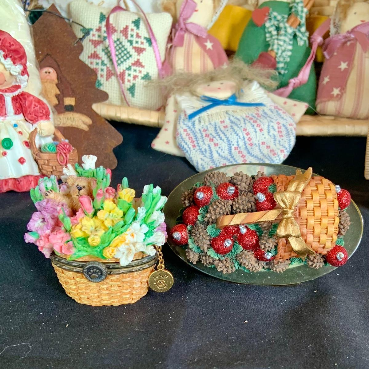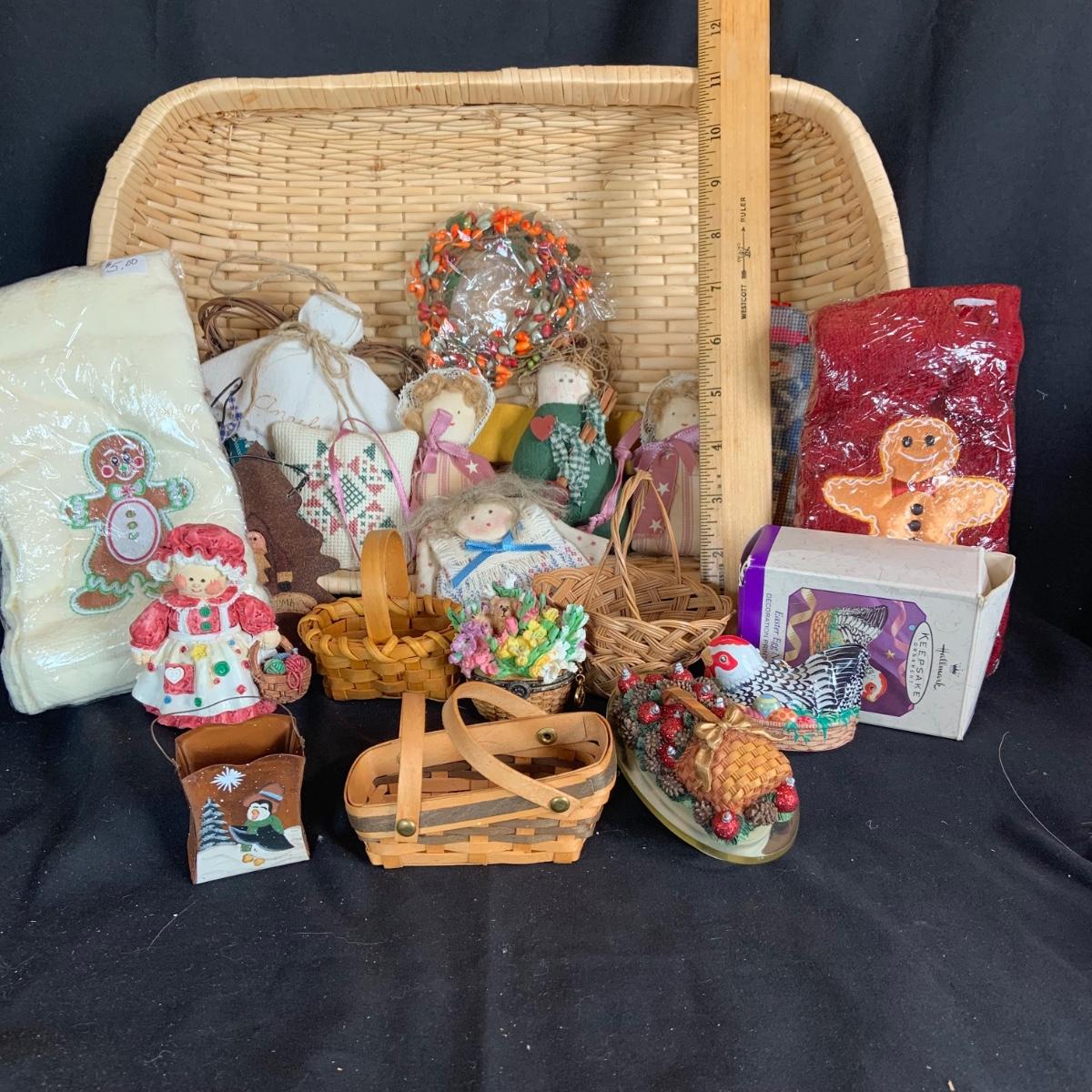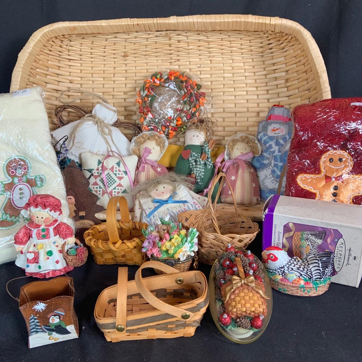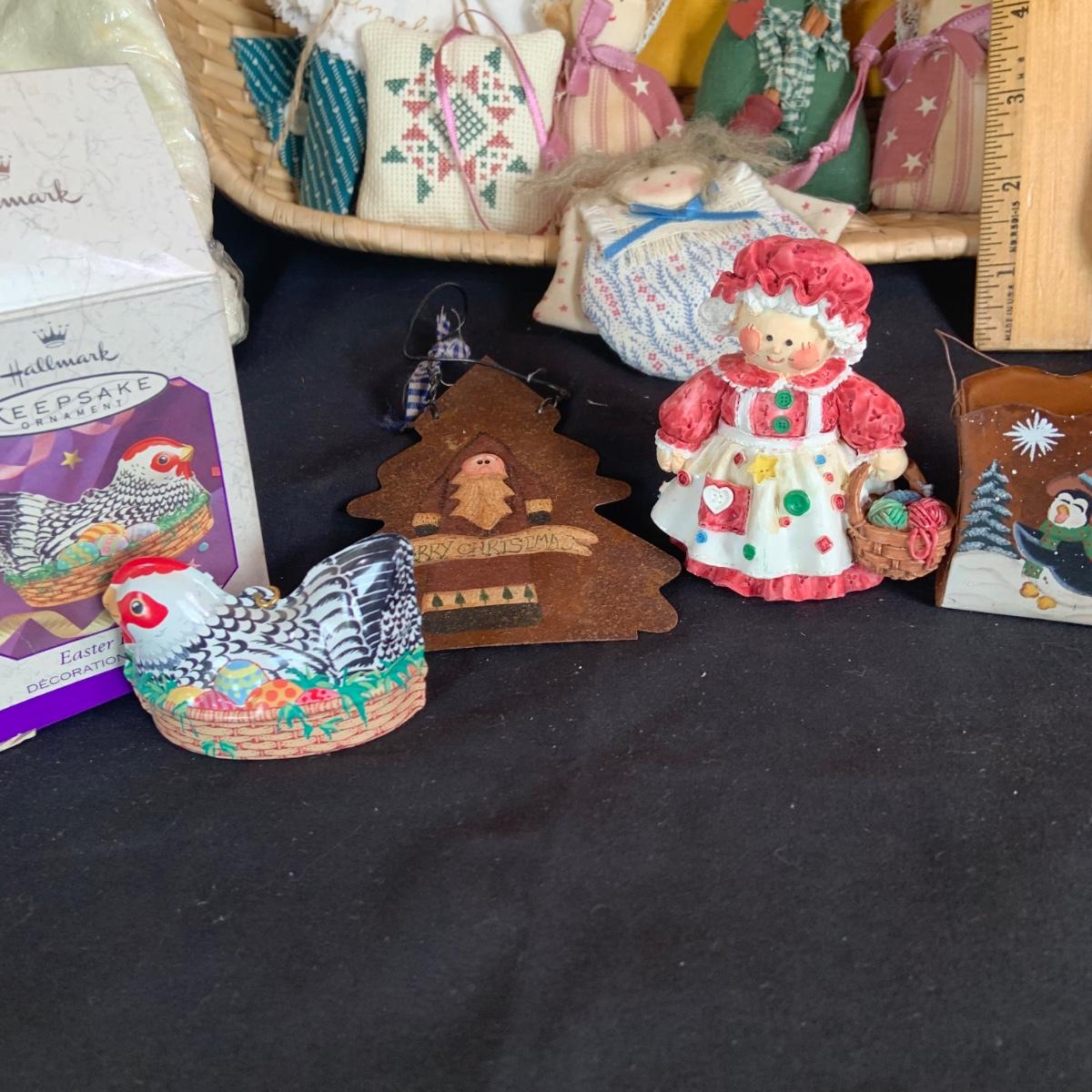 LOT:84: Basket Full of Christmas Mini Baskets, Rag Doll Ornaments, Hand Towl Bibs, Hallmark Chicken Ornament and More