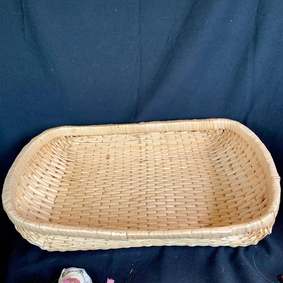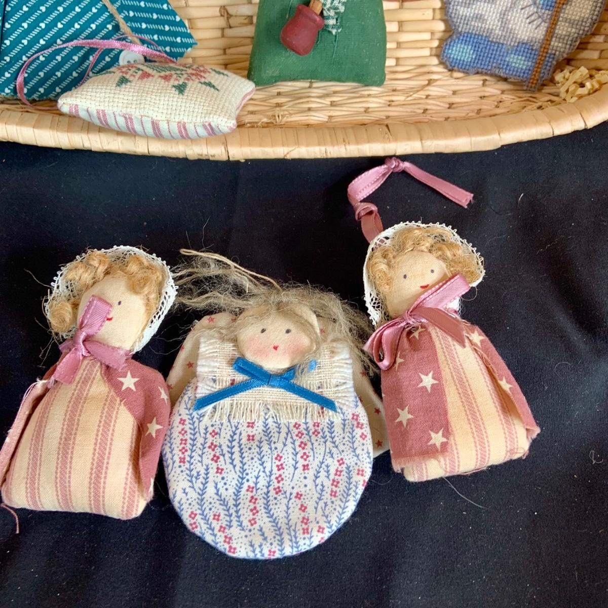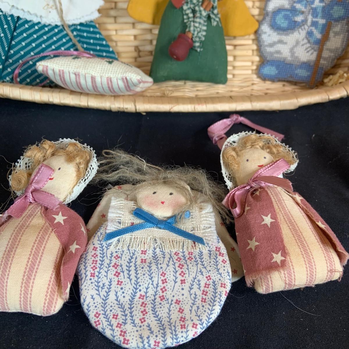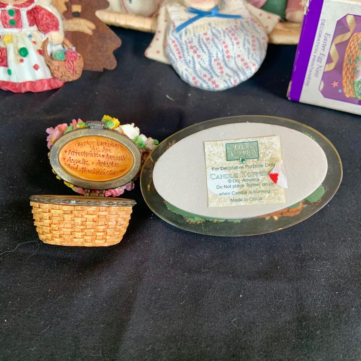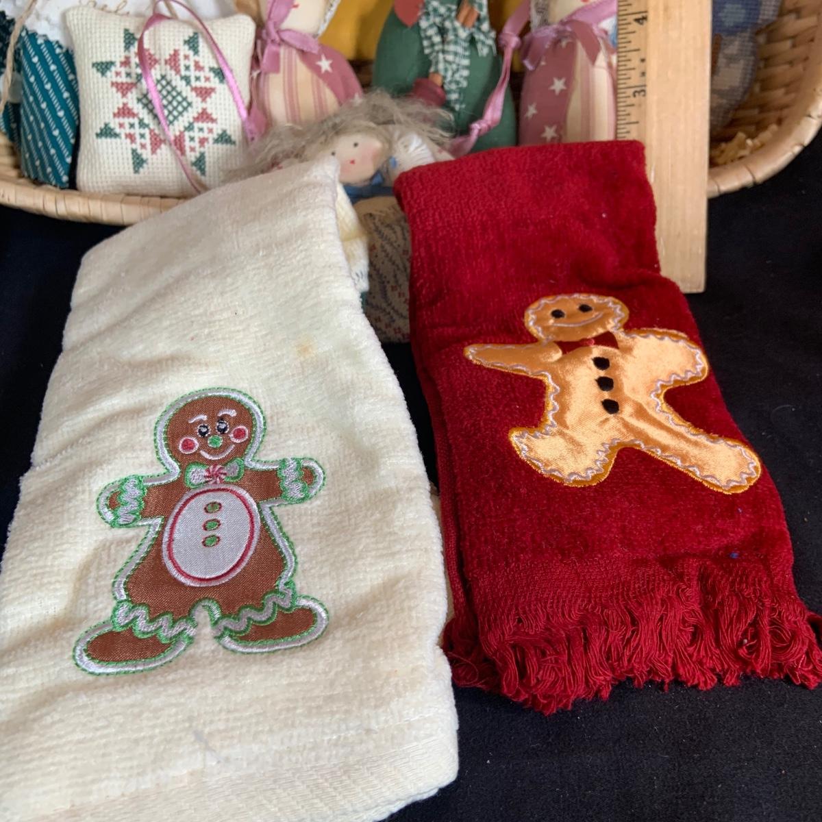 LOT:84: Basket Full of Christmas Mini Baskets, Rag Doll Ornaments, Hand Towl Bibs, Hallmark Chicken Ornament and More