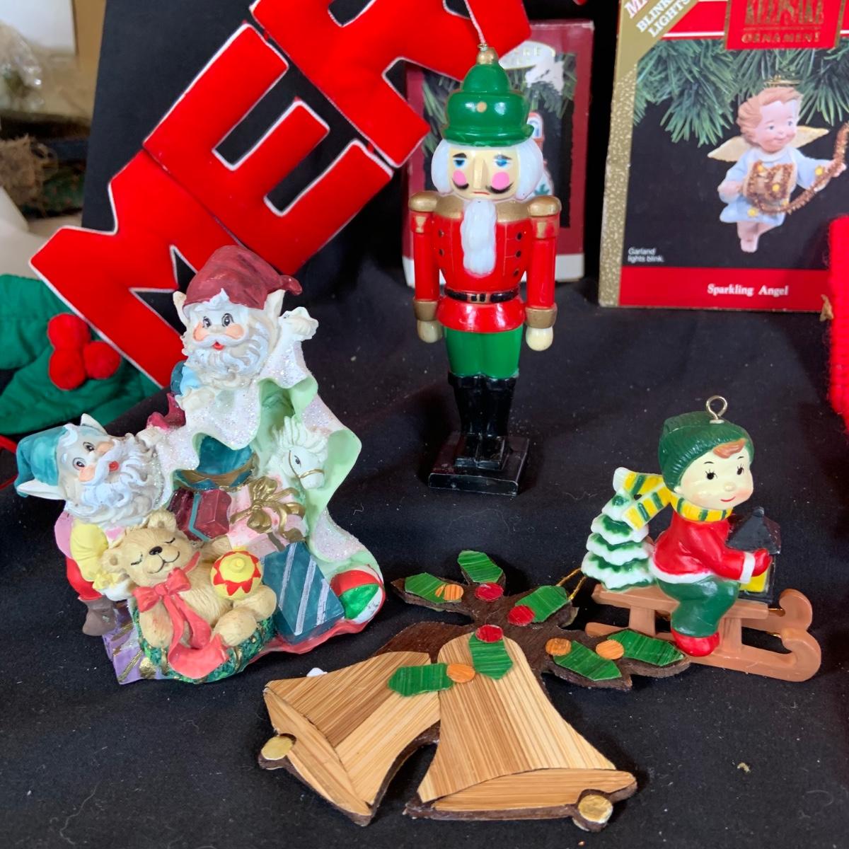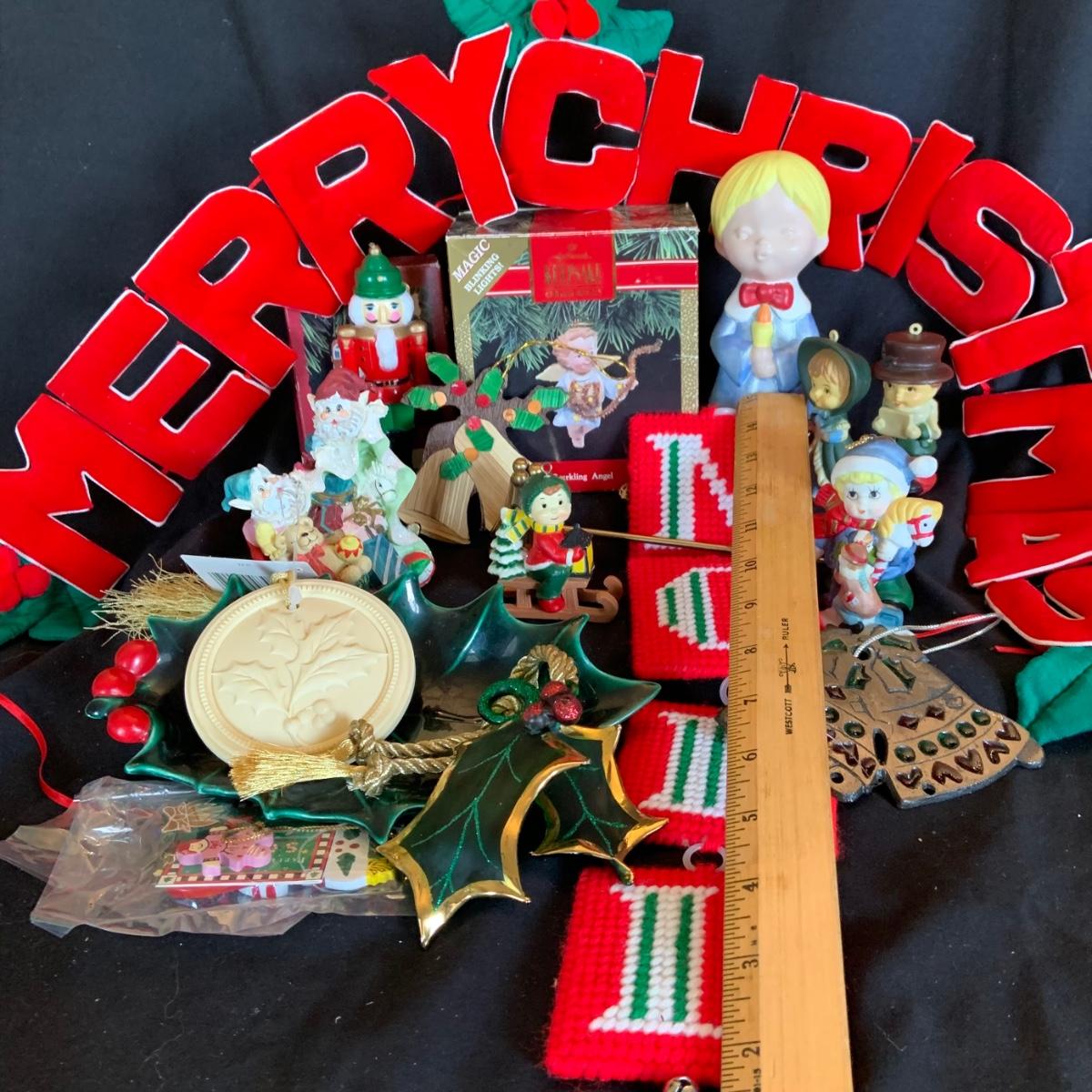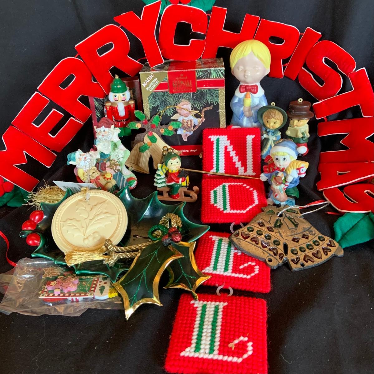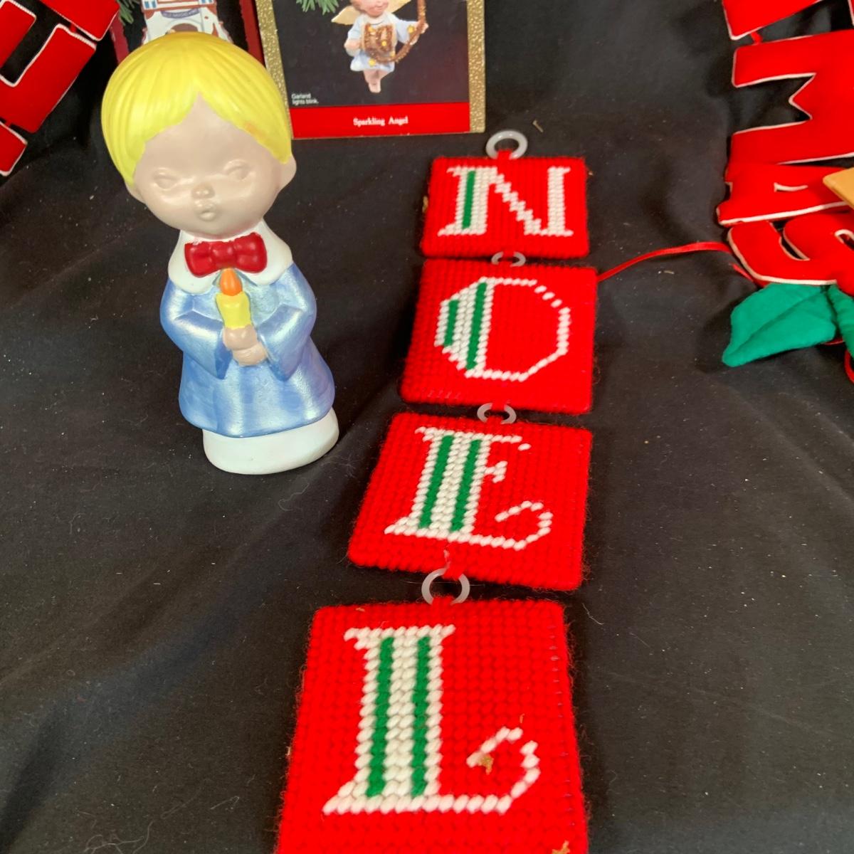 LOT:91: Vintage Holiday Decorations Including a Hallmark Ornament, Handmade Noel Plastic Canvas Sign, and More