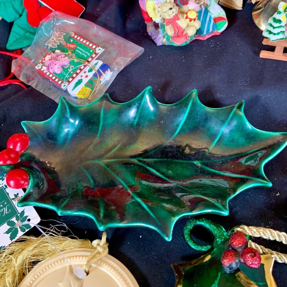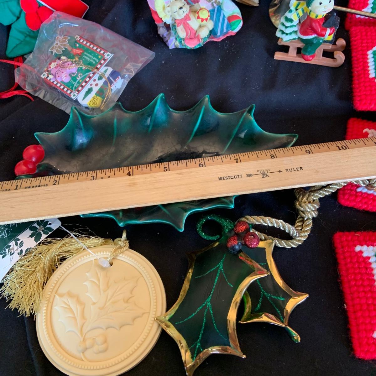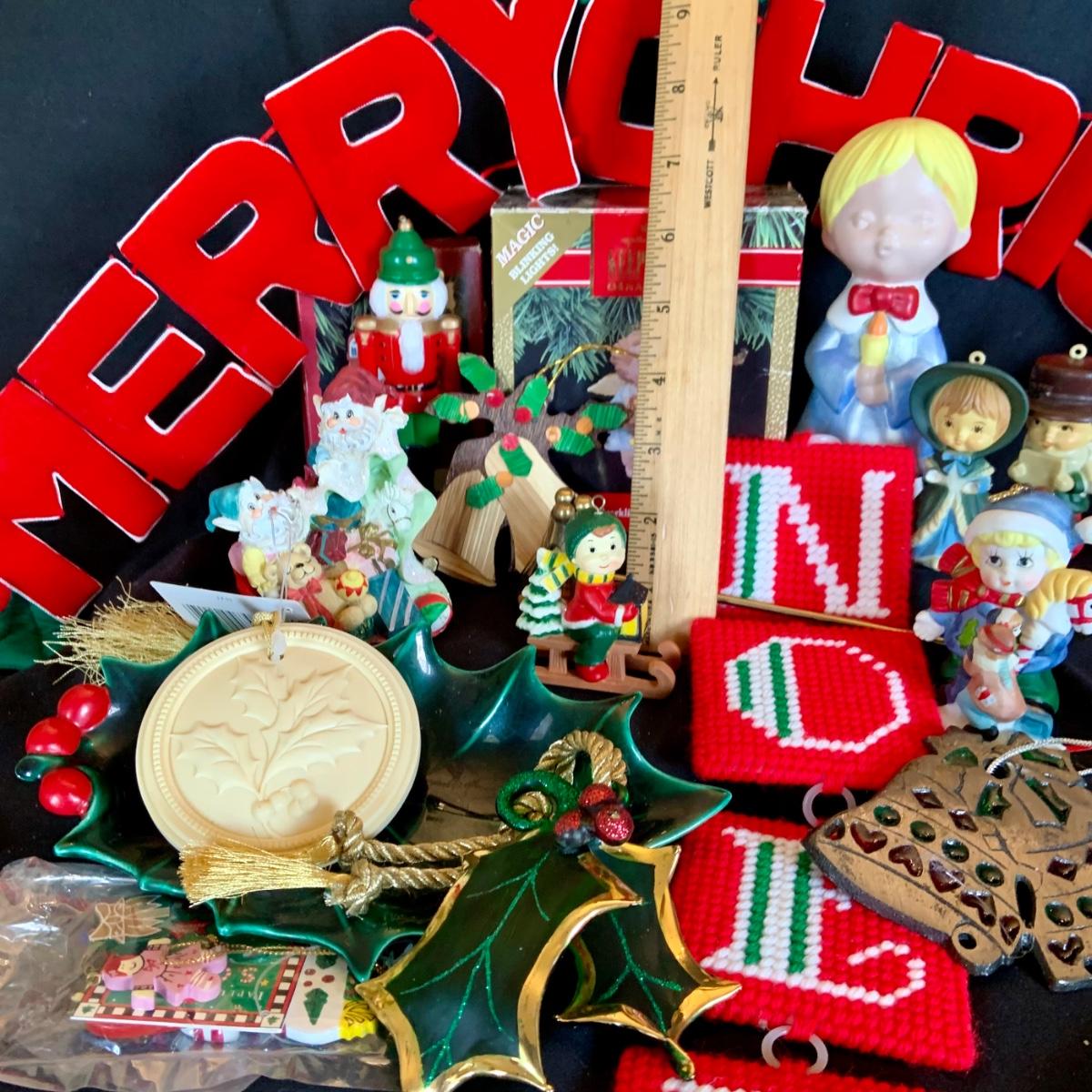 LOT:91: Vintage Holiday Decorations Including a Hallmark Ornament, Handmade Noel Plastic Canvas Sign, and More