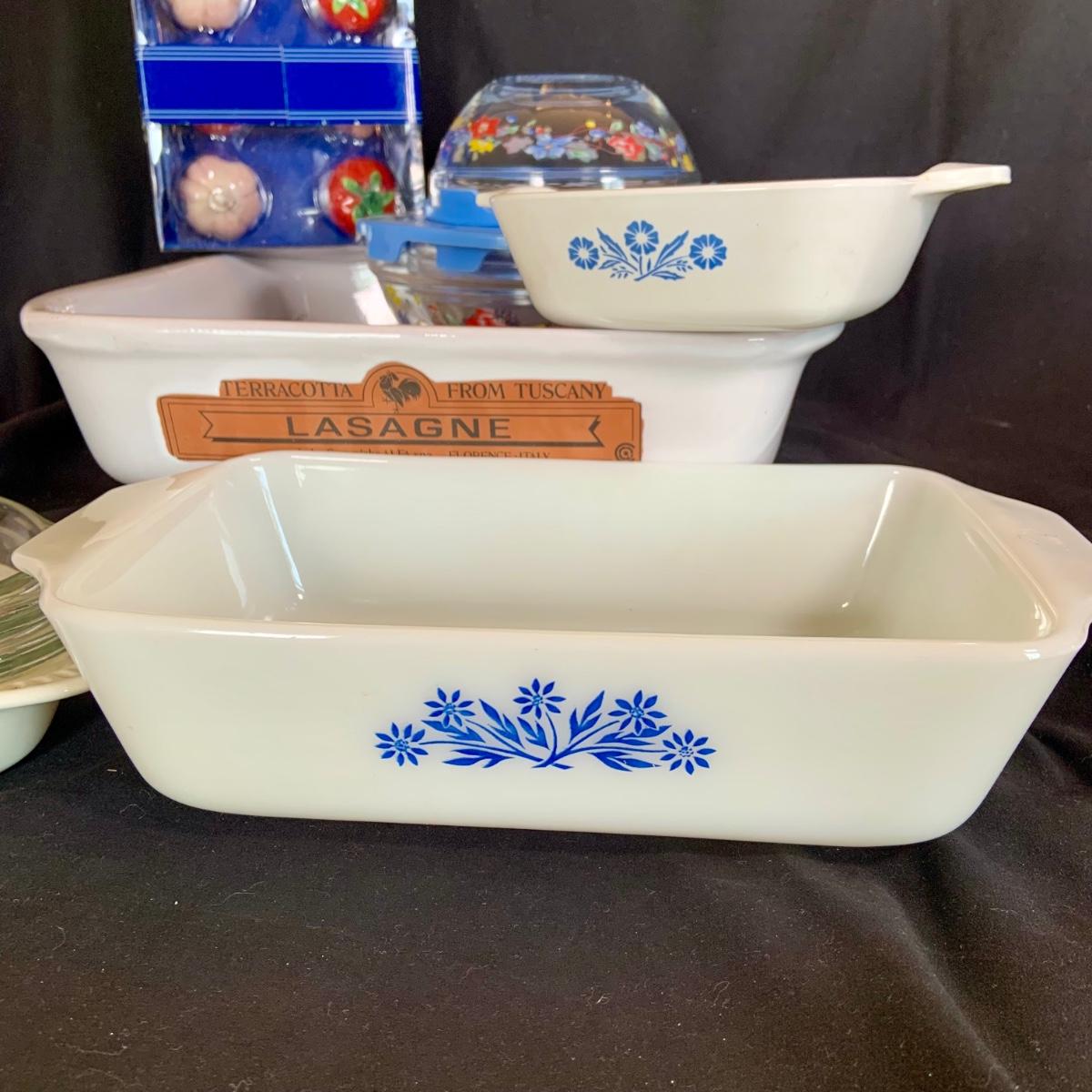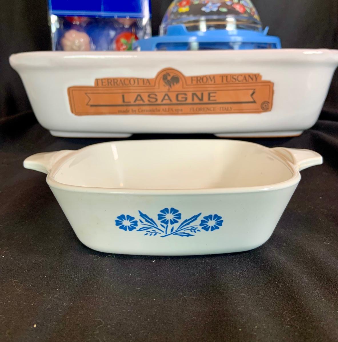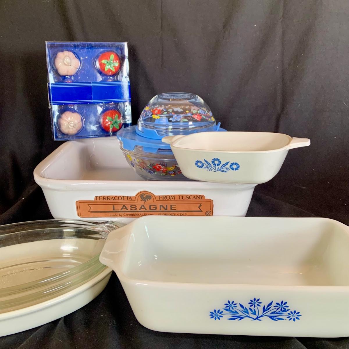 Lot:95: Kitchen Collection of Baking Dishing and More Featuring Corningware, Anchor Hocking, Tarracotta Lasagne Dish and More