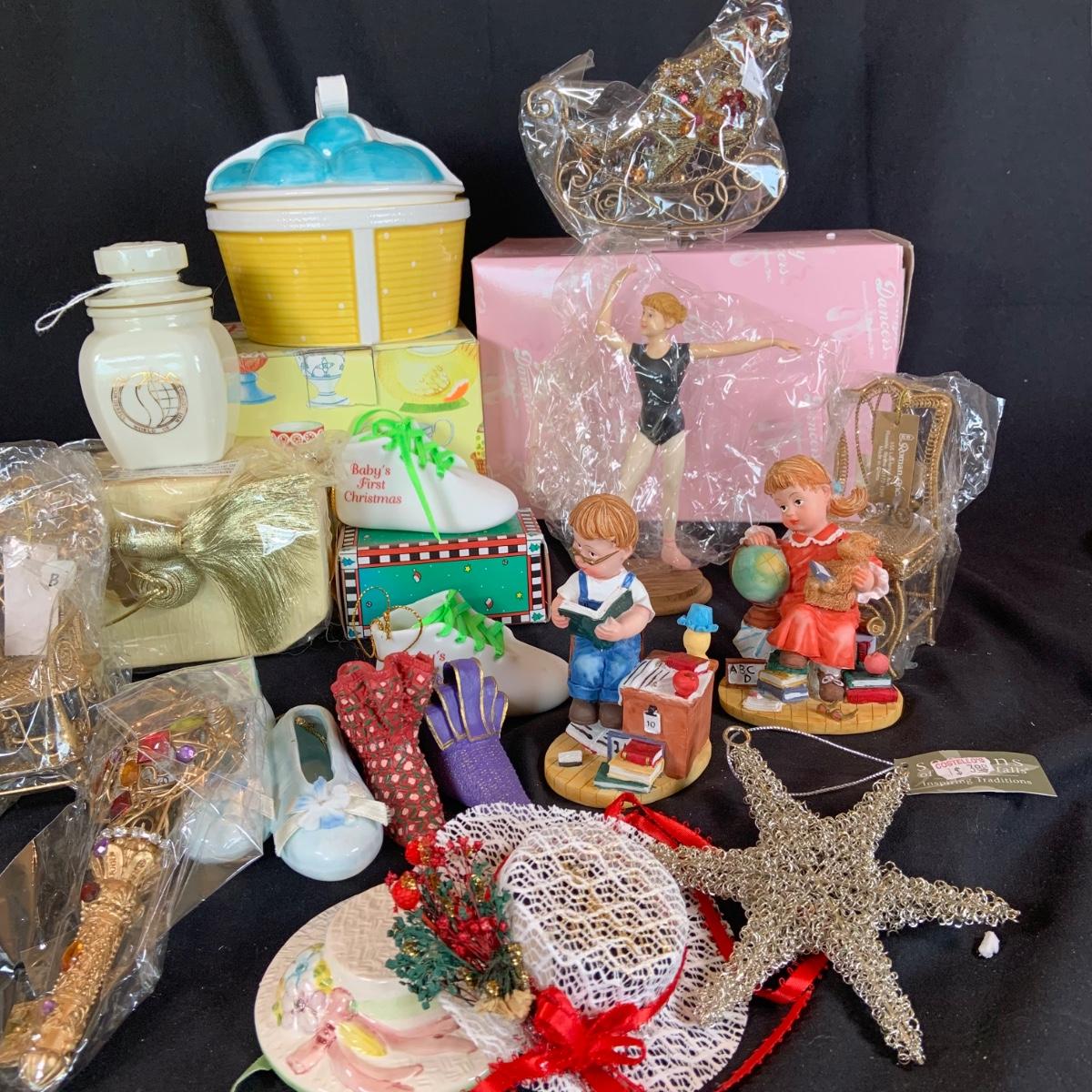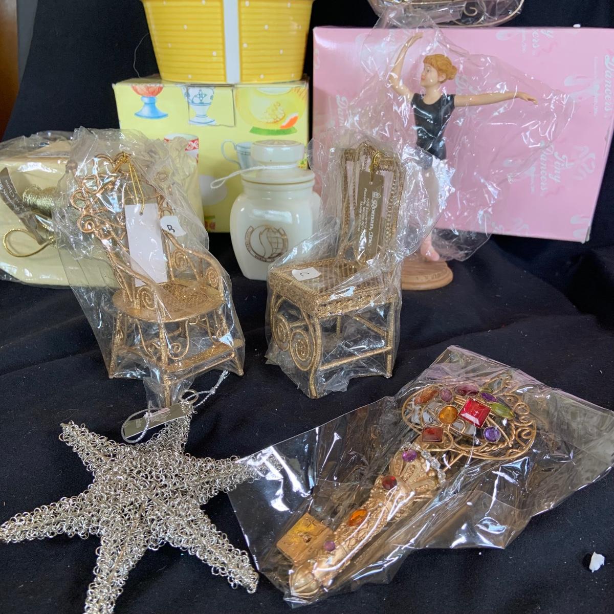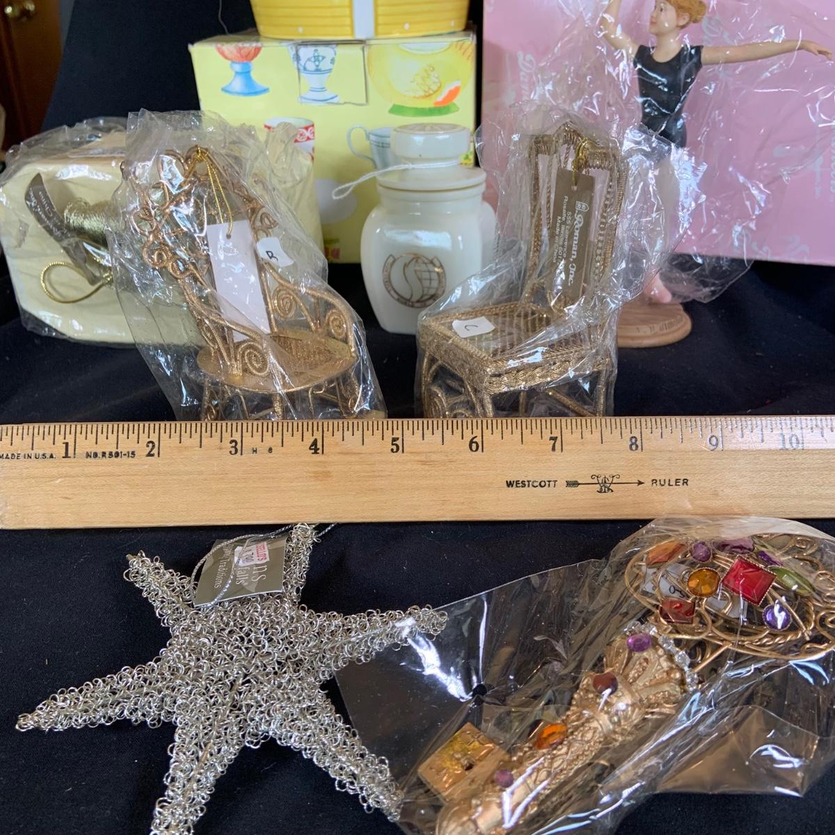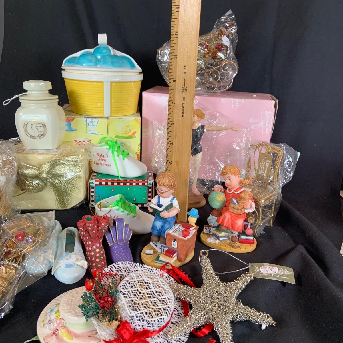 LOT:93: Weatonwear Ginger Jar, Dept 56 Covered Dish Decorative Shoes and Hats, Doll Chairs,Figurines and More