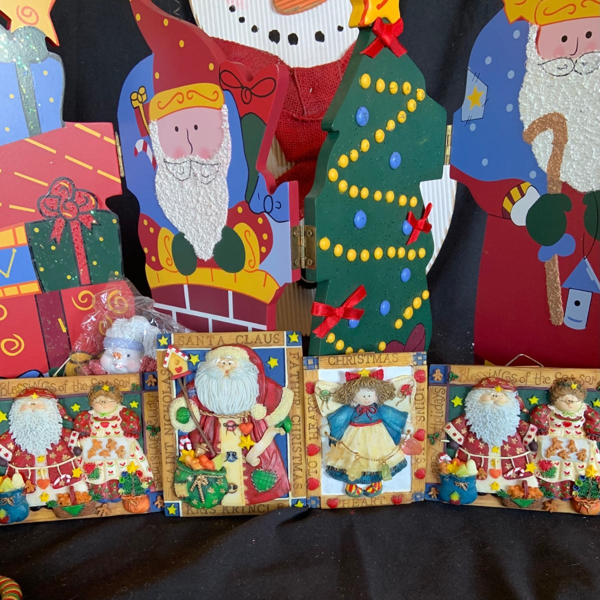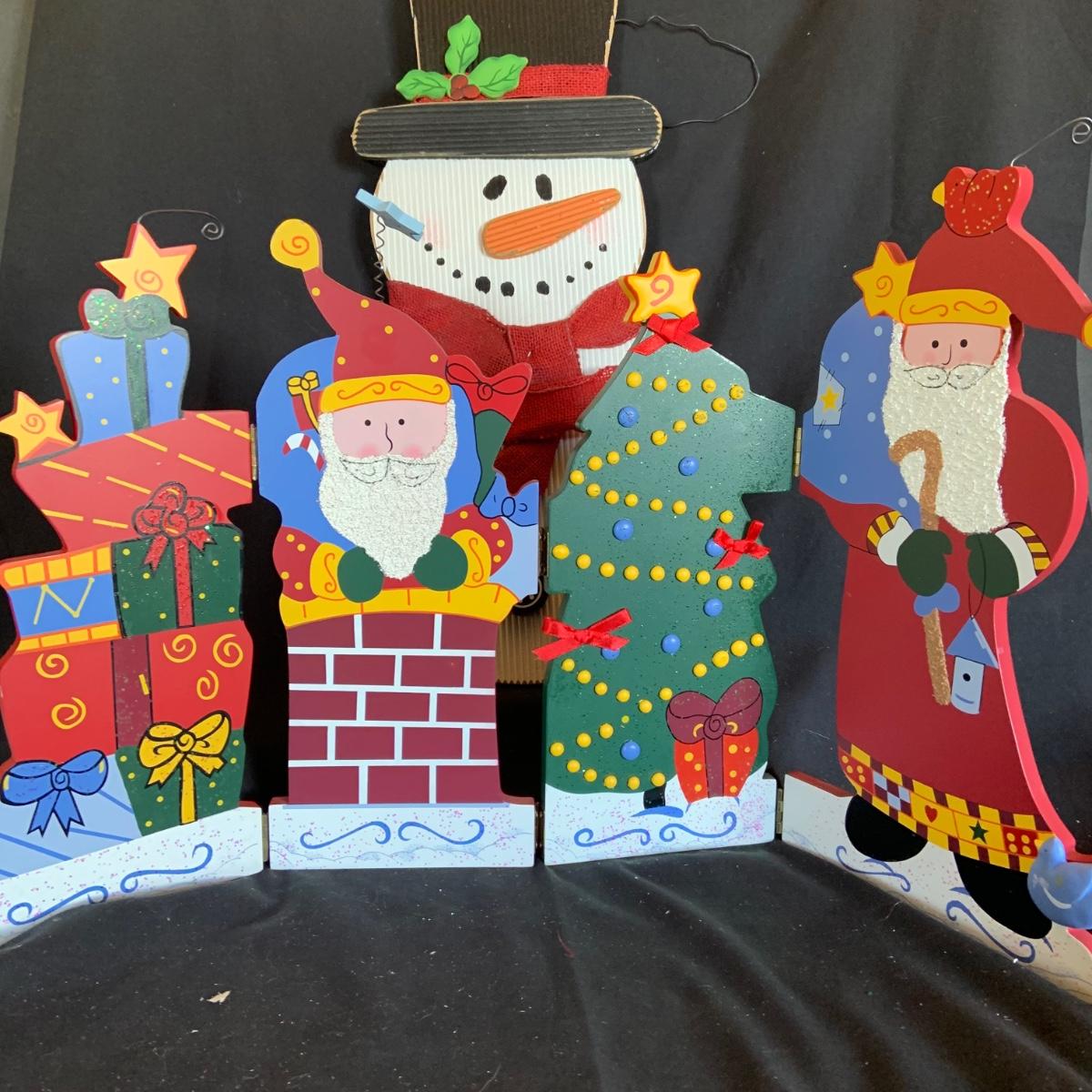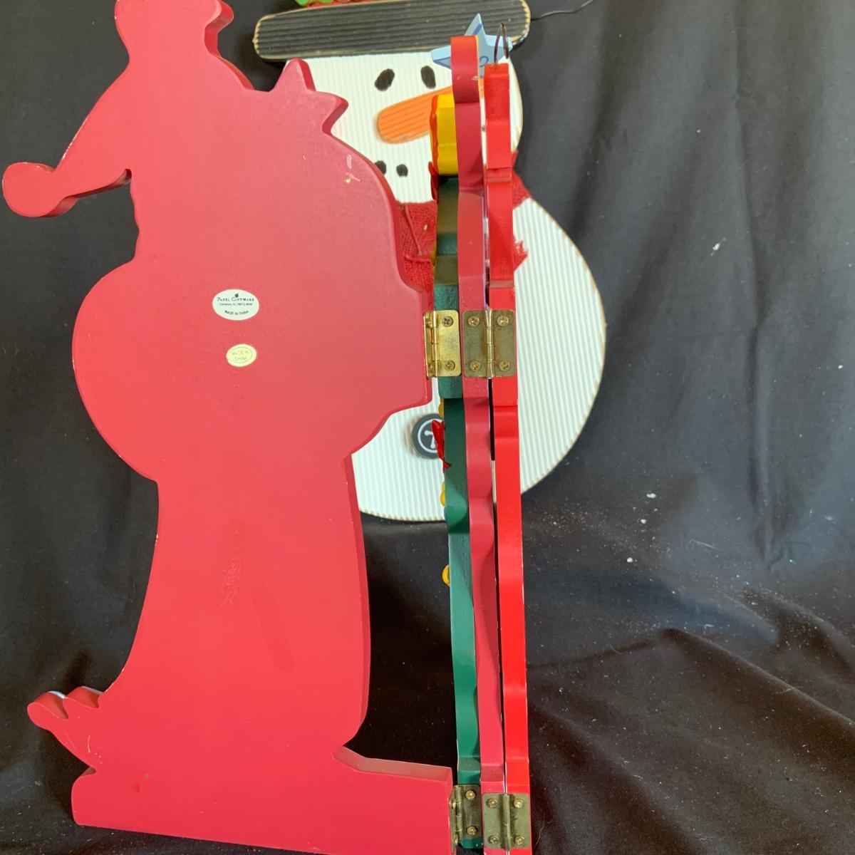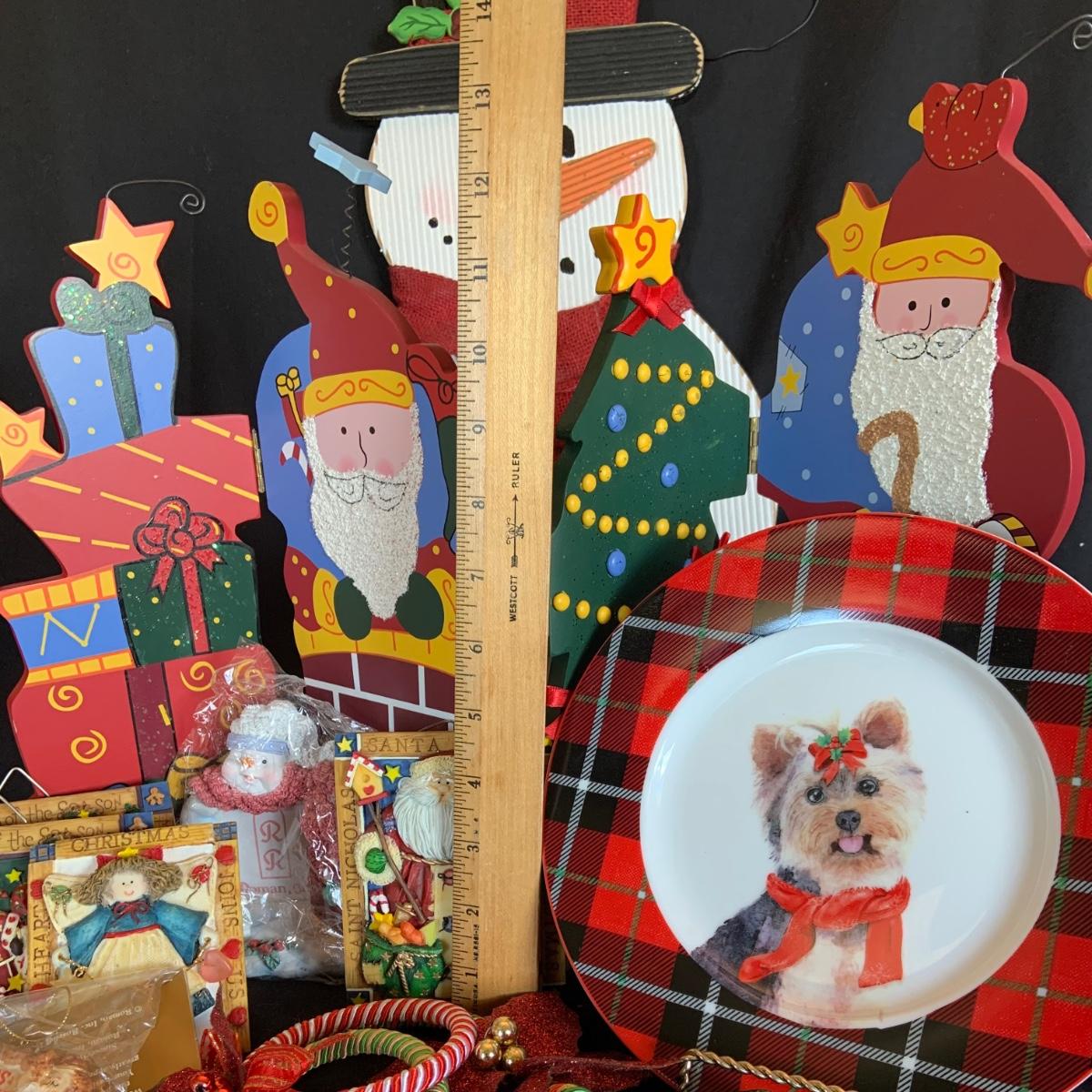 LOT:102: Adorable Christmas Dog Plate, Wooden Folding Santa Decoration, Large Snowmen and Other Holiday Decor