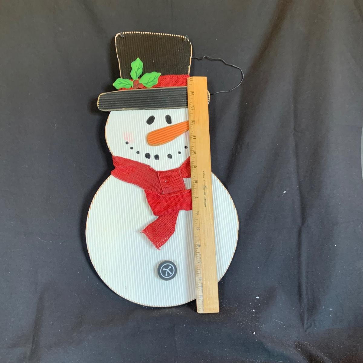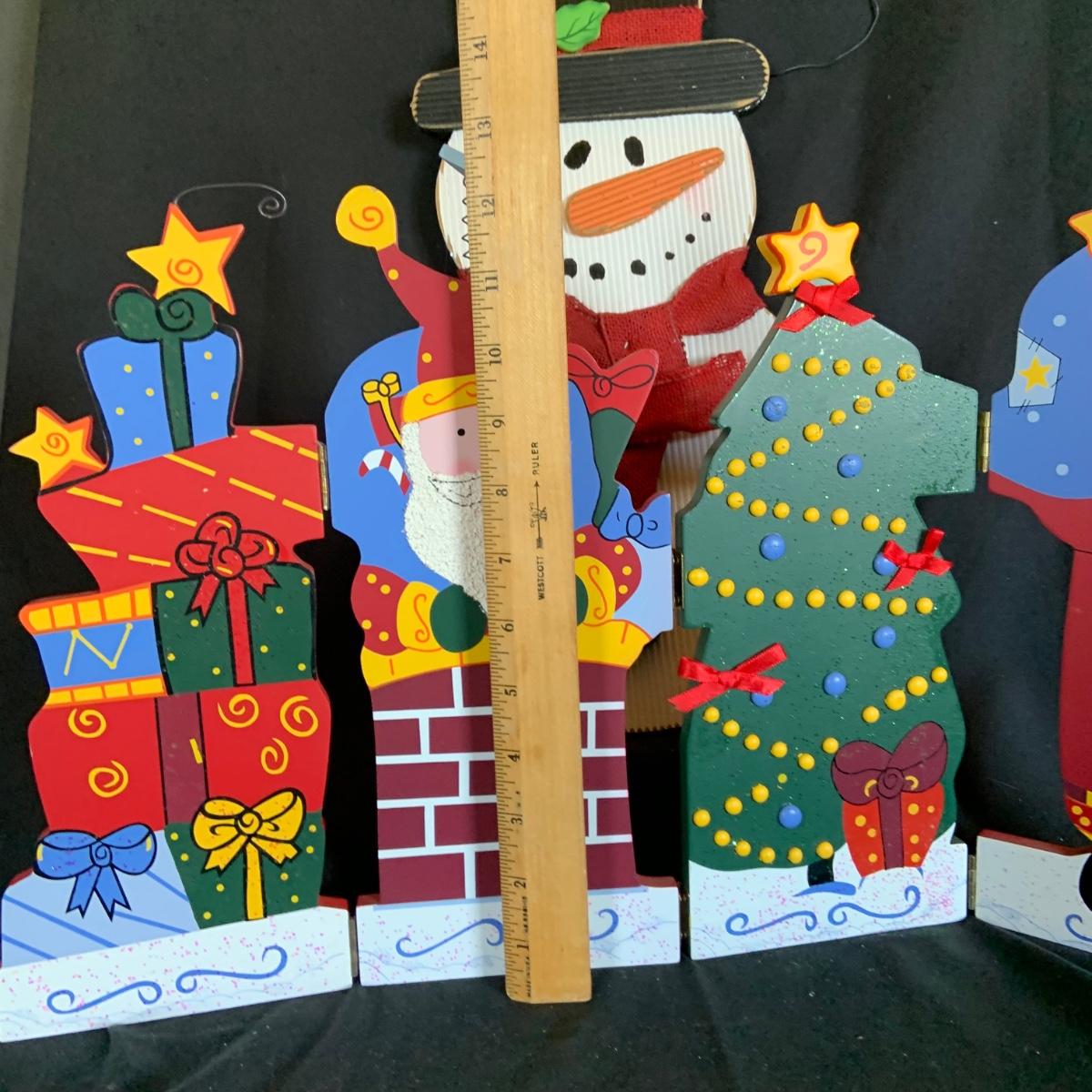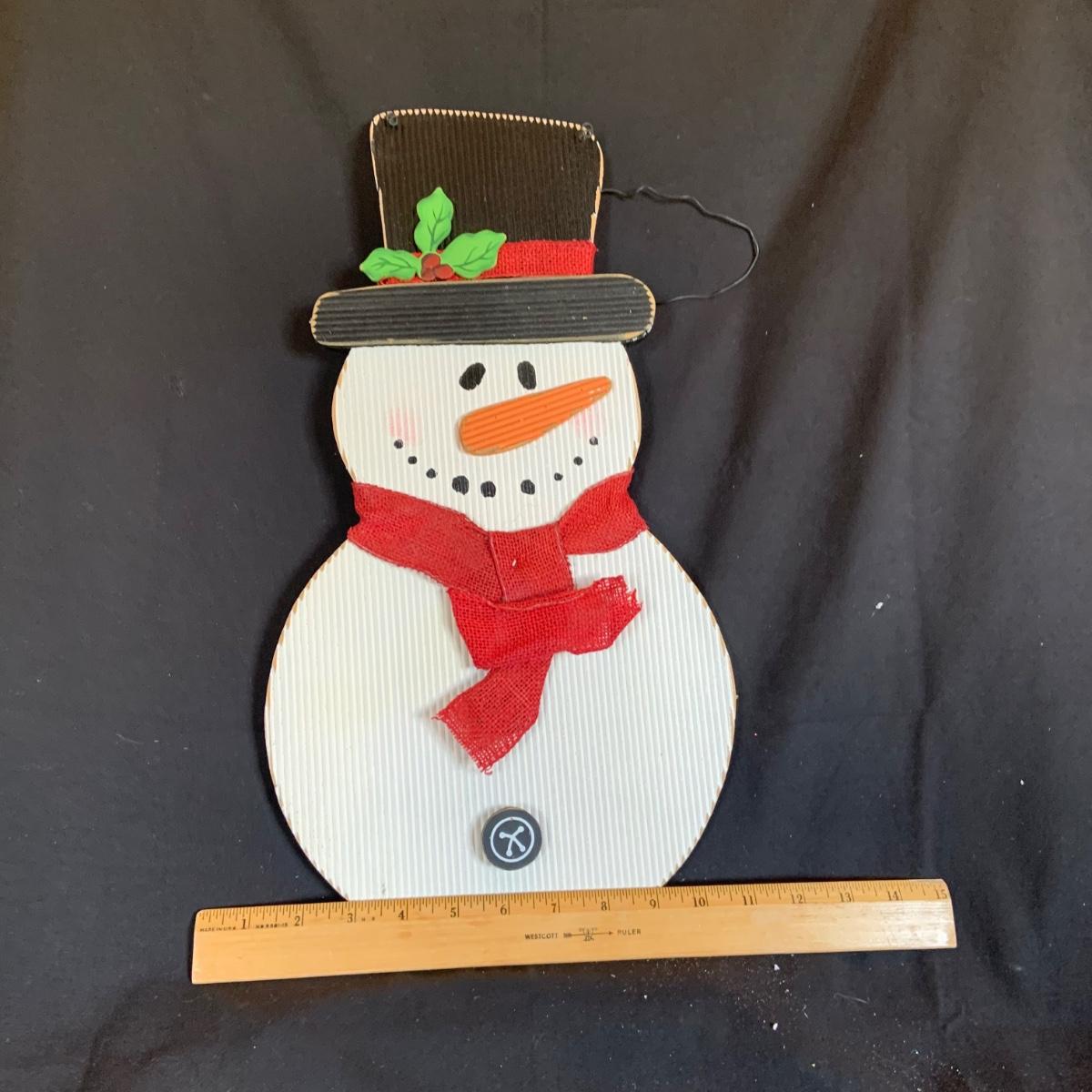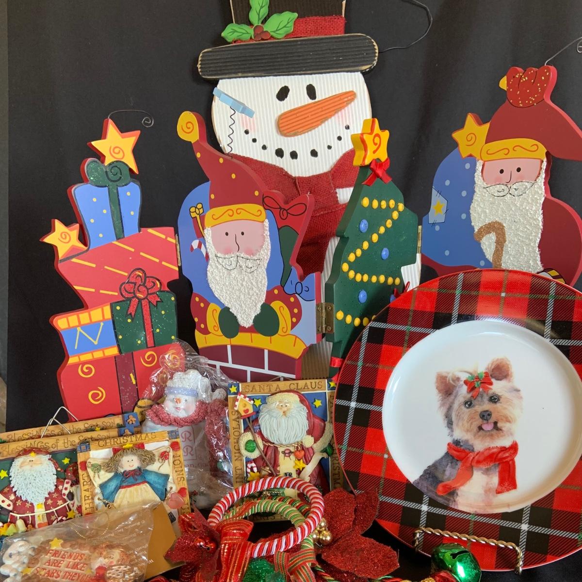 LOT:102: Adorable Christmas Dog Plate, Wooden Folding Santa Decoration, Large Snowmen and Other Holiday Decor