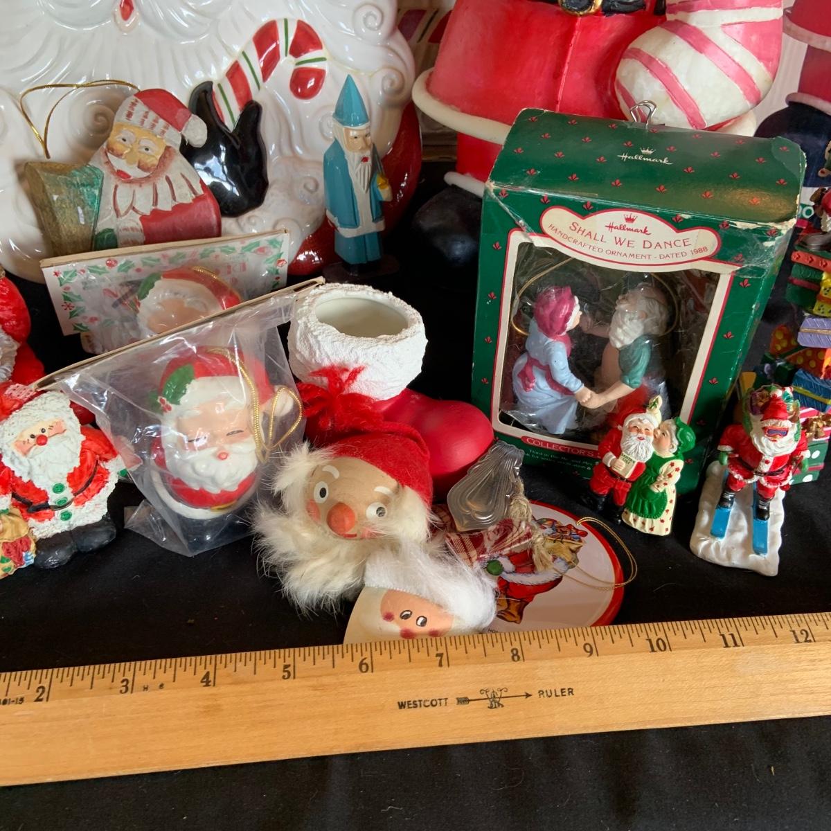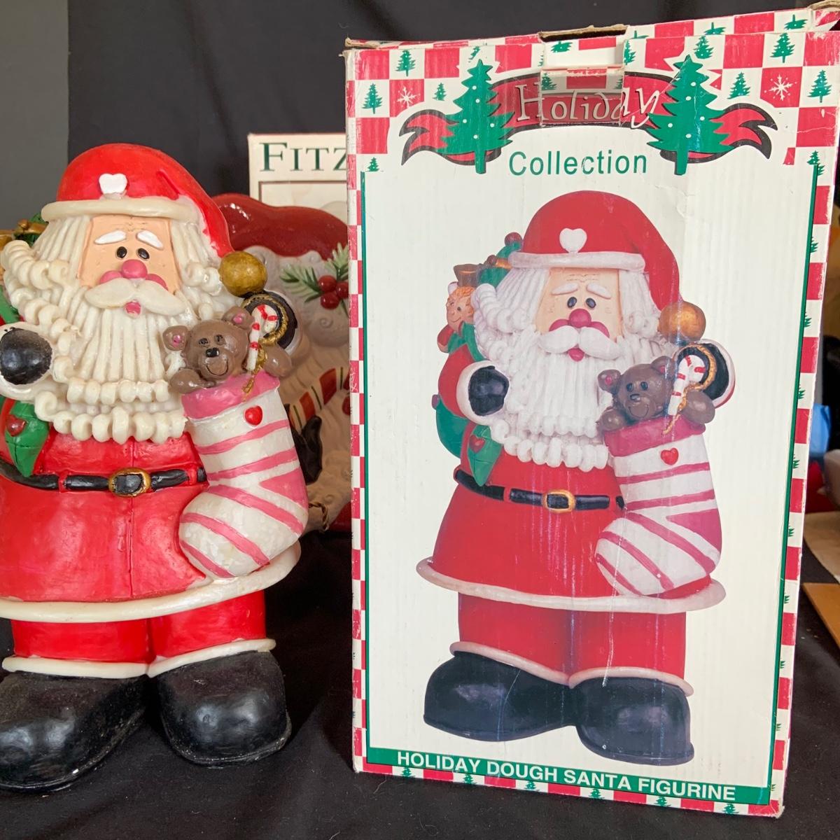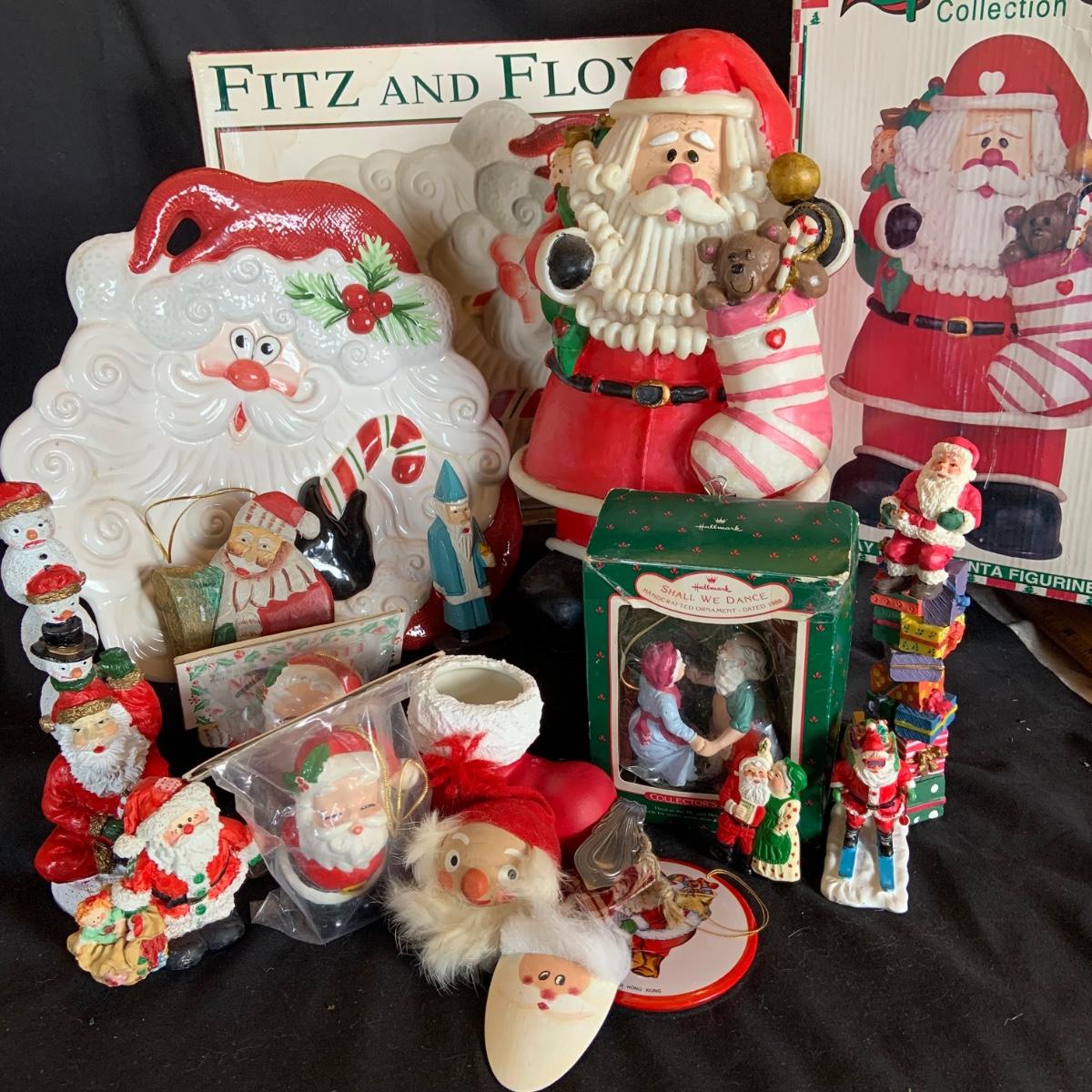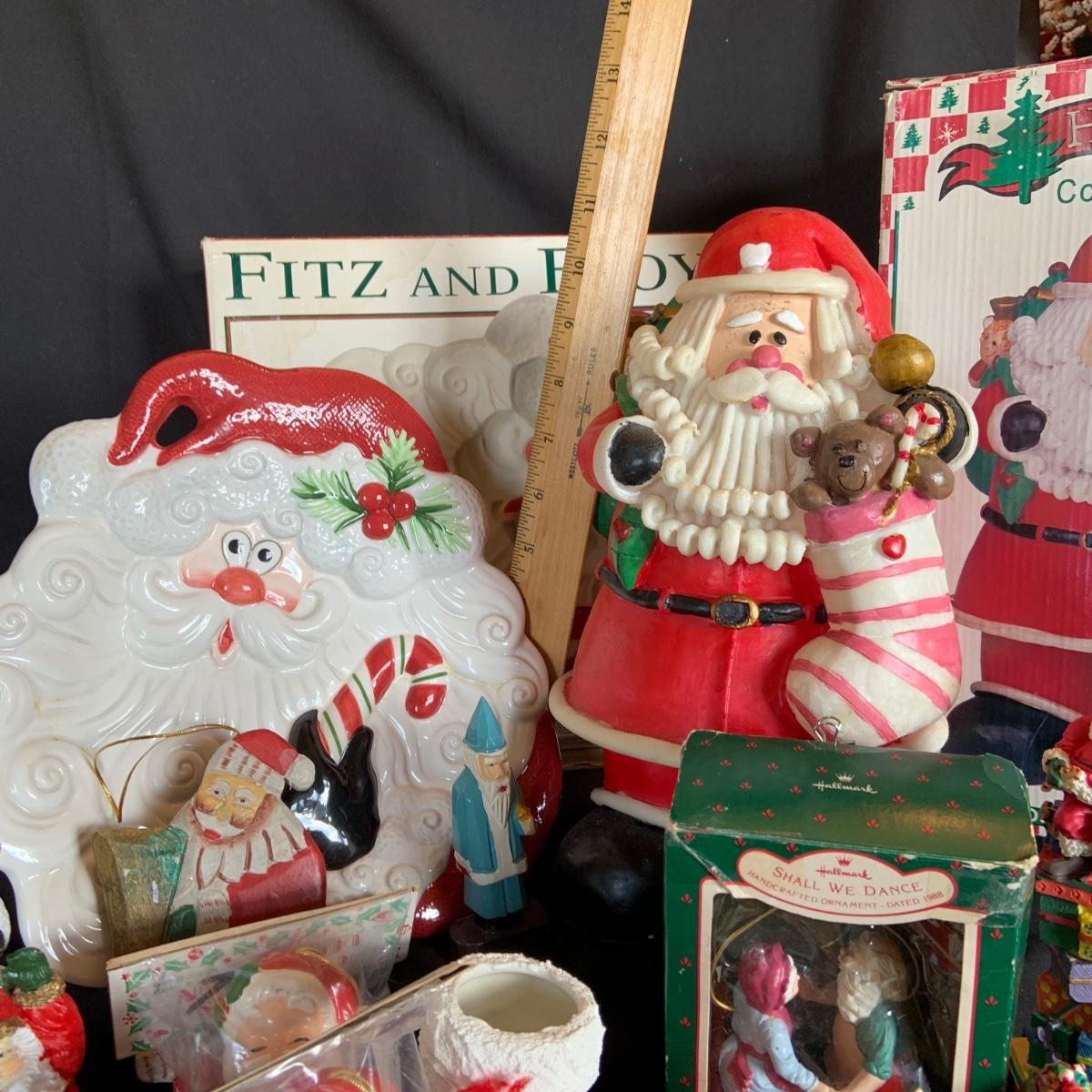 LOT:106: Fitz & Floyd, Santa Plate and Other Santa Holiday Decorations and Vintage Ornaments, Large Dough Santa Figurine and More
