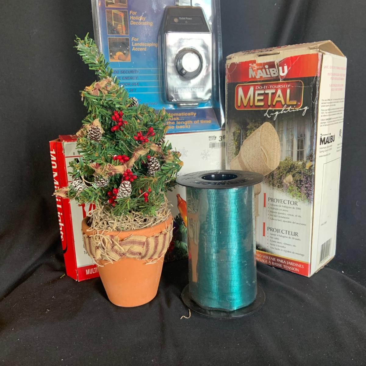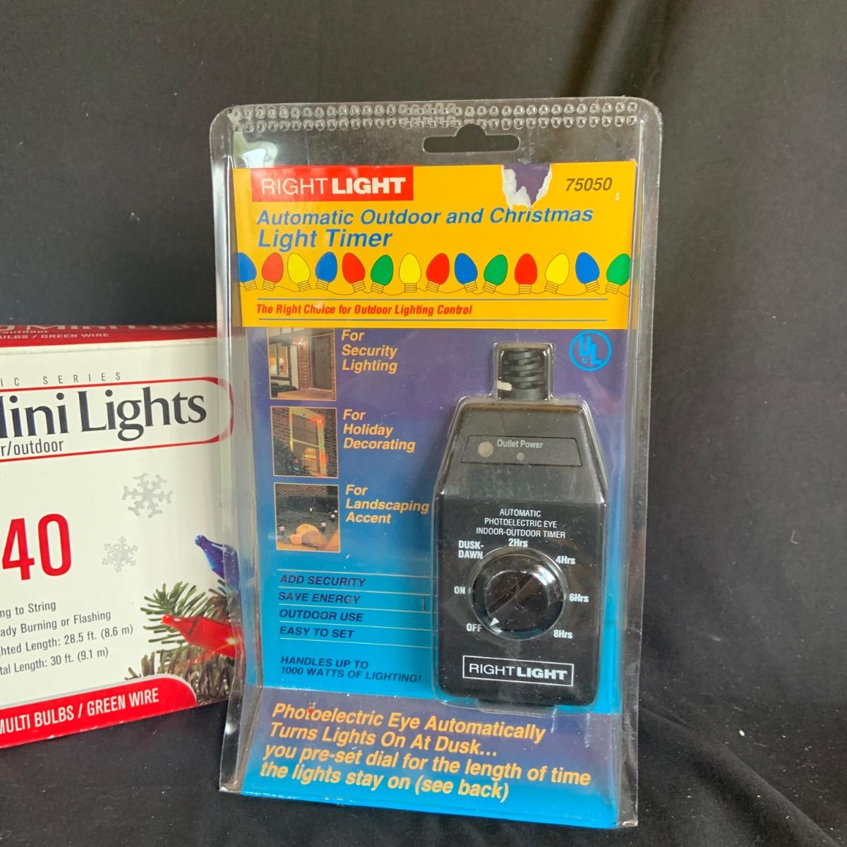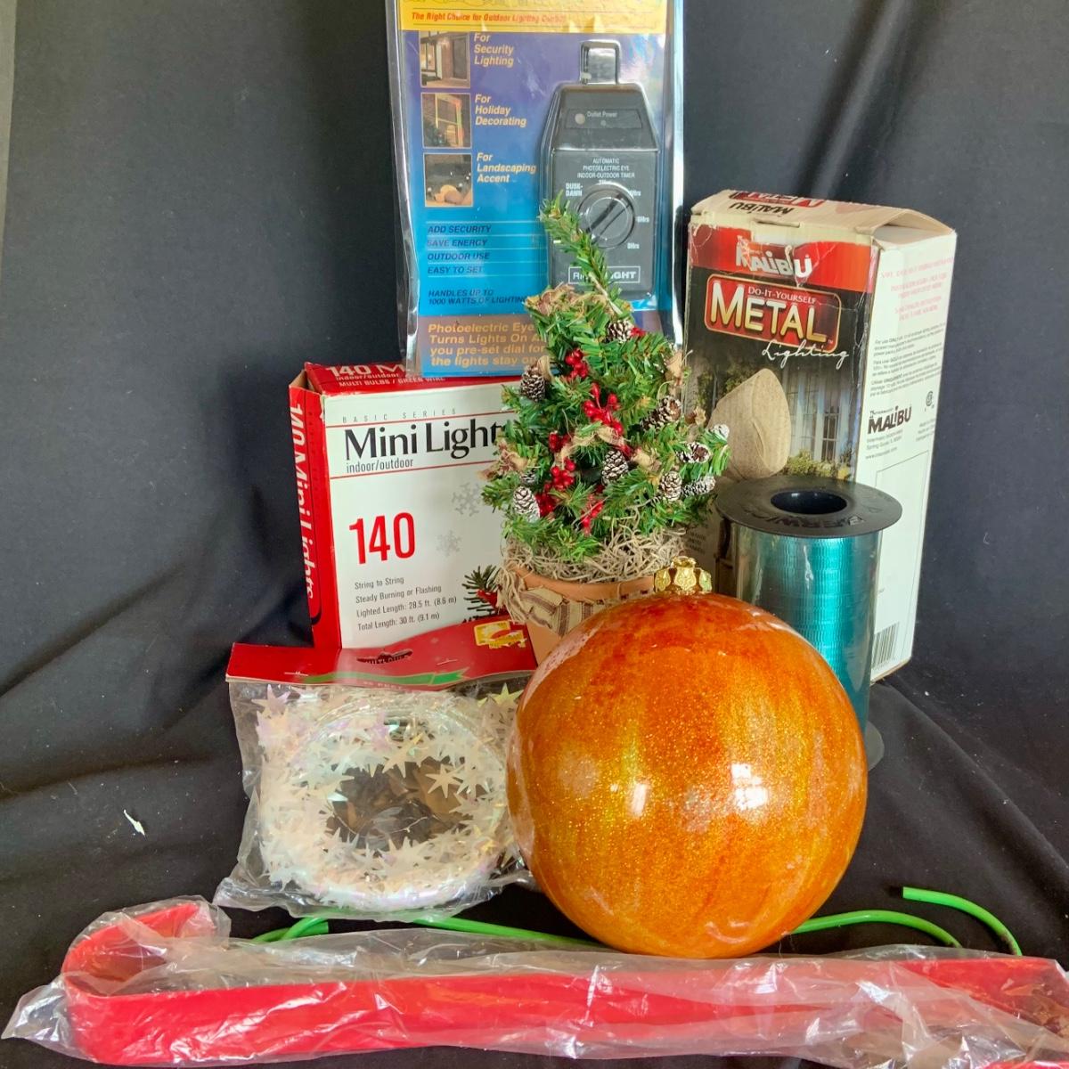 LOT:114: Holiday Indoor/Outdoor Decorations Including Mini Lights, Light Timer, Spot Light Wreath Hanger, and More